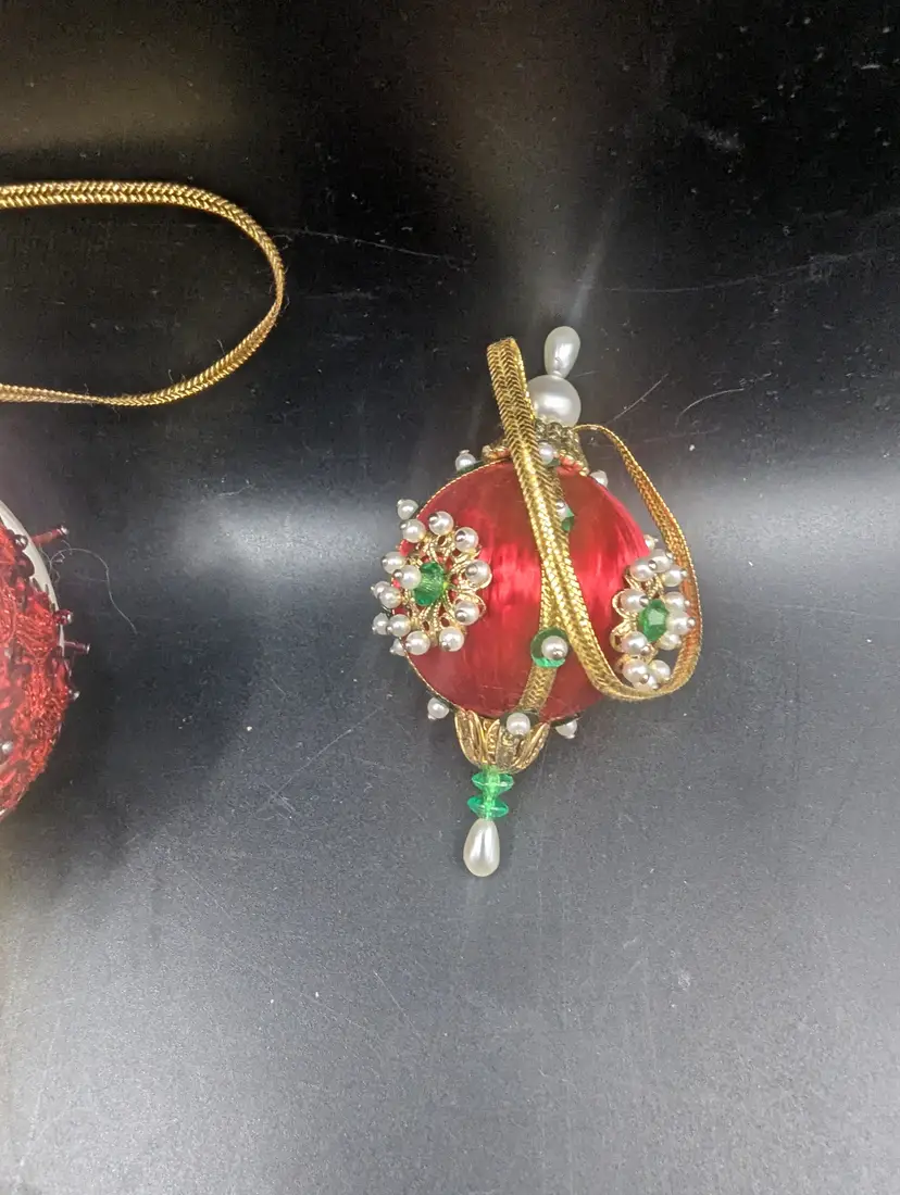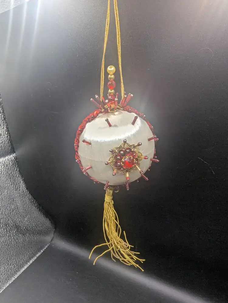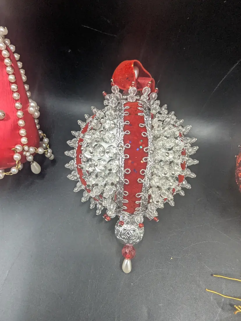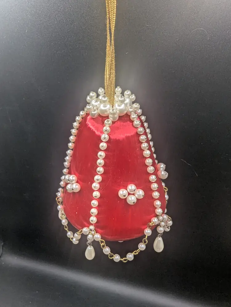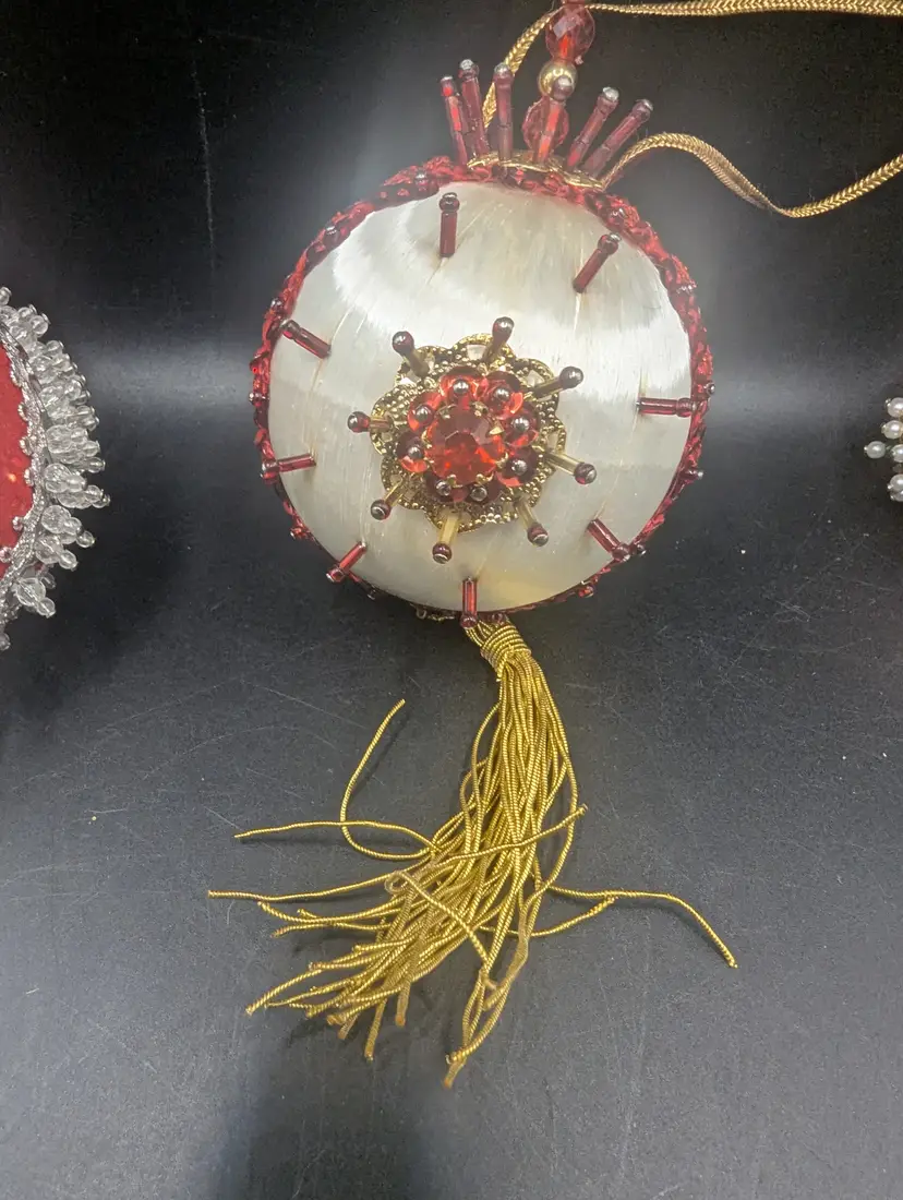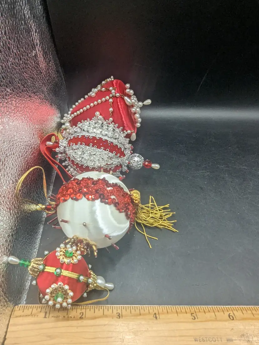 This is a lovely Vintage Lot of 4 Beaded and Sequined Push Pin Handmade Ornaments. They each have their own unique design and are all different in size and shape. They are all in excellent used condition except the white satin one has some discoloration on the satin. Please see all pictures for condition and measurements and details.