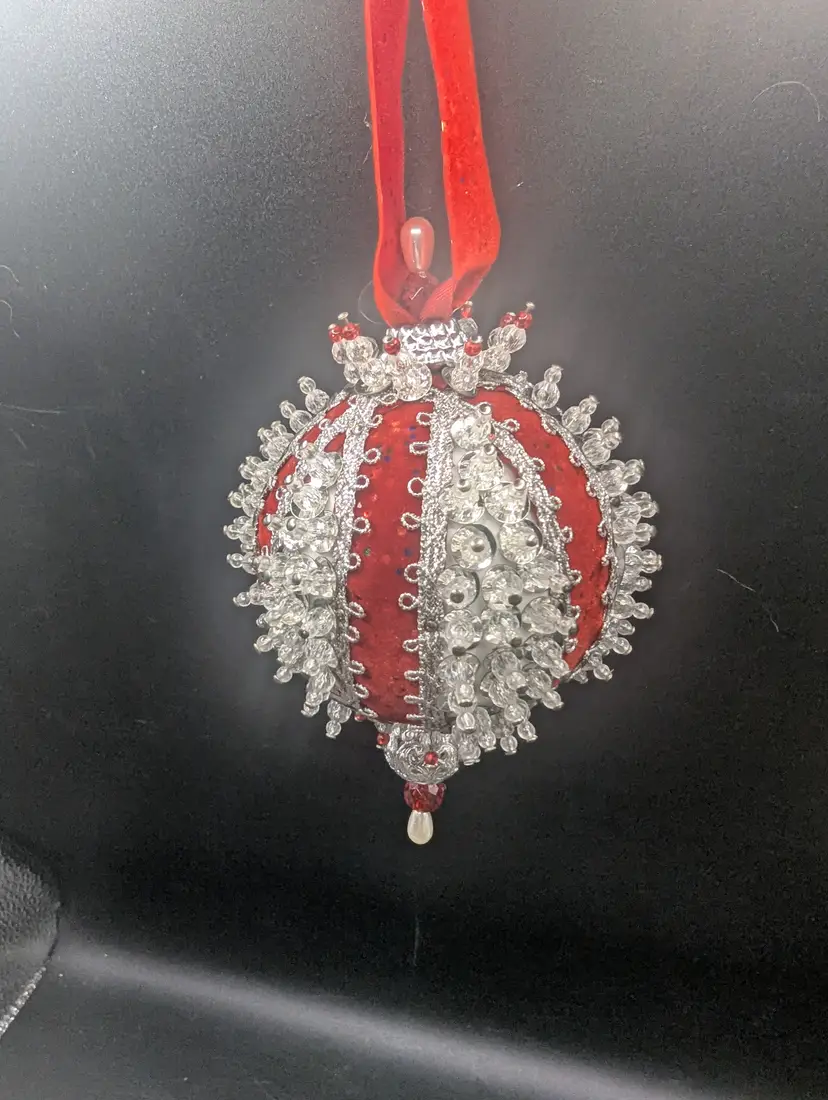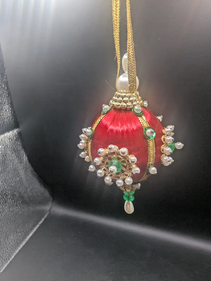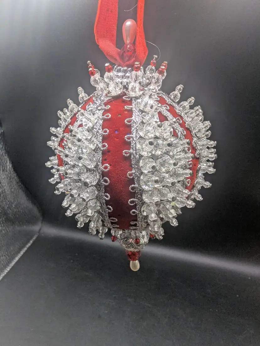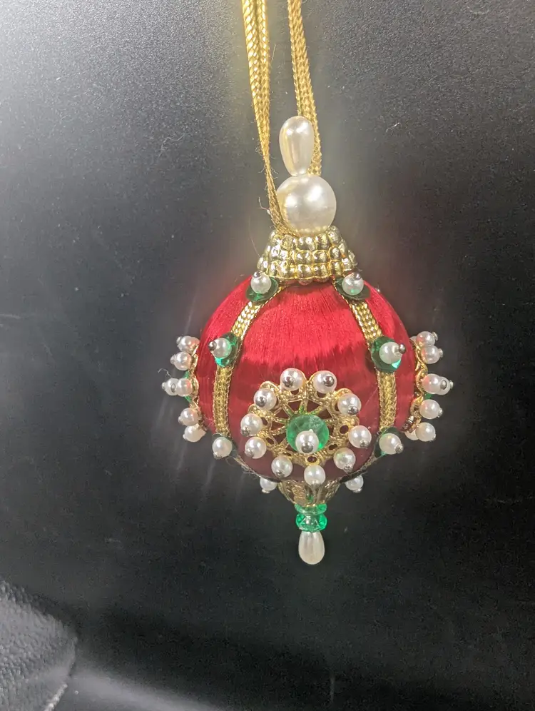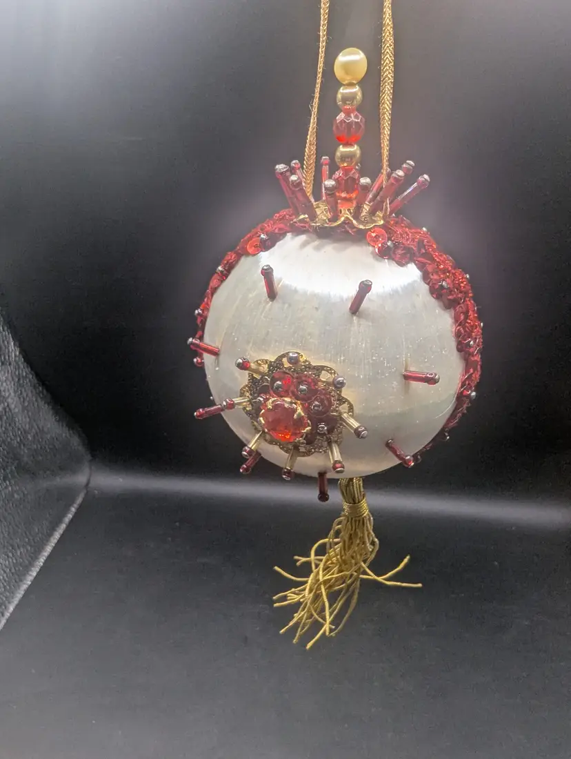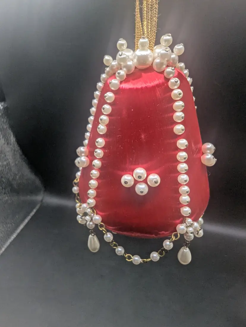 This is a lovely Vintage Lot of 4 Beaded and Sequined Push Pin Handmade Ornaments. They each have their own unique design and are all different in size and shape. They are all in excellent used condition except the white satin one has some discoloration on the satin. Please see all pictures for condition and measurements and details.