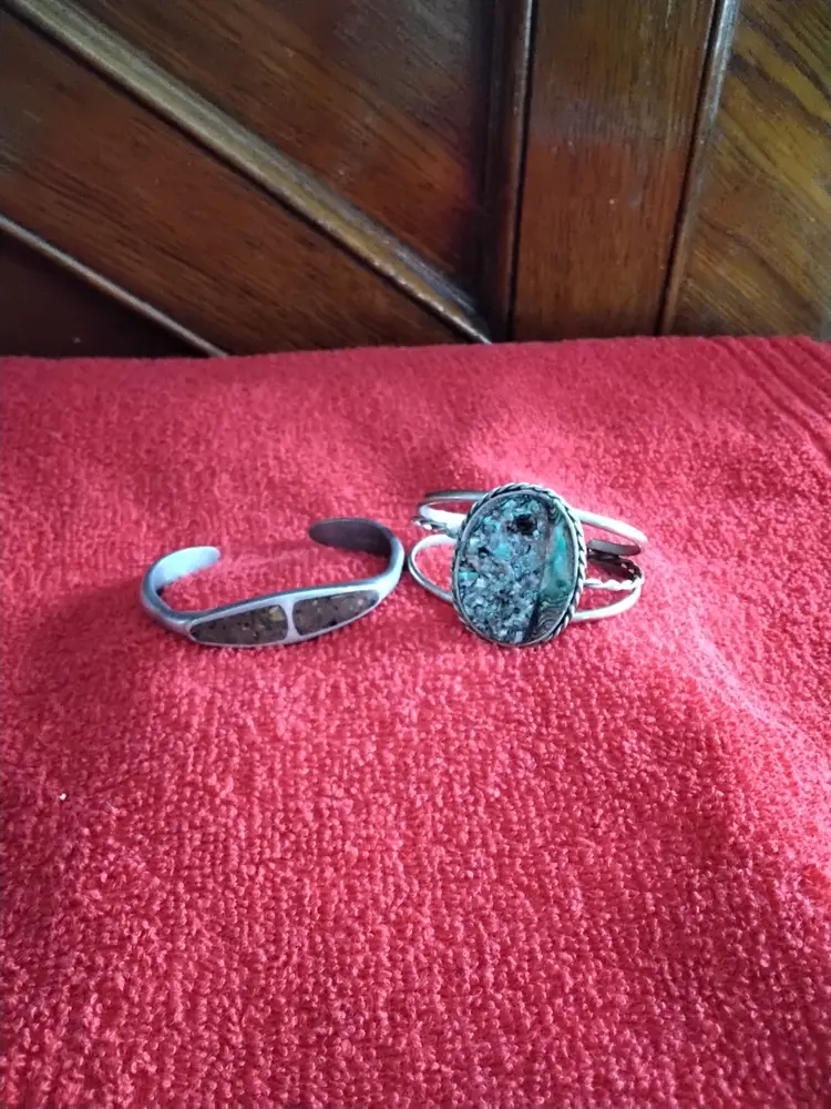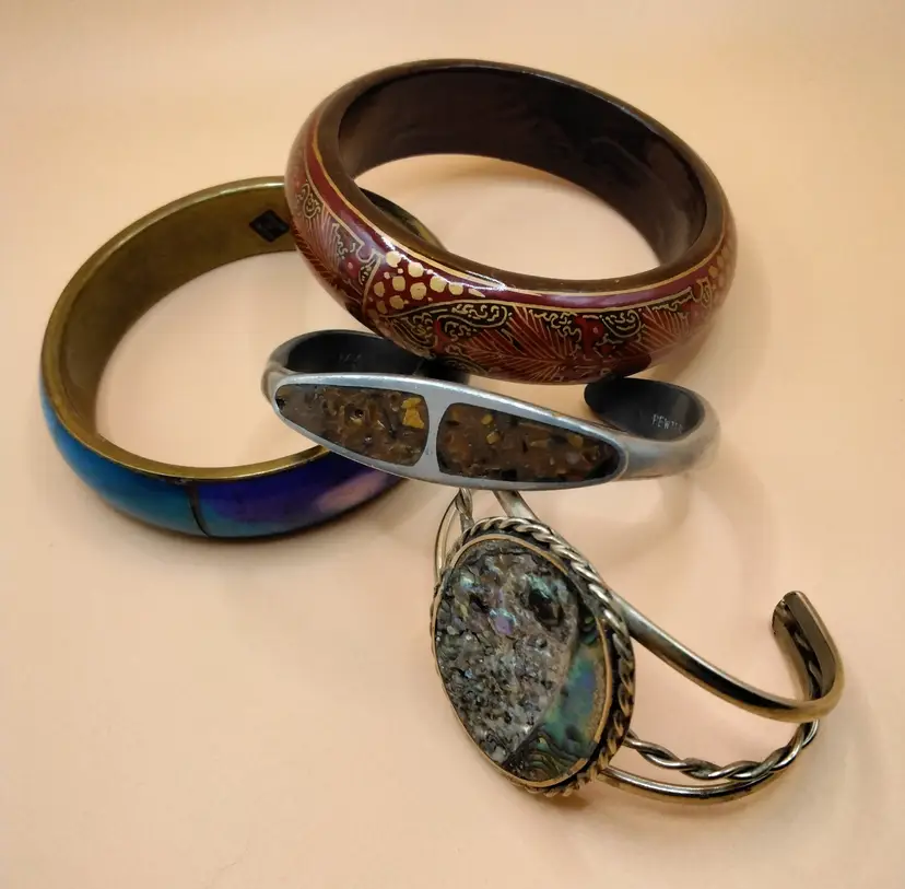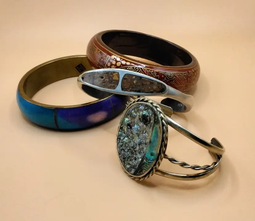 4 Bracelets. One Cuff Bracelet with Abalone Shell inlay Sterling silver. A pewter bracelet with brown cork looking inlay. A wooden bangle bracelet brown inside and burgundy outside. A made in India bracelet Bangle Bracelet looks brass colored inside and teal, blue and purple outside. All in good condition. Look to be from the 1970's. Inside measurements are around 2.3 inches to 2.6 inches across. Photos are part of the description.