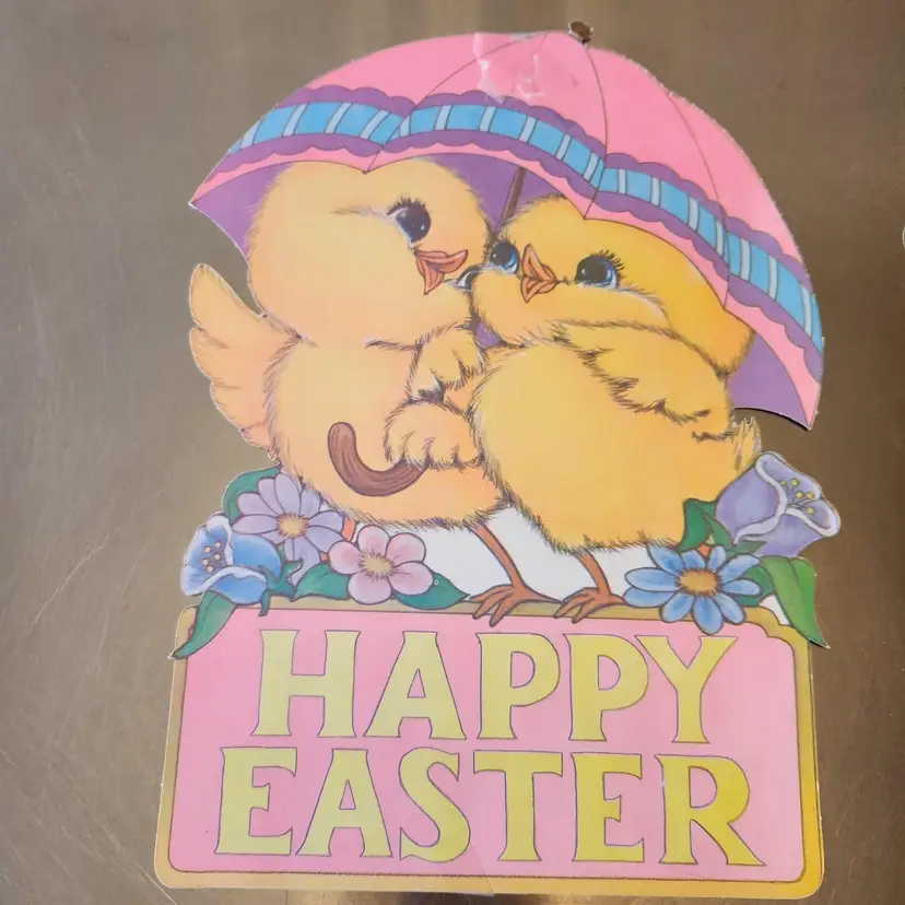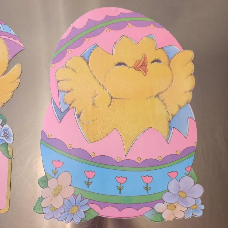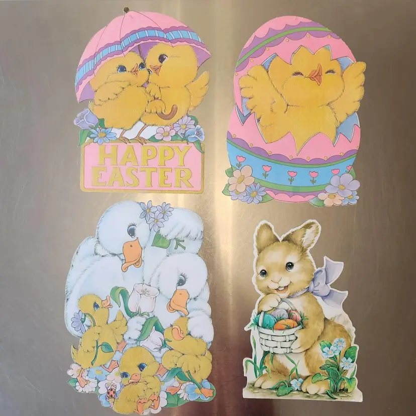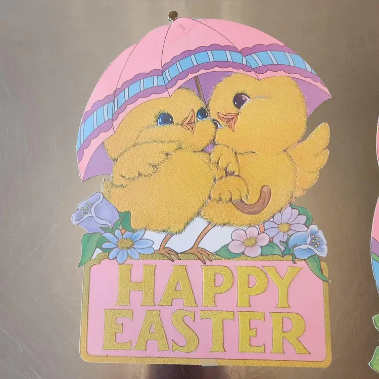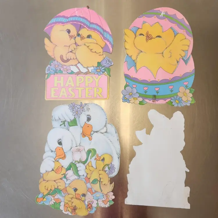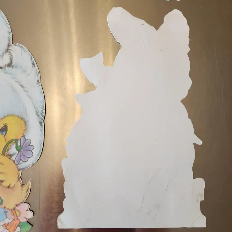These Easter decorations have been used, please see pictures to note the bends, wear and tape marks. Three of them are double sided with one side being fuzzy/flocked. The Hallmark Cards bunny is only one sided.