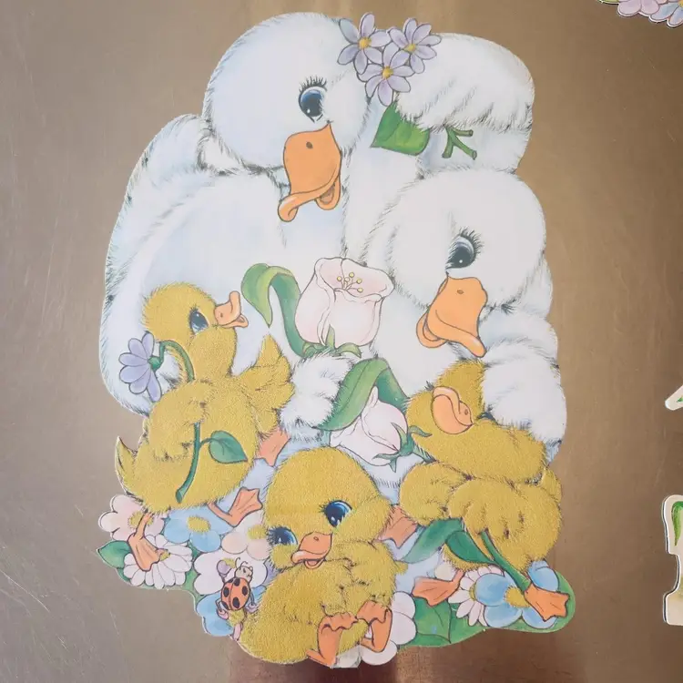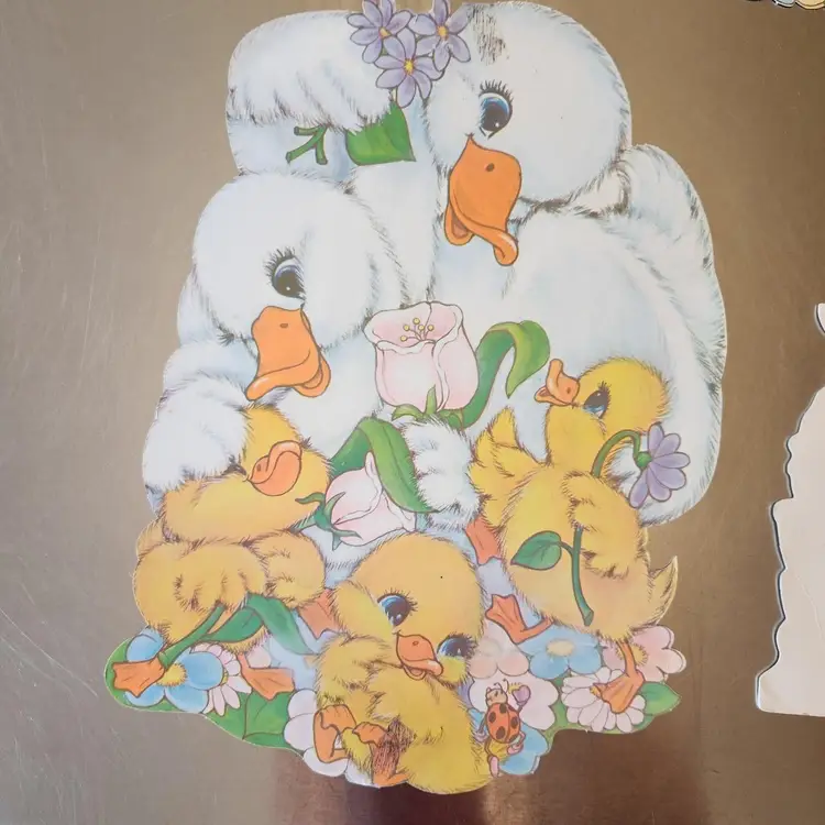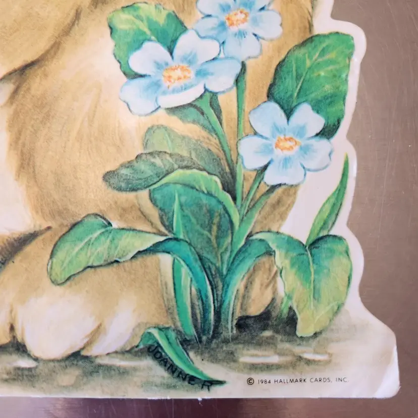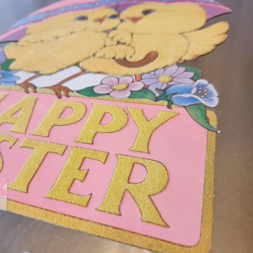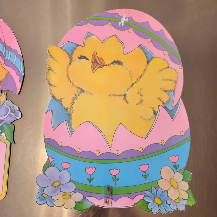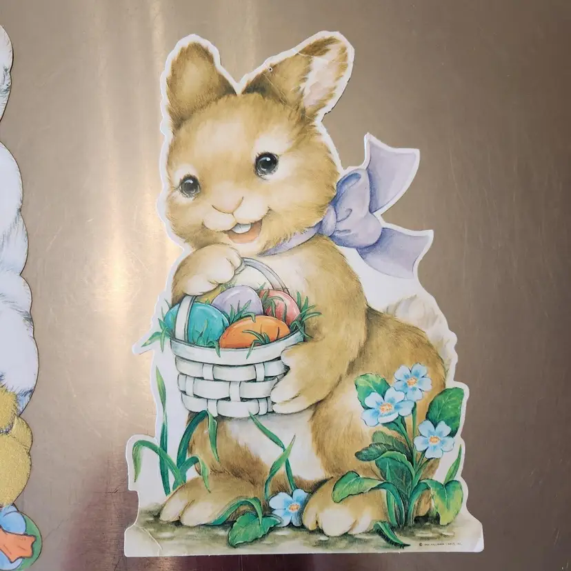 These Easter decorations have been used, please see pictures to note the bends, wear and tape marks. Three of them are double sided with one side being fuzzy/flocked. The Hallmark Cards bunny is only one sided.