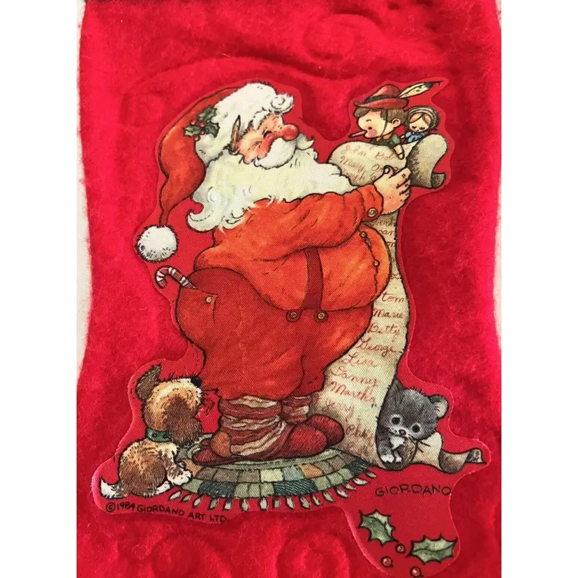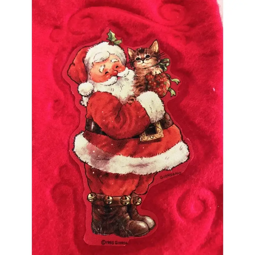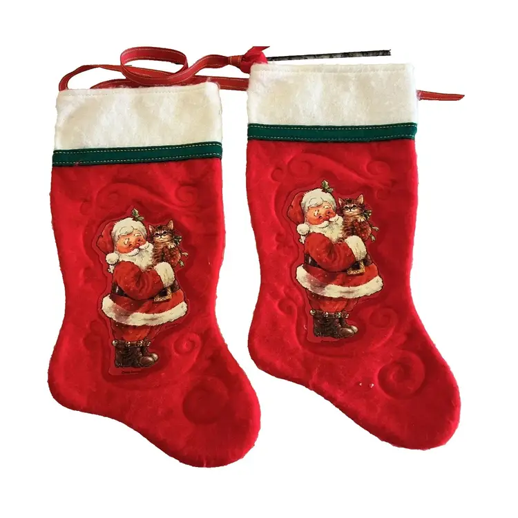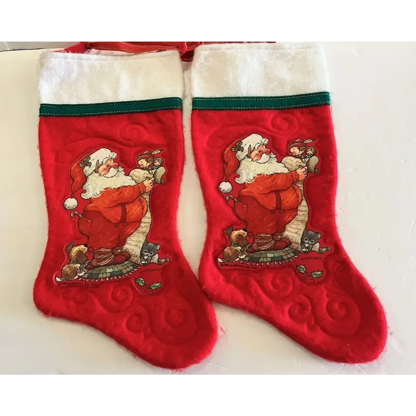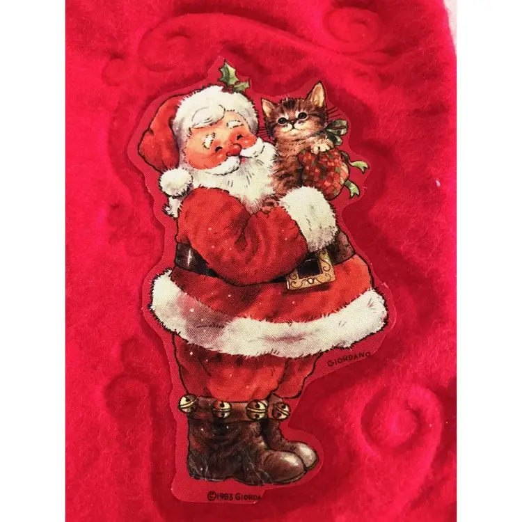 Description: Vintage Lot of 4 Giordano Art Christmas Stockings 2 - Santa Clause Holding a Kitten 1983 2 - Santa Clause Holding Pinocchio - 1984 Original Red Ribbon Artist Signed Dimensional Art Great Estate Find!