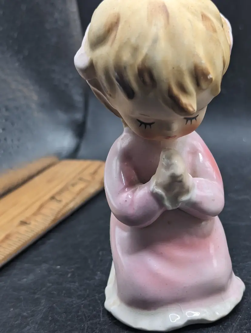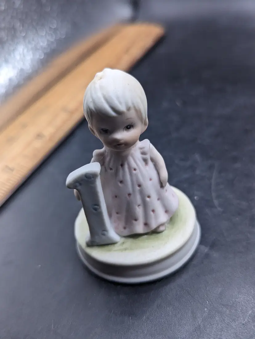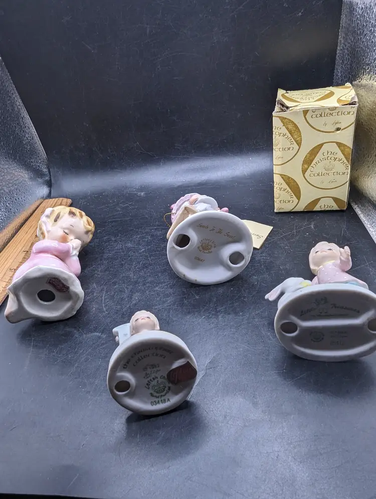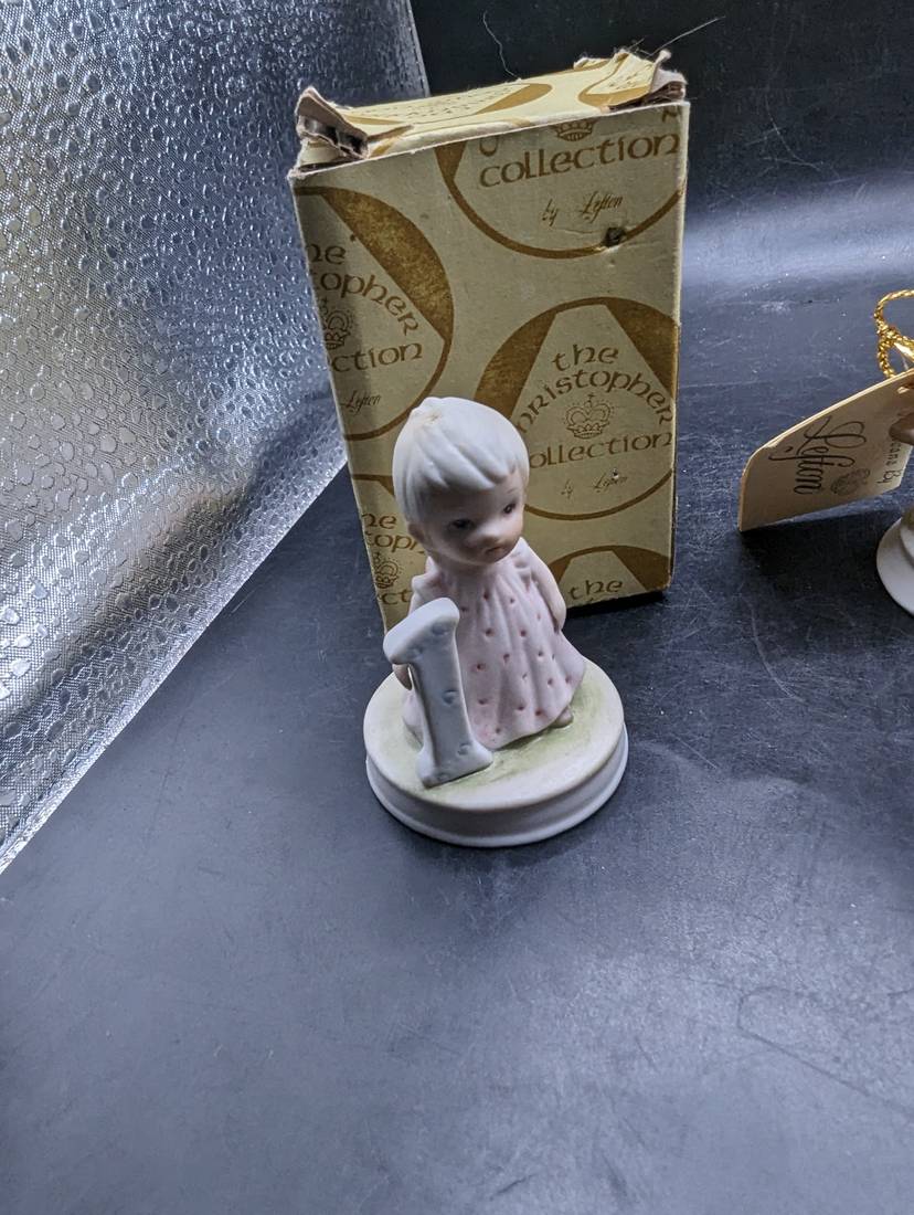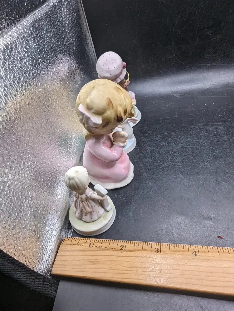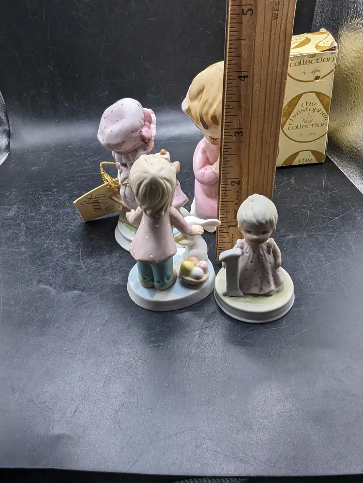 This is a lovely Vintage Lot of 4 Girl Figurines - 3 Lefton 2 Napcoware. They include the following: Vintage Napcoware cute girl figurine Lefton 1986 Little Treasures Girl with bunny Lefton little girl praying VTG Lefton Birthday Girls Age 1 Figurine Christopher Collection First 2 3/8”