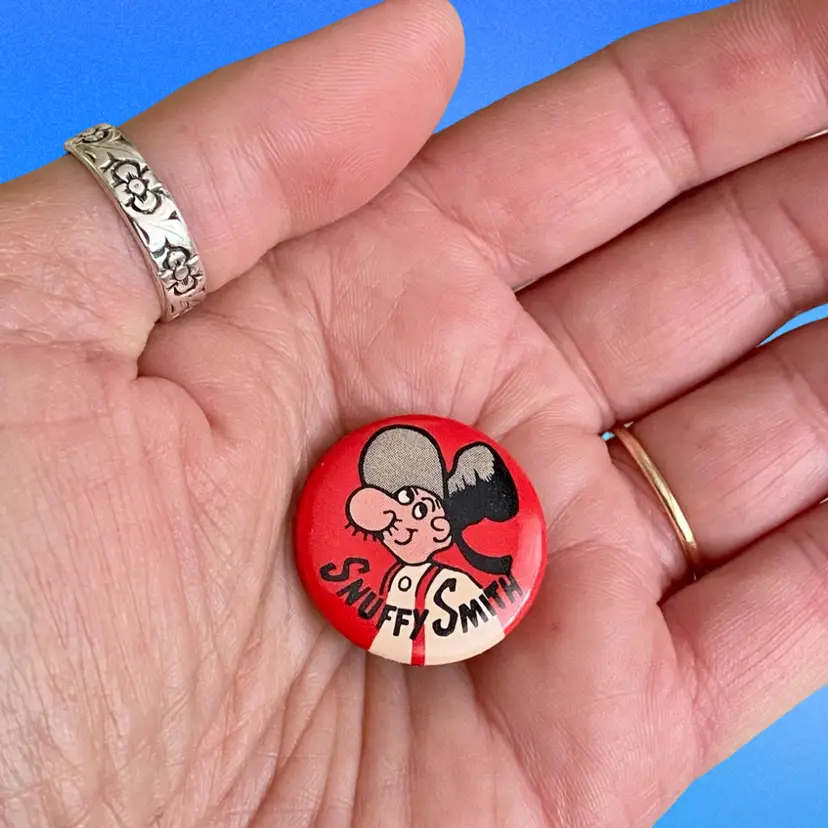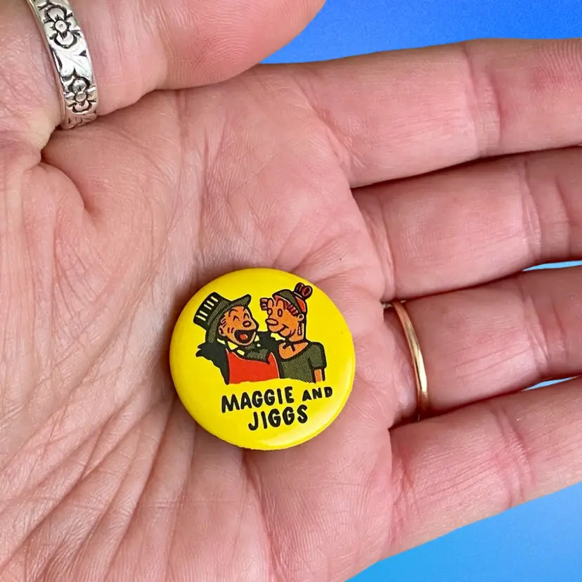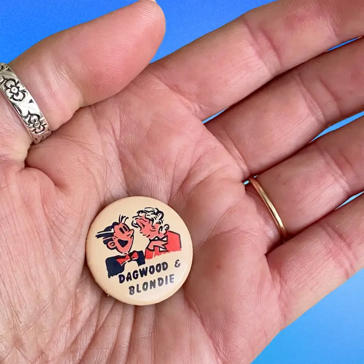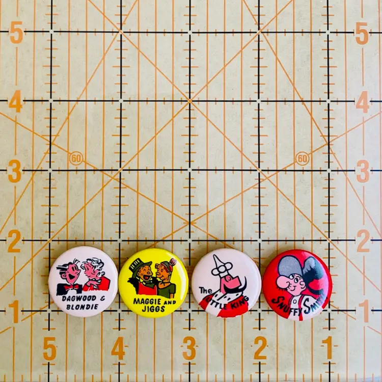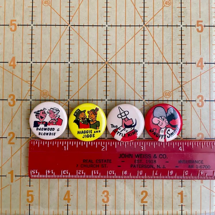 This is a vintage lot of (4) King Features Syndicate Pinback Buttons featuring the following 40’s cartoon characters: Blondie & Dagwood, Maggie and Jiggs, The Little King and Snuffy Smith. These were purchased years ago from a collector in New Jersey. Each pin measures approximately 1” in diameter. They are in very good vintage condition. No issues to note.