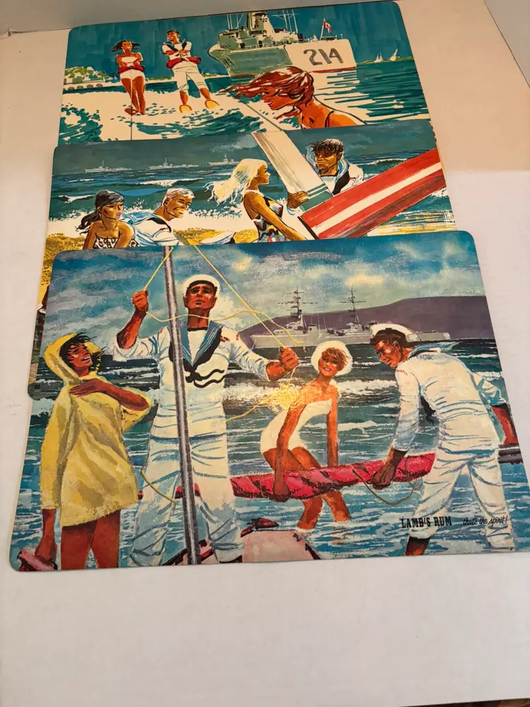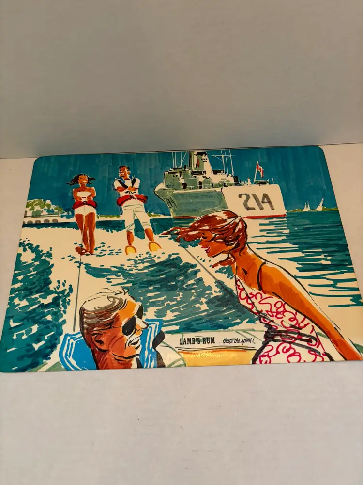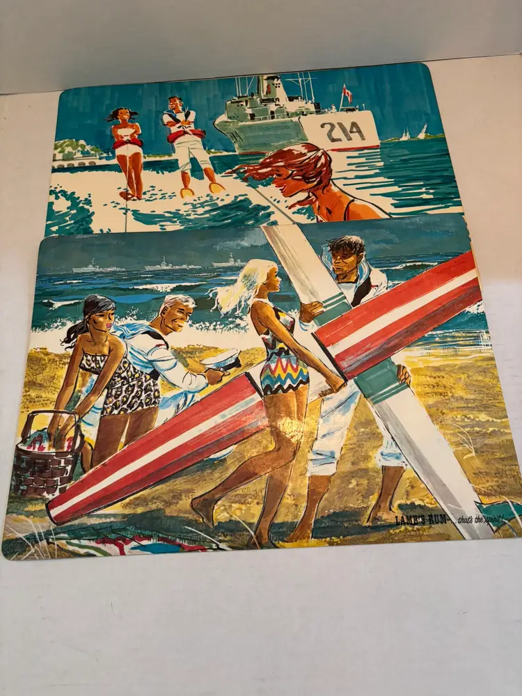 The product is a set of 4 vintage Lamb's Rum nautical-themed vinyl placemats with a cork backing, dating from the 1960s. The placemats are rectangular in shape and feature a multicolor nautical theme, perfect for all occasions. Made of vinyl and cork materials, they should be hand-washed only. These original placemats add a unique and retro touch to any dining table, especially for collectors of vintage kitchen linens and textiles. Staining on the back of one placemat