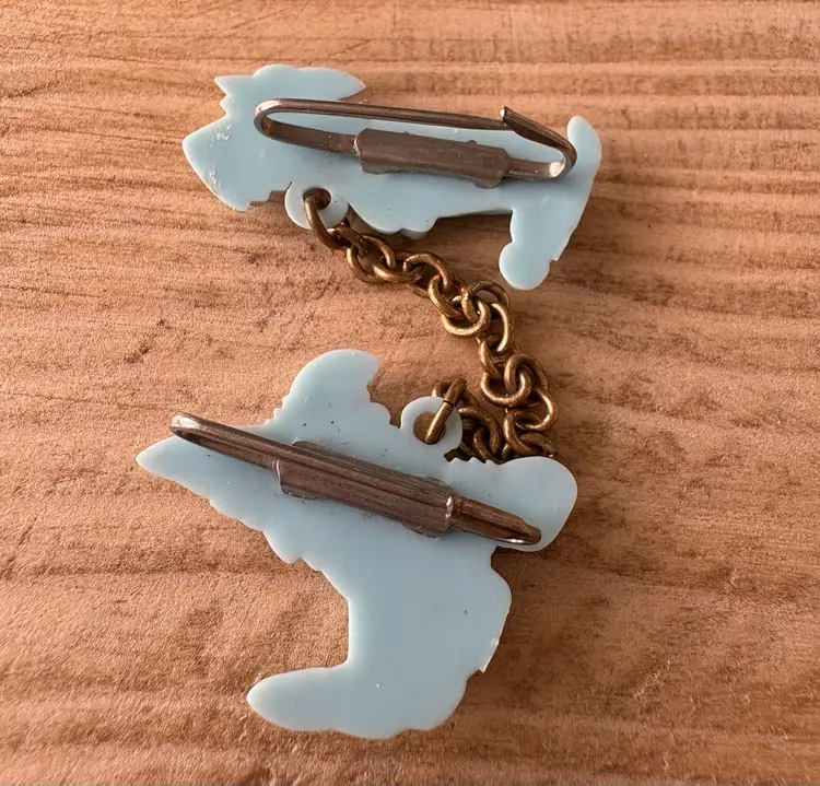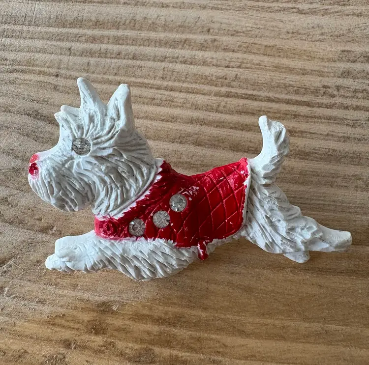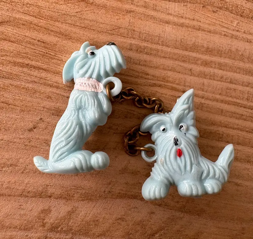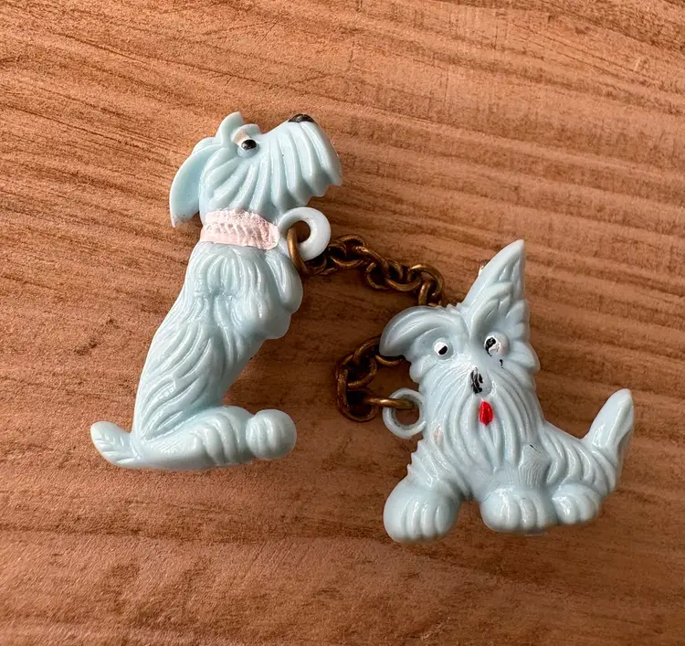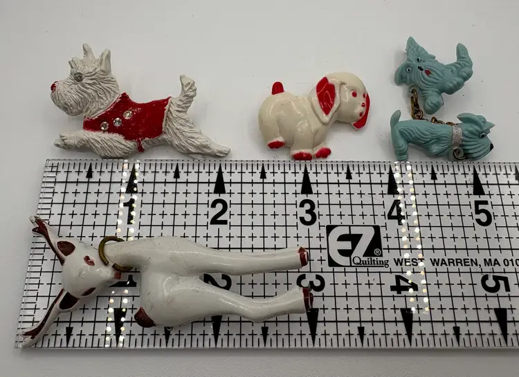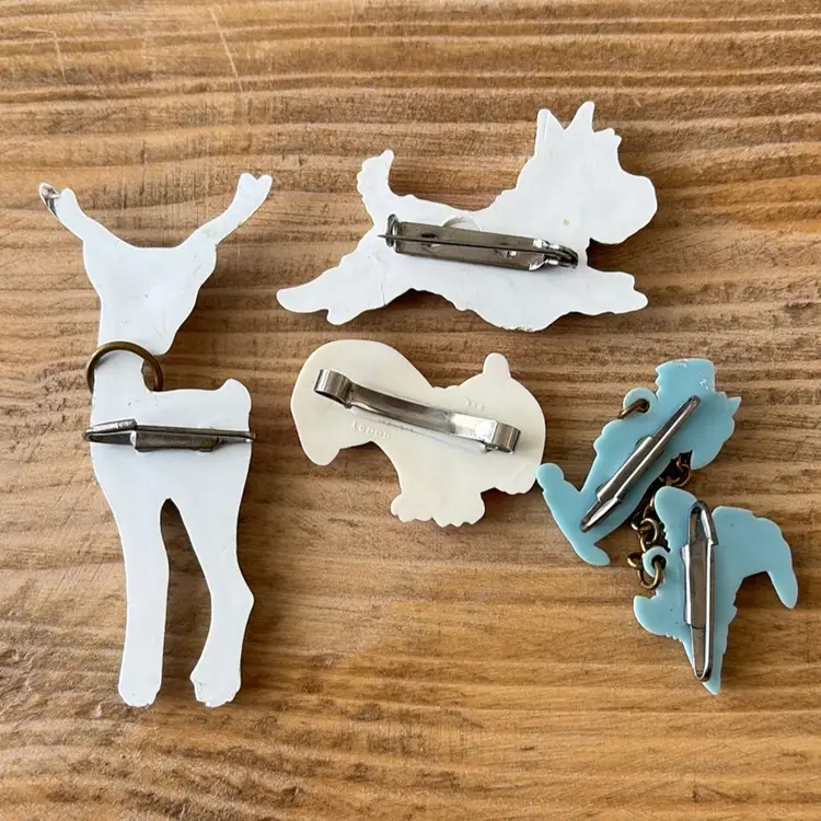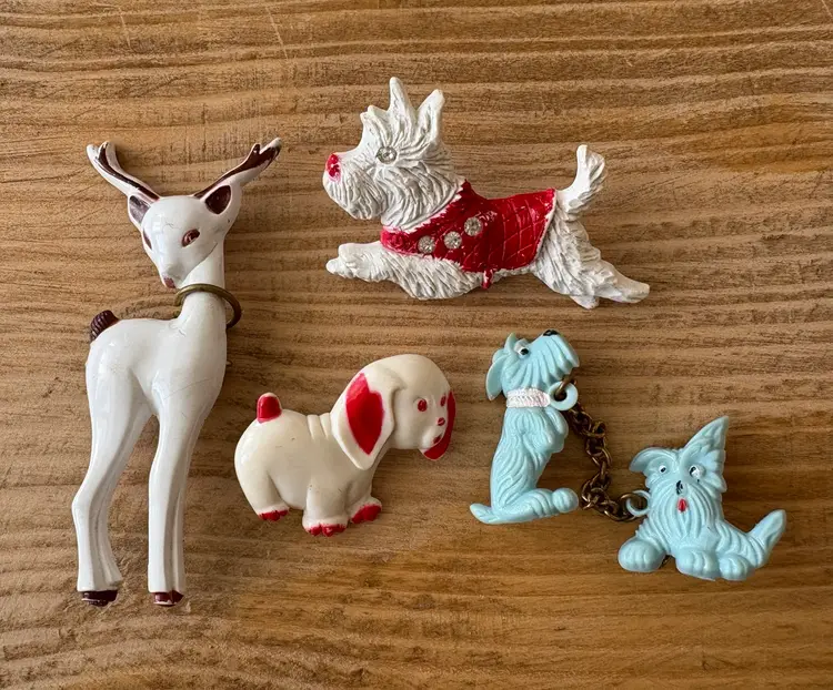 Four vintage pieces include: 1 Goody brand dog barrette 1 white Westie terrier pin, red sweater & rhinestones 1 two piece blue terriers with chain pin 1 white deer with antlers pin Good vintage condition. Old style clasps are all intact. All plastic-type material. Please review images. Dimensions in last picture.