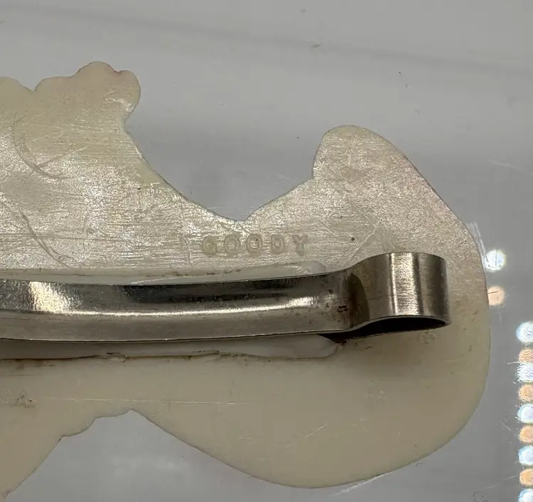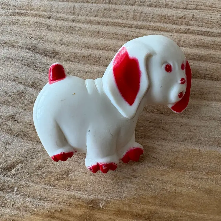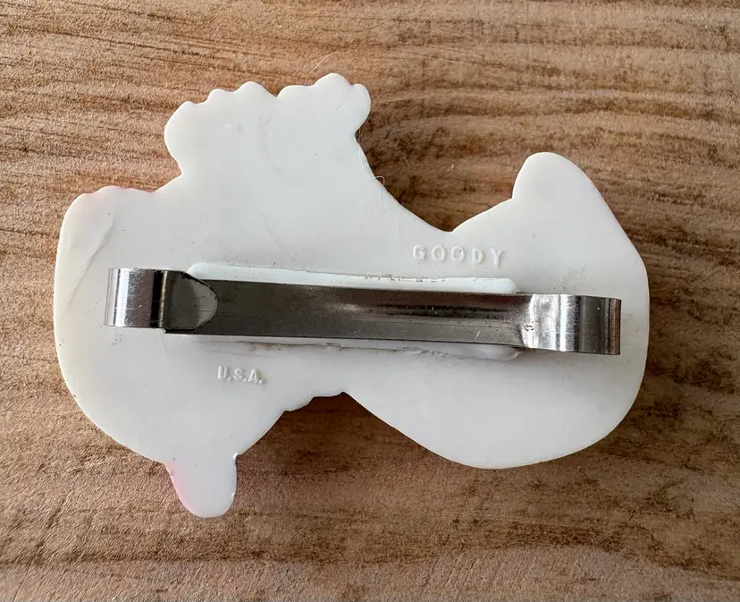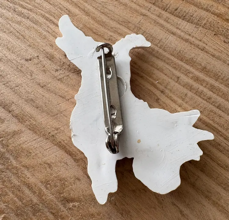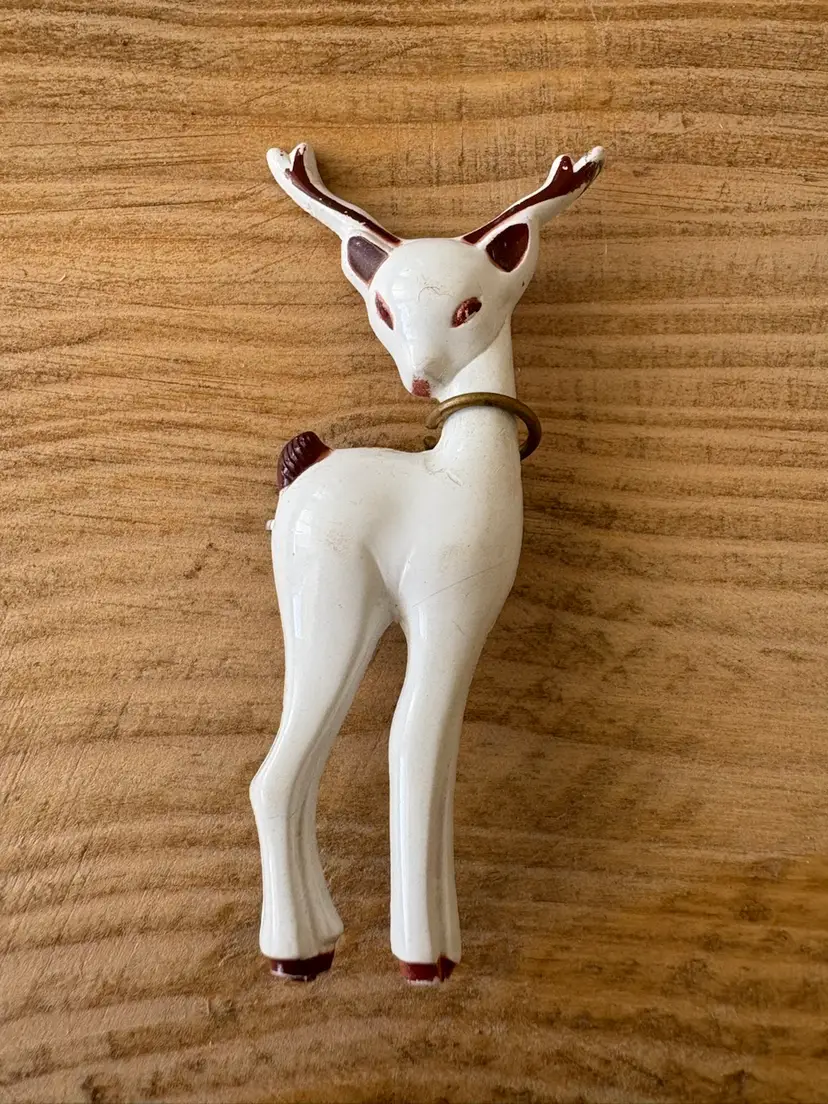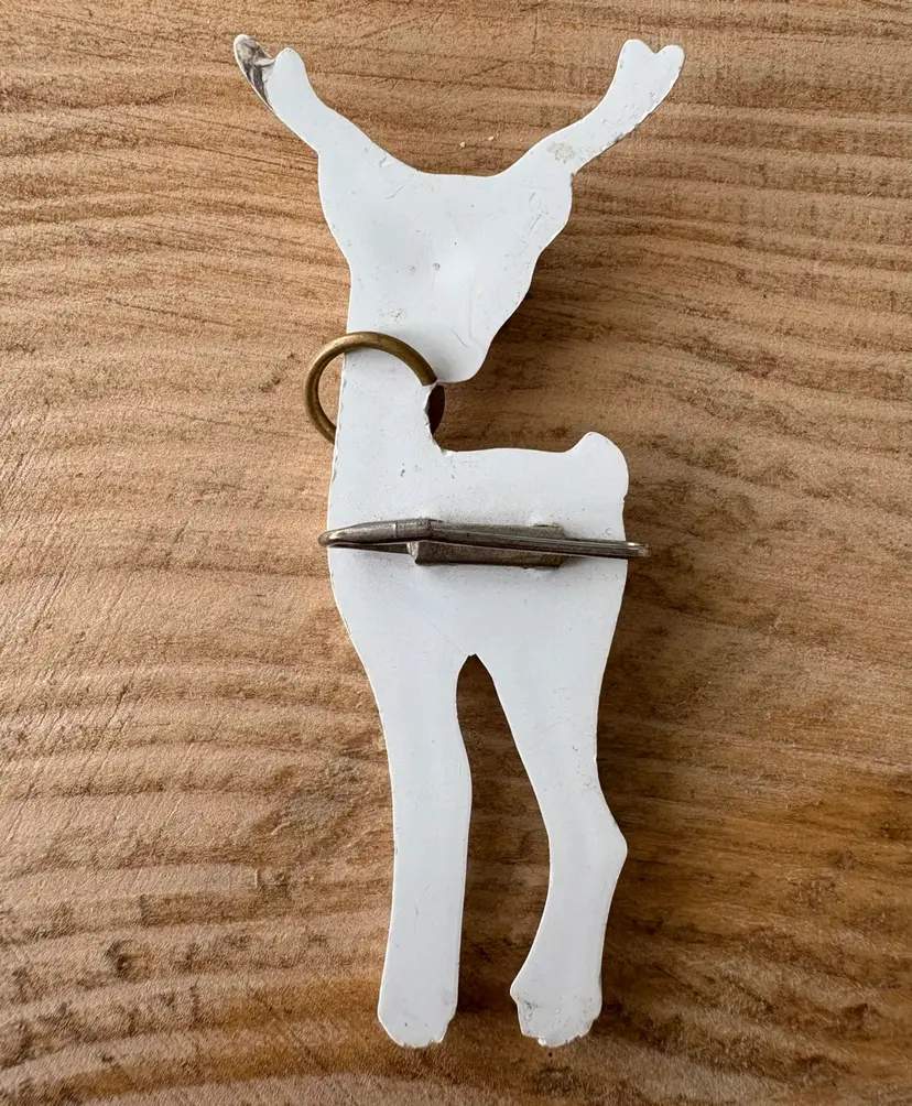 Four vintage pieces include: 1 Goody brand dog barrette 1 white Westie terrier pin, red sweater & rhinestones 1 two piece blue terriers with chain pin 1 white deer with antlers pin Good vintage condition. Old style clasps are all intact. All plastic-type material. Please review images. Dimensions in last picture.