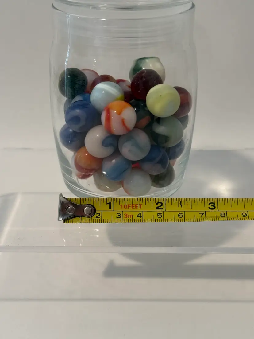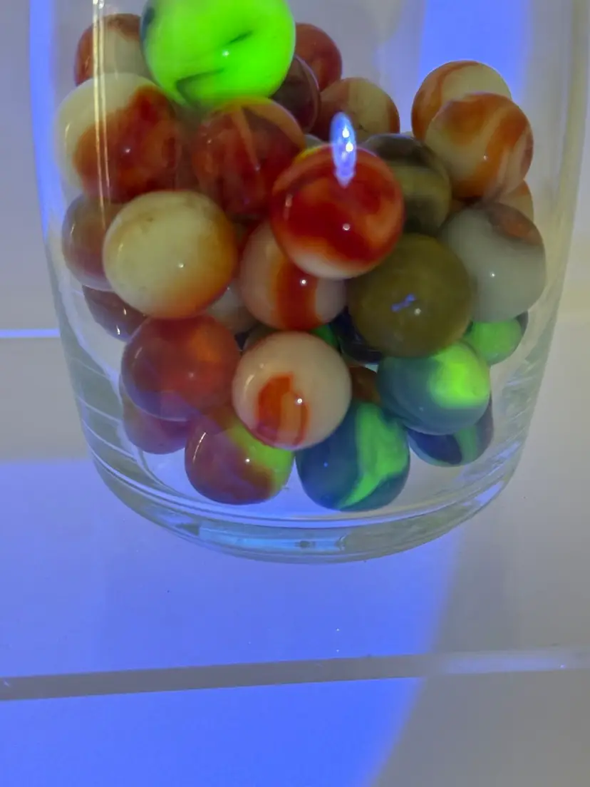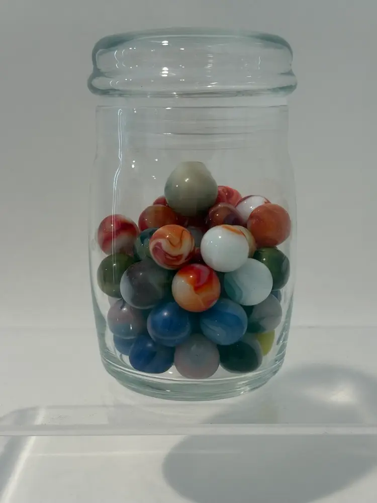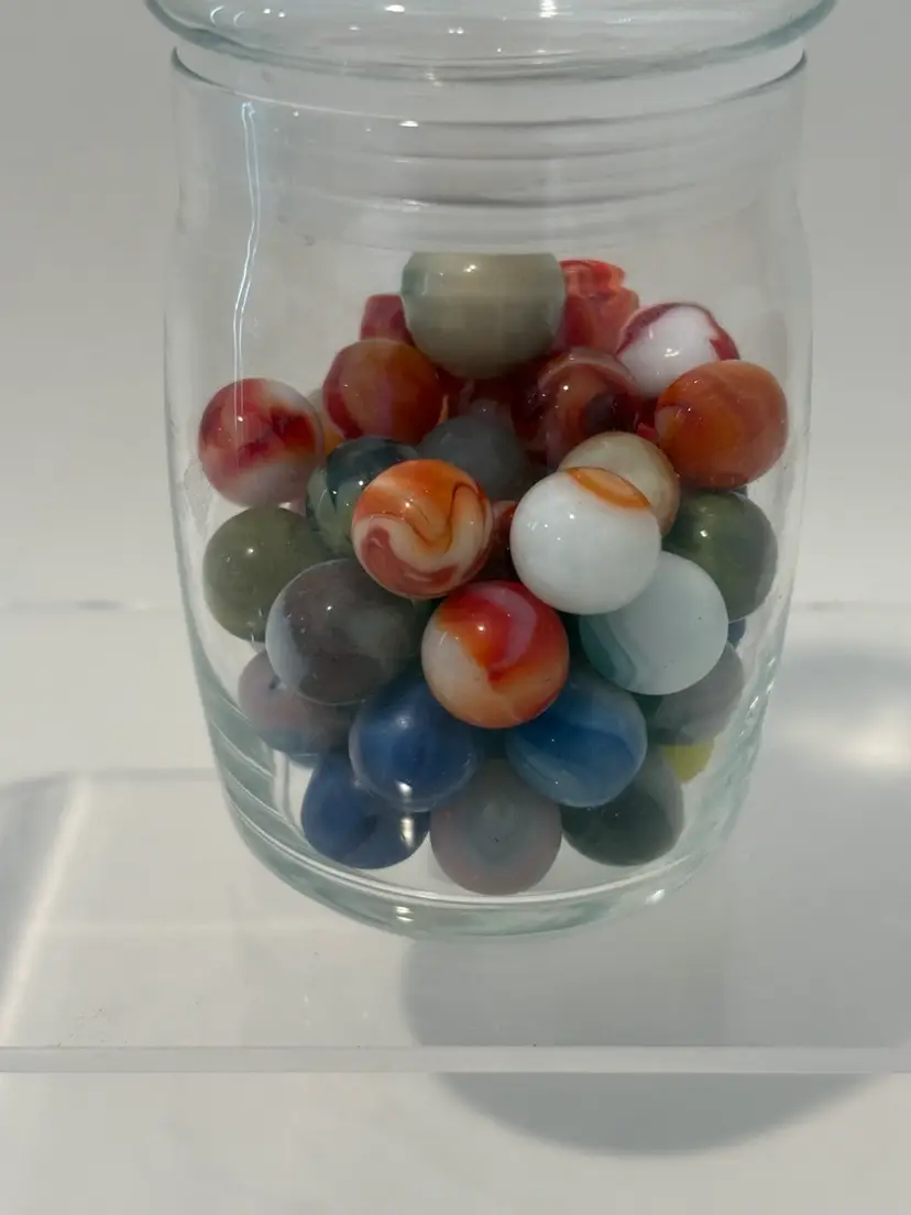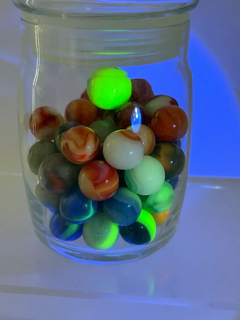 The vintage lot of 53 marbles includes 1 shooter and UV reactive uranium marbles stored in a jar. These machine-made marbles were produced in the United States before 1970, featuring a mixed style. The collection offers a glimpse into marble playing history with its unique and eye-catching pieces.