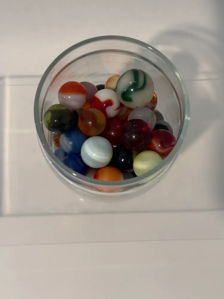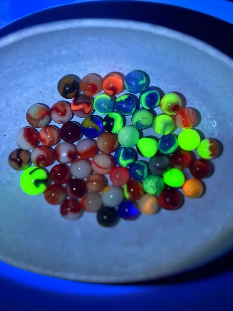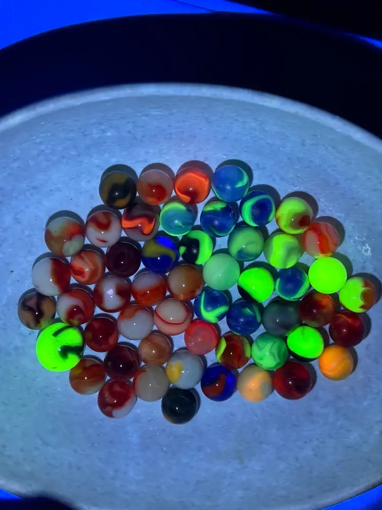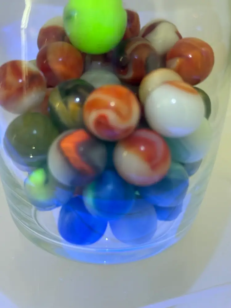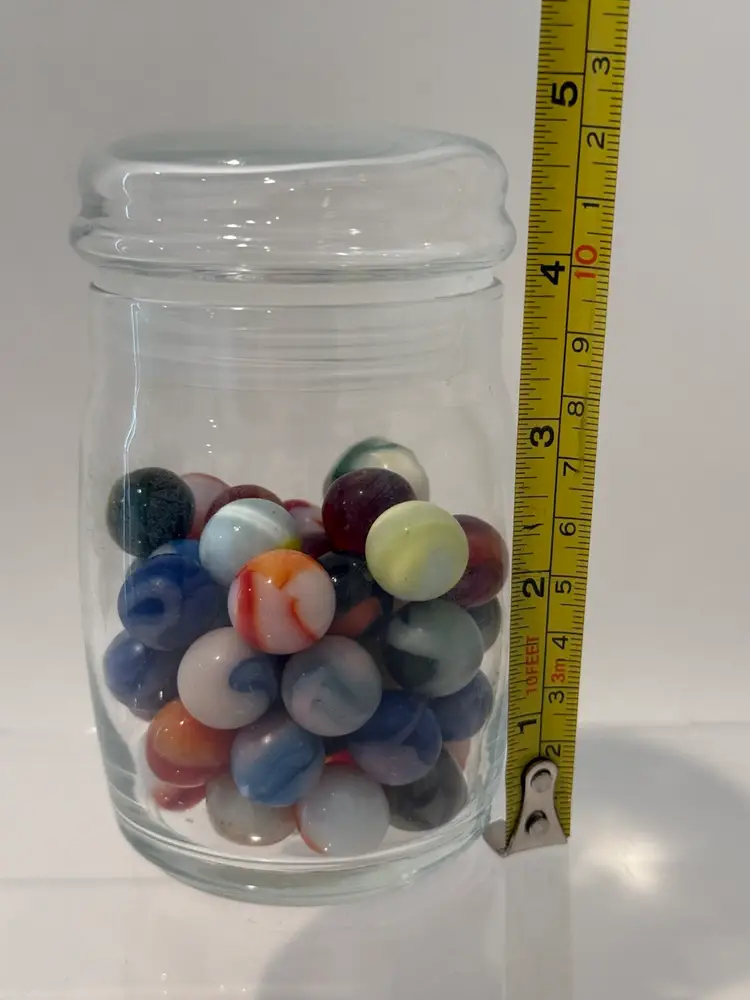 The vintage lot of 53 marbles includes 1 shooter and UV reactive uranium marbles stored in a jar. These machine-made marbles were produced in the United States before 1970, featuring a mixed style. The collection offers a glimpse into marble playing history with its unique and eye-catching pieces.
