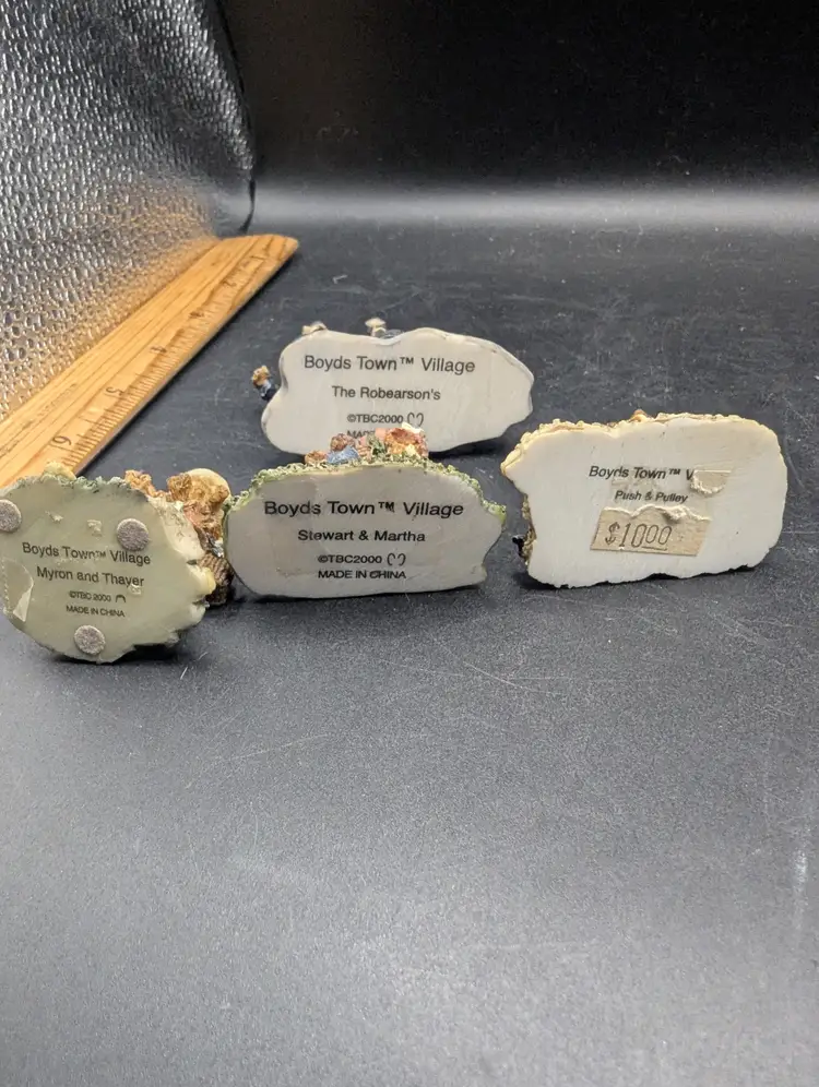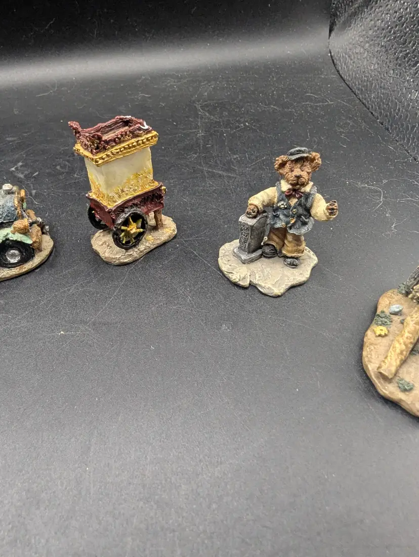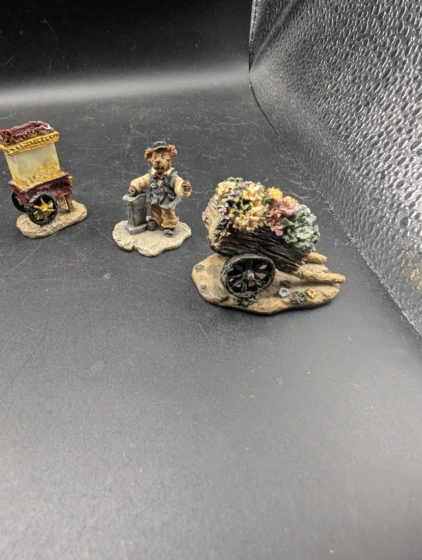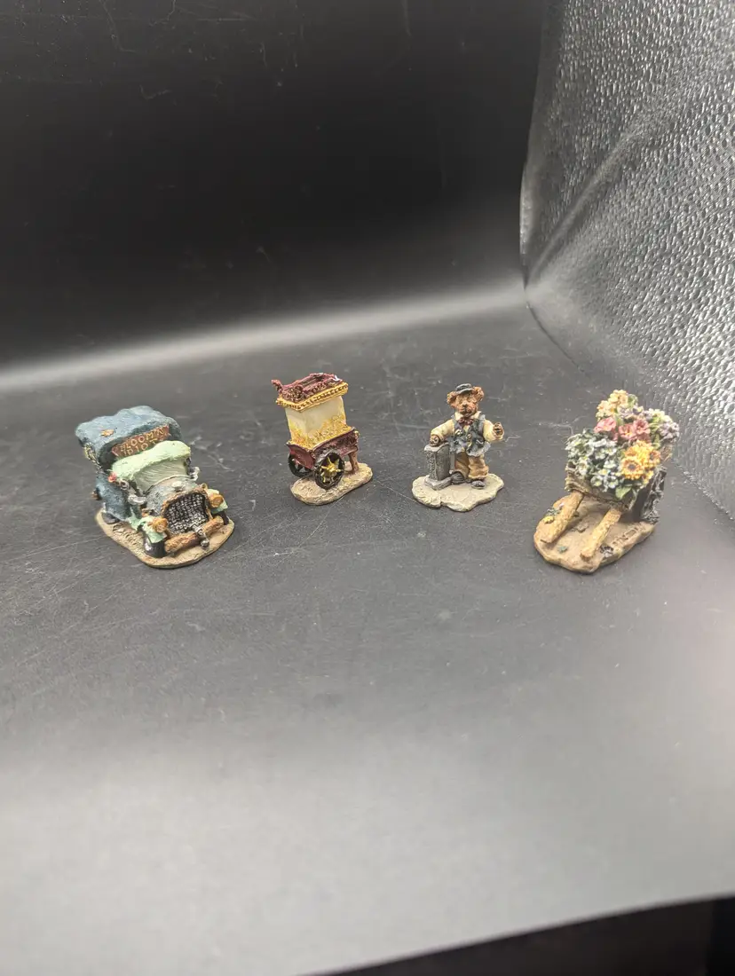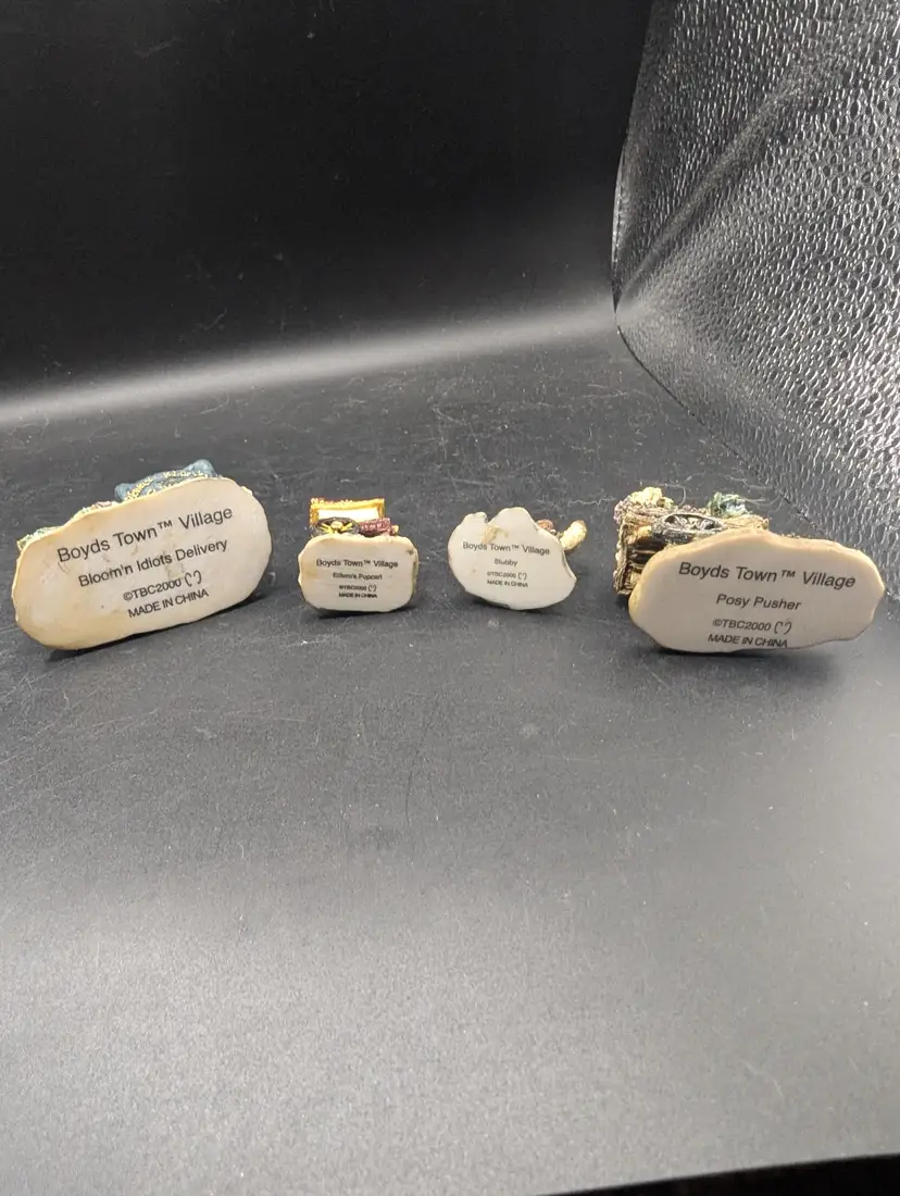 This is a fantastic Vintage Lot of 8 Boyd's Village Miniature Figurines. It includes Stewart & Martha, Myron & Thayer, Push & Pulley, The Robearsons, Bloomin Idiots Delivery, Stubby, Post Pusher and Ellivro's Popcart. The only damage that I see is to the Popcart as seen in last picture. Please see all pictures for condition and measurements.