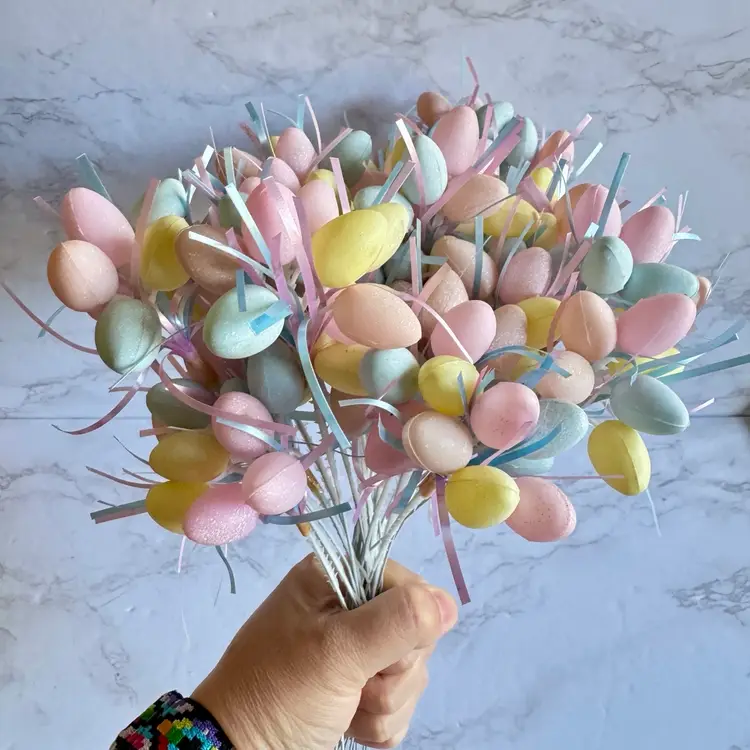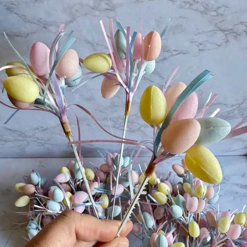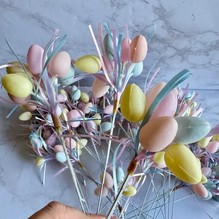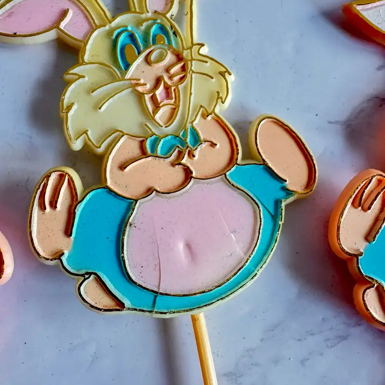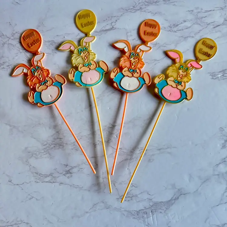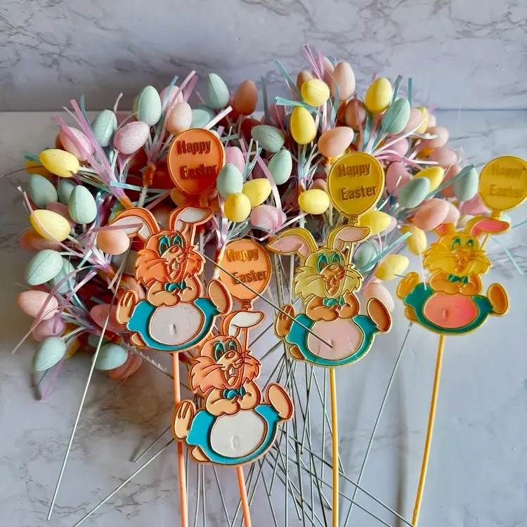 4 bunny picks, one is cracked. 29 blow mold style easter egg picks in good vintage condition.