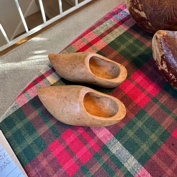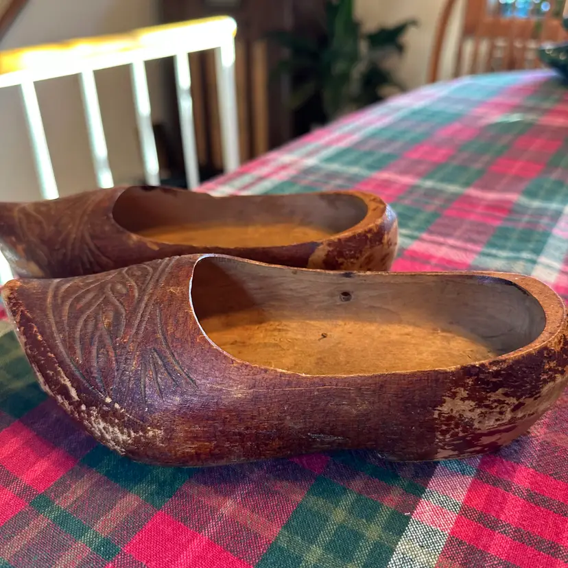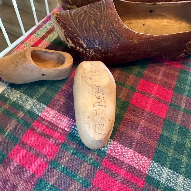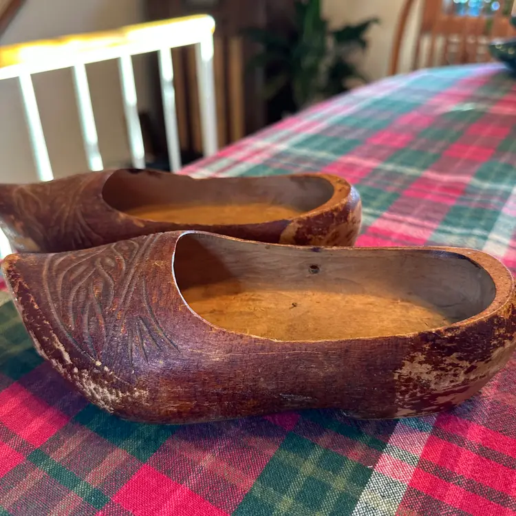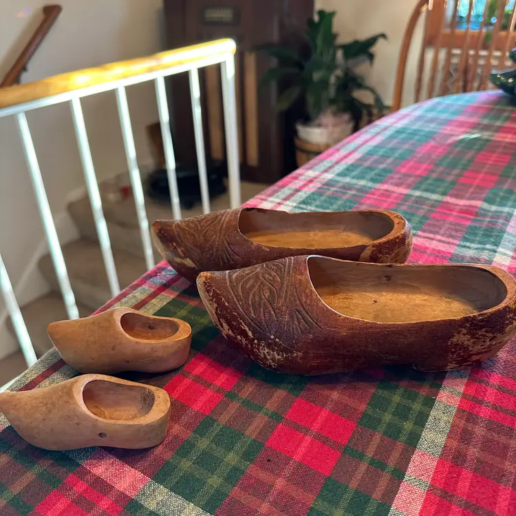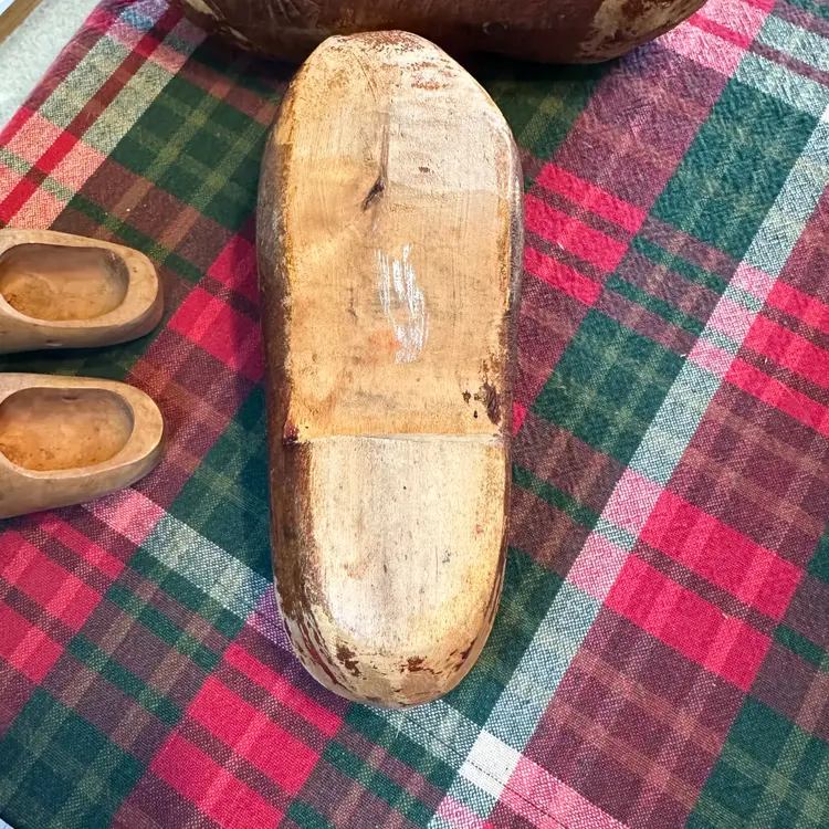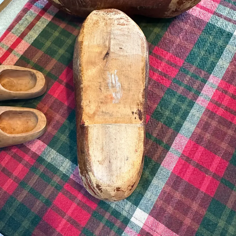 Vintage lot of wooden clogs. Larger pair are hand carved wooden clogs, traditionally known as klompen in the Netherlands. These are a traditional form of protective footwear in the Dutch and French culture. These are likely souvenirs or child sized clogs rather than everyday work shoes. Smaller ones are likely for a doll or decoration. Larger ones measure 8" long x 3" wide. Smaller ones are 3 3/4" long x 1 1/2" wide.