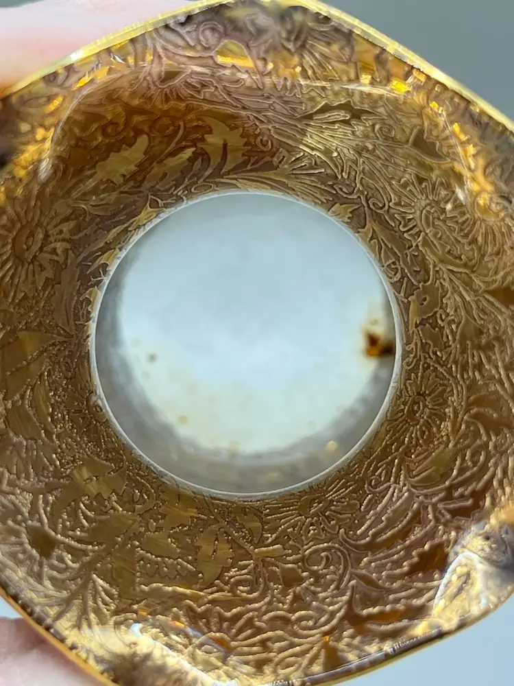 No chips. Has some staining / debris stuck down on the inside.