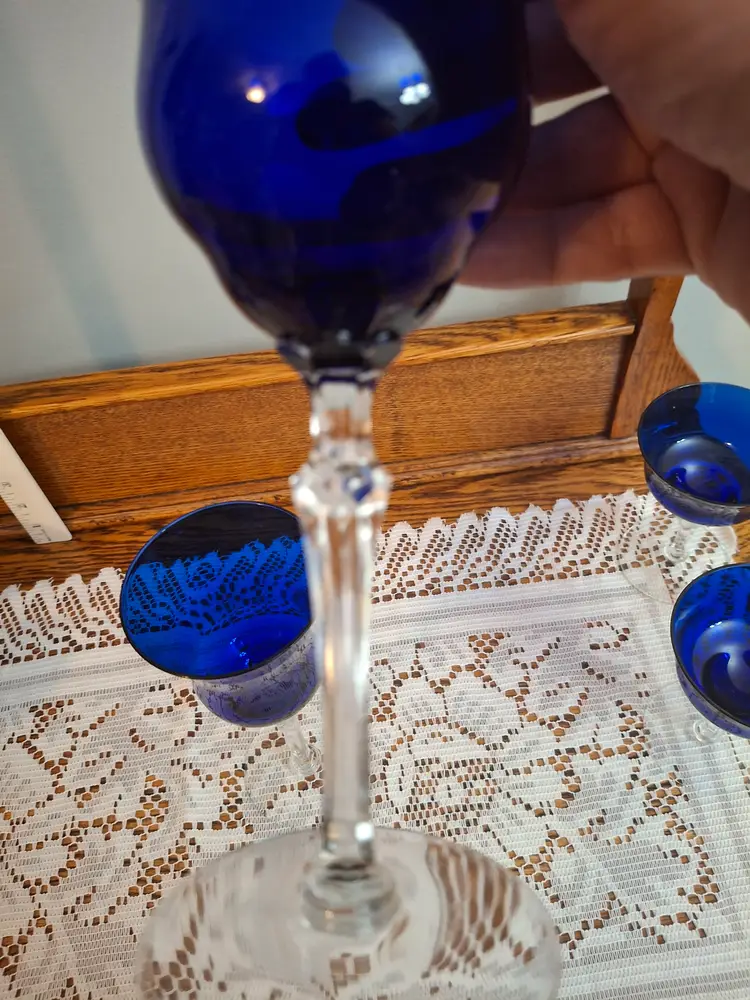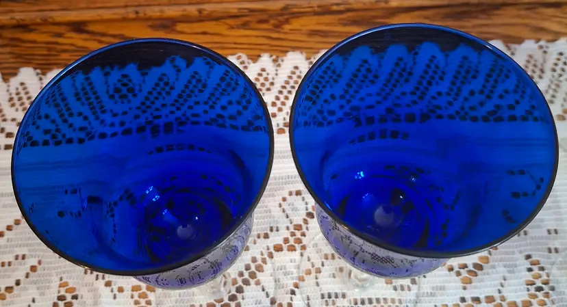 Vintage Louie Cobalt Blue Wine Glass is 8 1/4" tall. This beautiful pair of glasses were made between 1932 and 1940 by the Louie Glass Company in Weston West Virginia. The quality of the glass is outstanding with the rich, cobalt blue bowl sitting on petal atop the glass stem. Set of 2 glasses. No chips, cracks or repairs. Please view the pictures and feel free to ask questions. Thank you for visiting my shop.