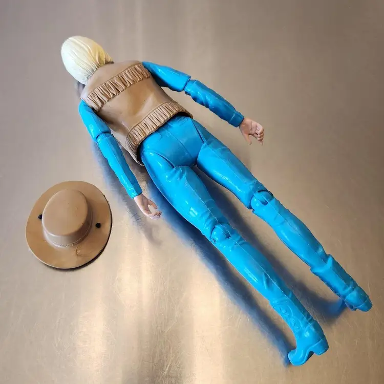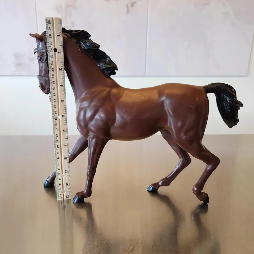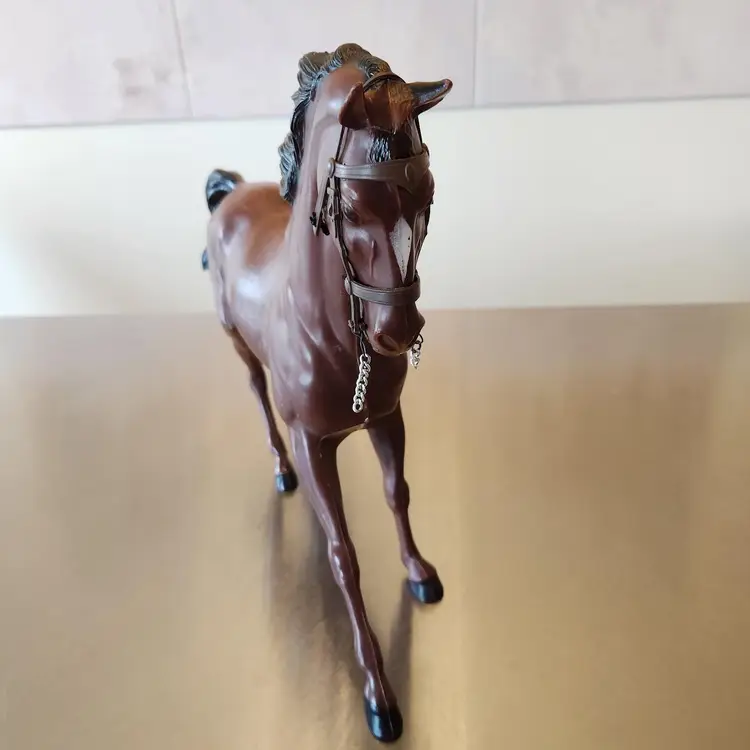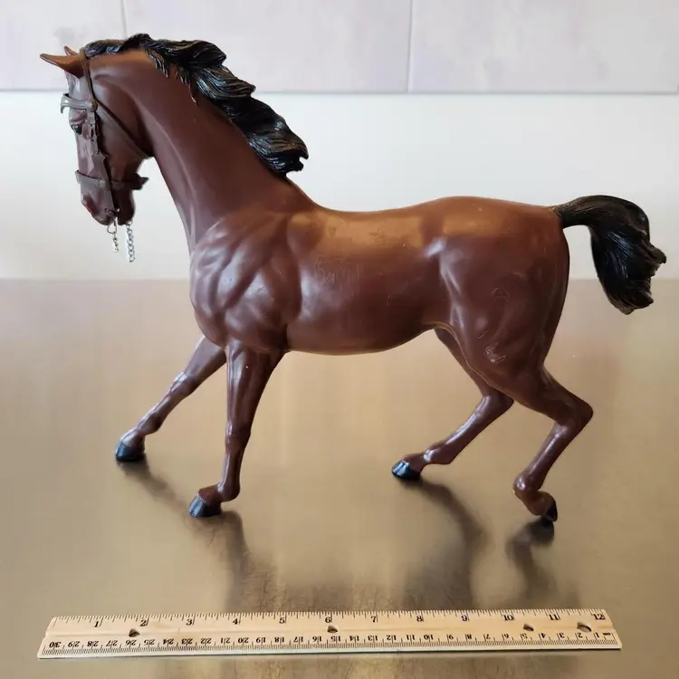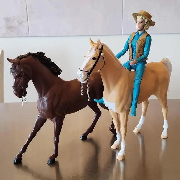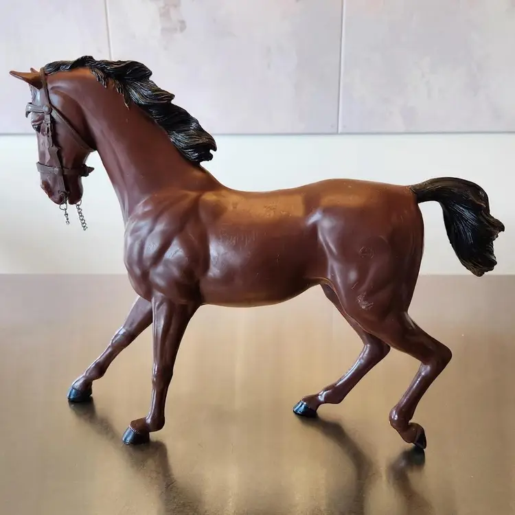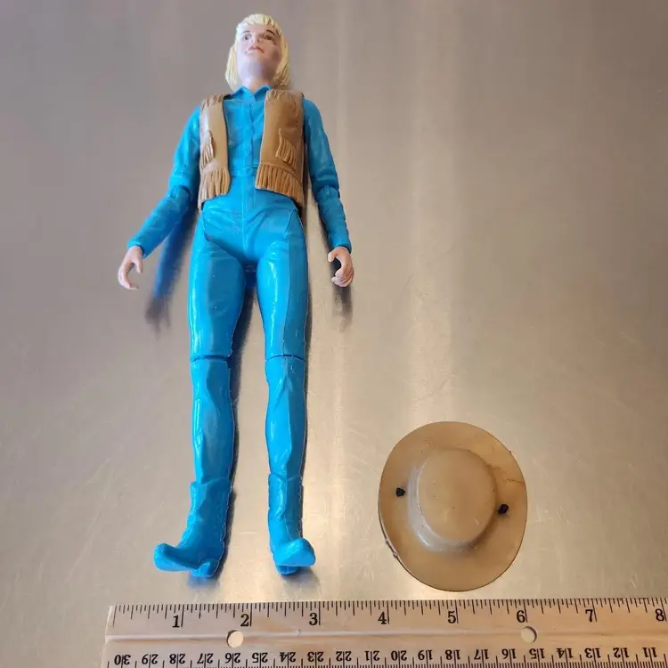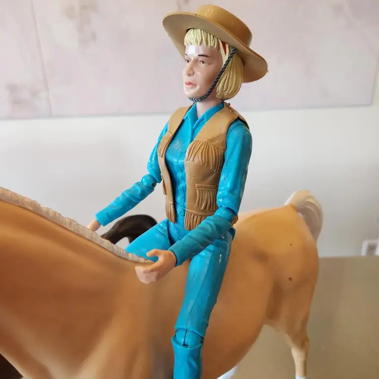 This auction lot is for a Jane West Doll with her vest and hat. A palomino Thunderbolt Horse and a brown Flame horse with tack. Please see all the pictures for their condition. Pictures show the paint wear, scratches, scuffs and some melted areas on Thunderbolt. All-in-all for their age these pieces are in pretty good condition.