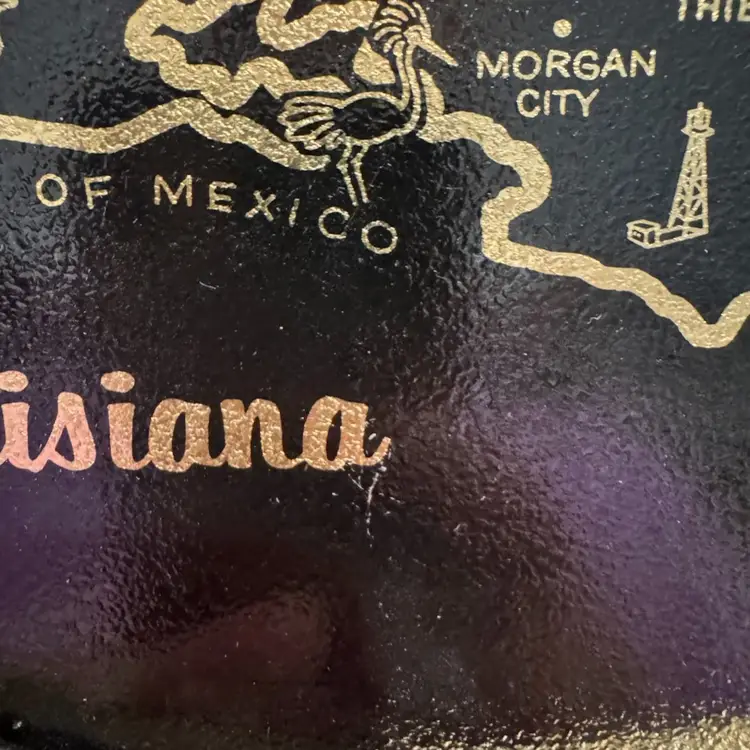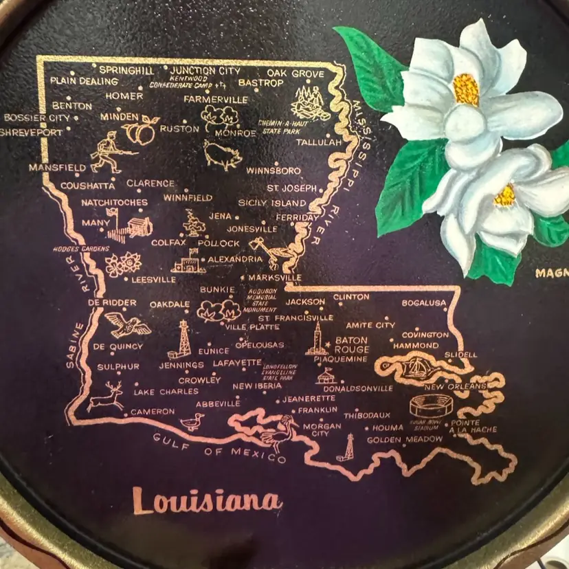 Metal tray 12” circle. Some small scuffing shown in picture. Midcentury travel souvenir!