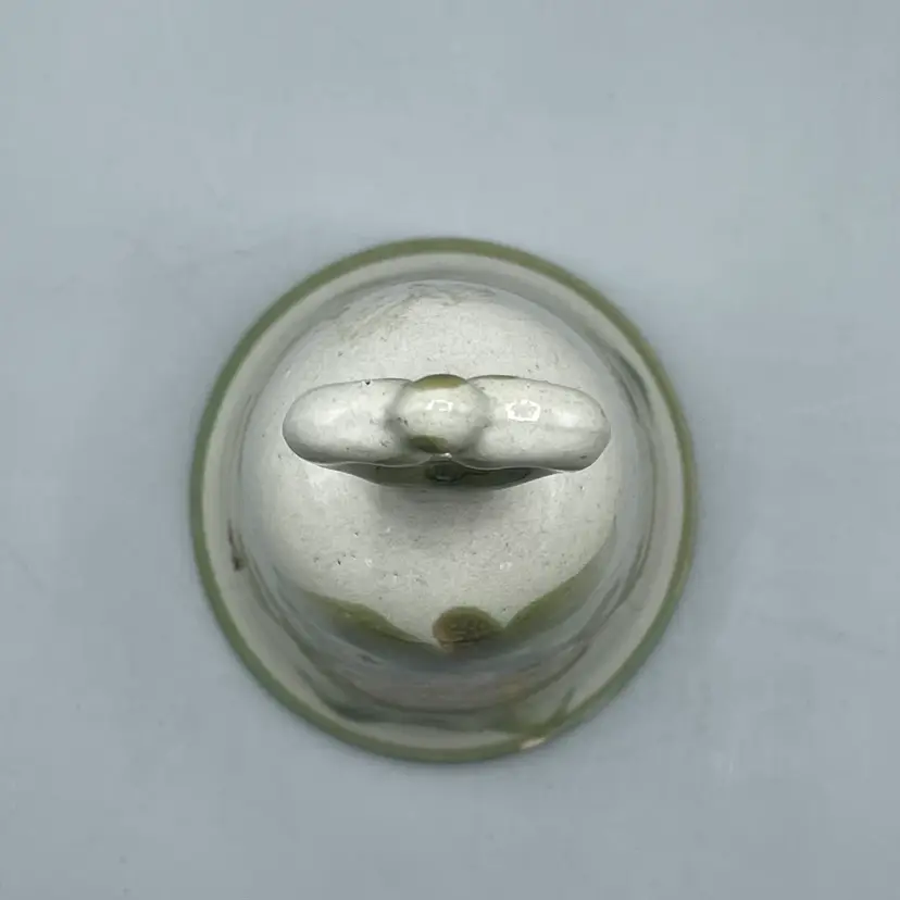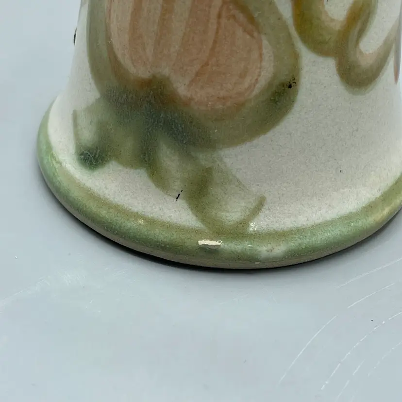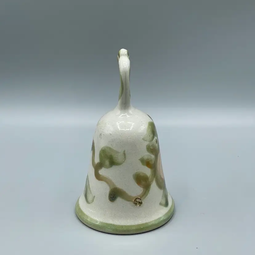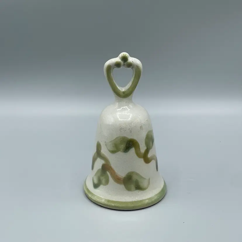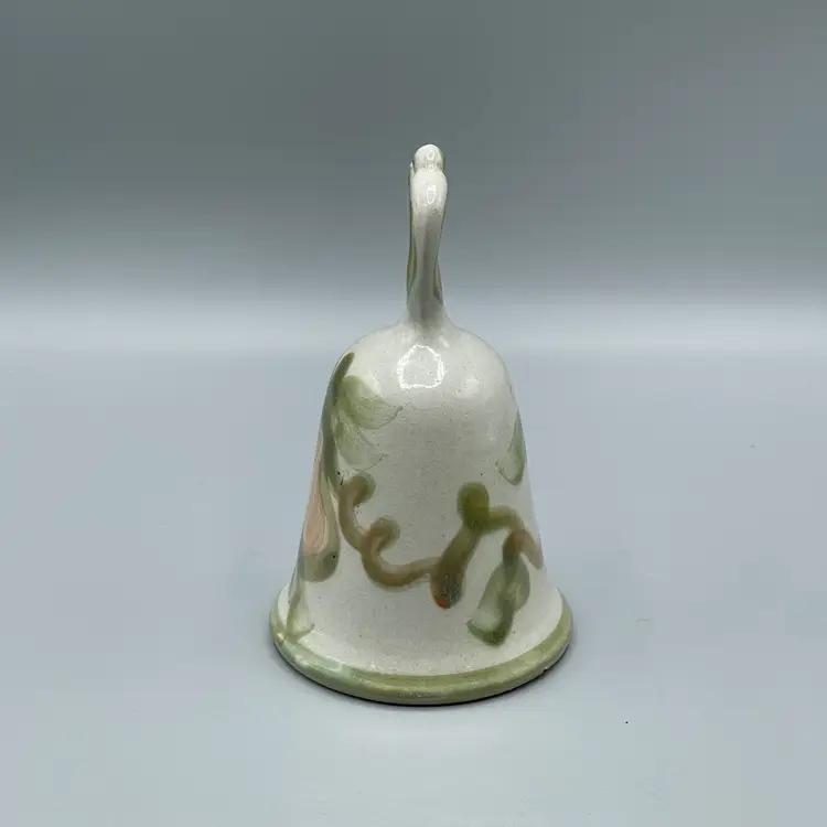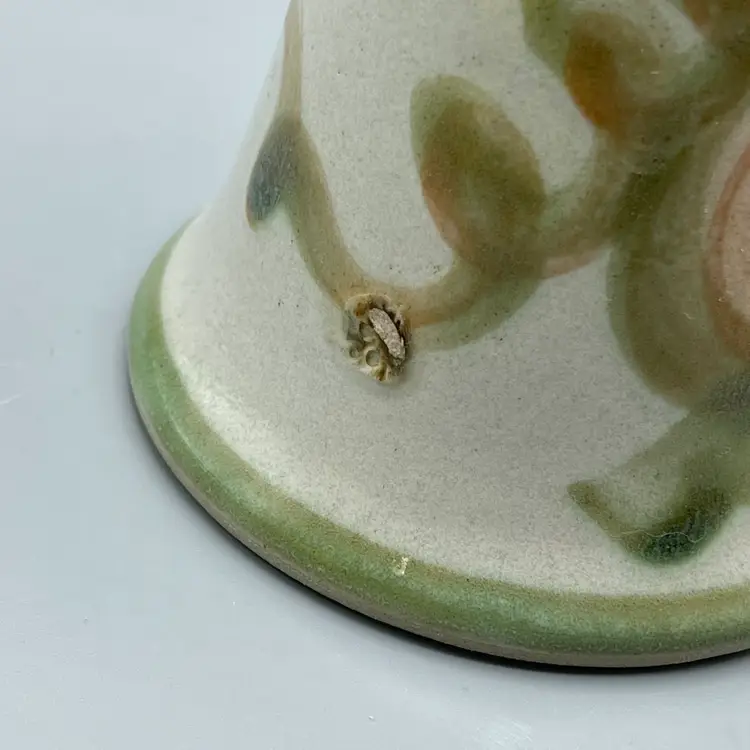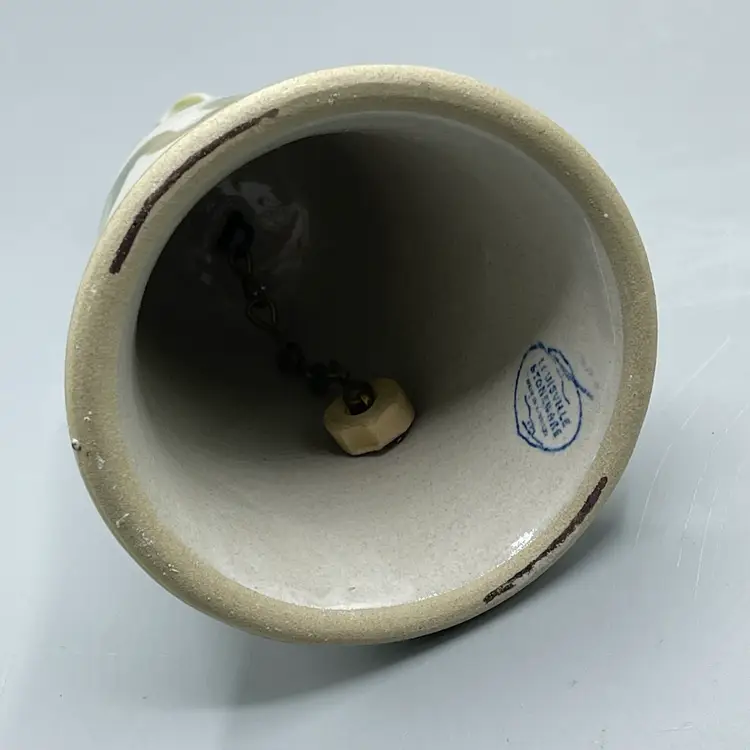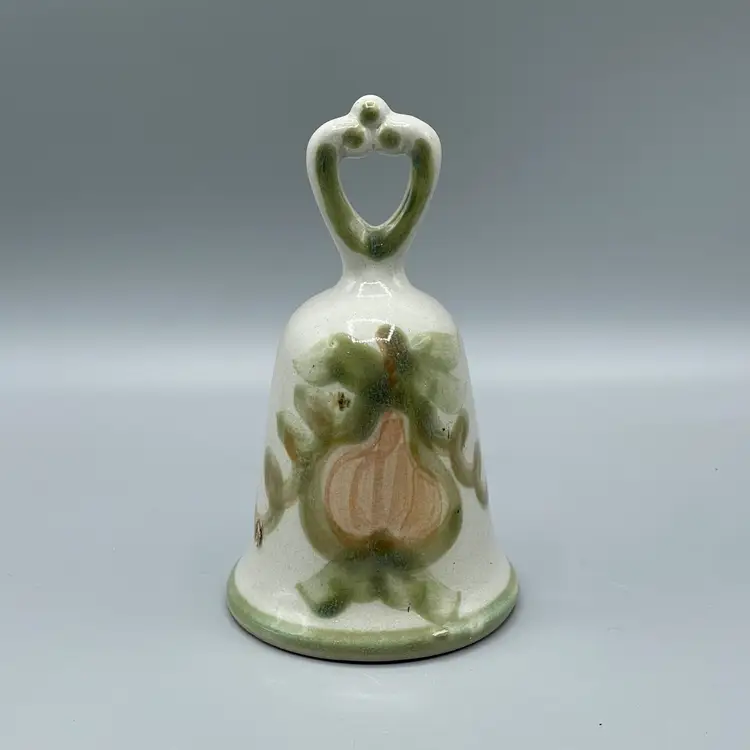 This adorable pottery bell is made by Louisville Stoneware. It has green accents, vines, leaves and a pinkish tan pear as the feature. There are no chips or cracks but there are two spots of glaze imperfections that would have happened during production. This bell is 6-1/8 inches tall and about 3-1/2 inches wide.