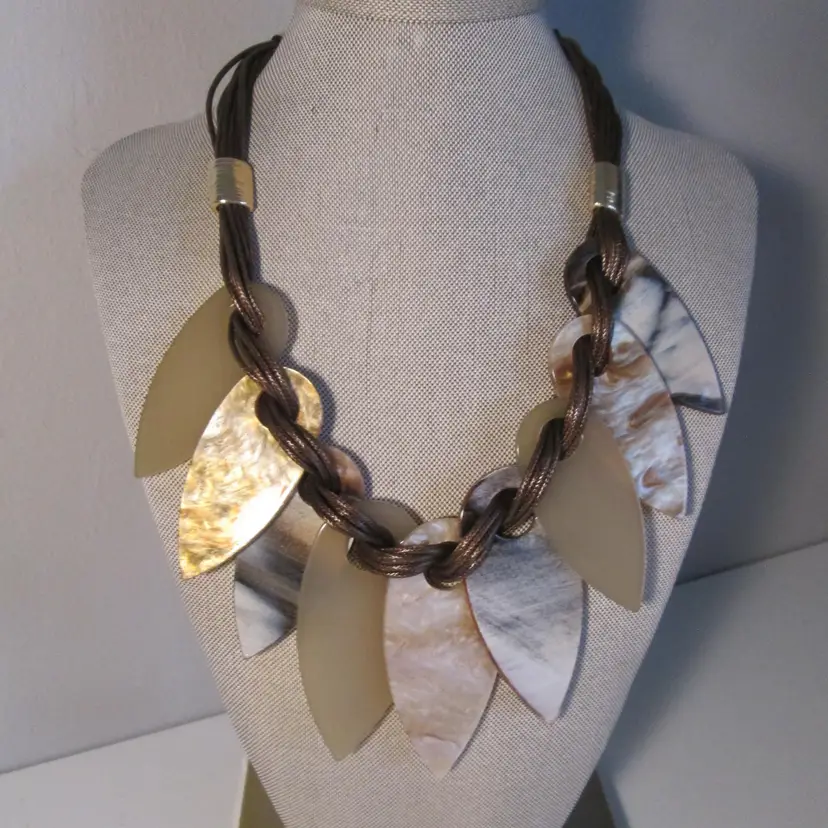 Vintage Lucite acrylic faux Petals statement necklace. I love the variation with some pieces are marbled, others are marbled and frosted. The length is 18" to 20" with adjustment.