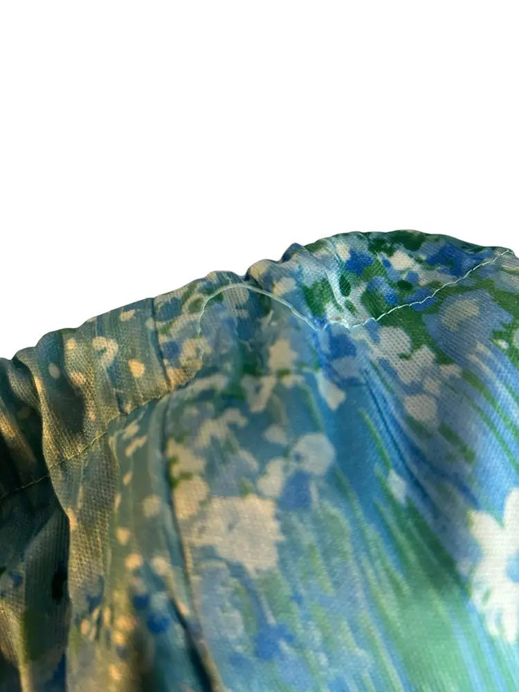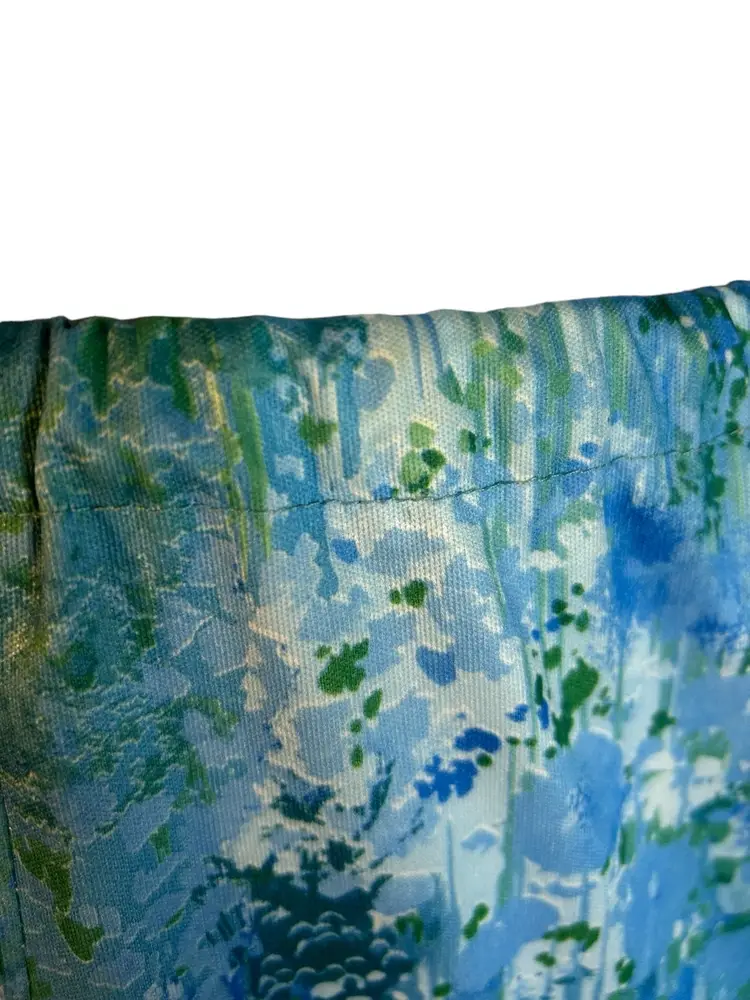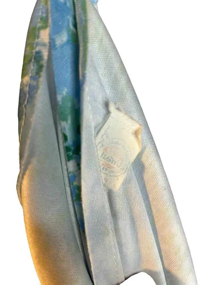 Only union label but no other info: Feels like polyester. Blues/Greens/White - all different flowers, very pretty!