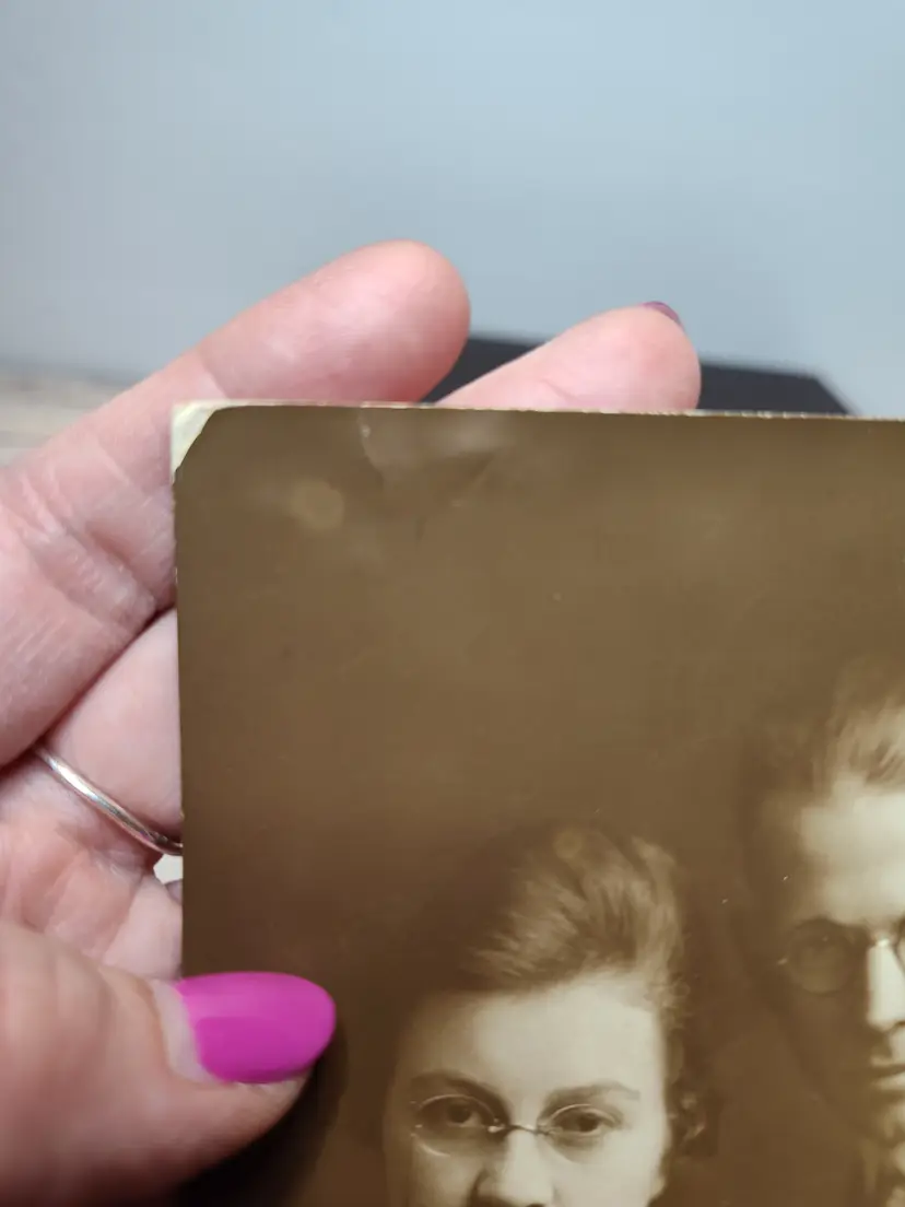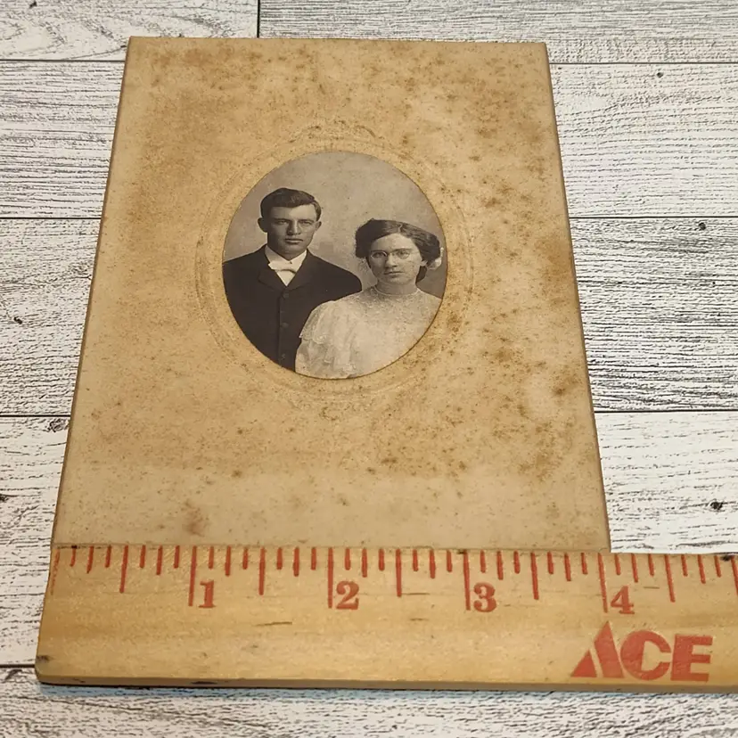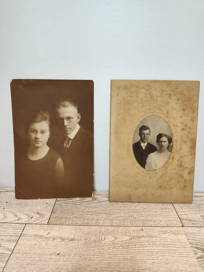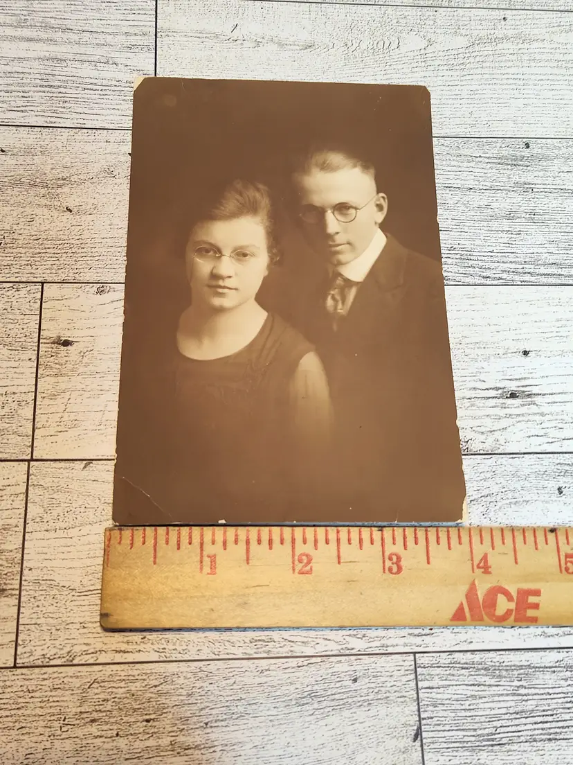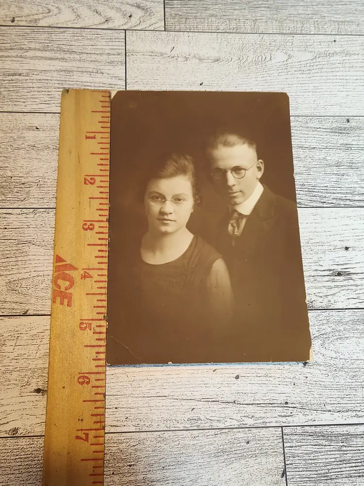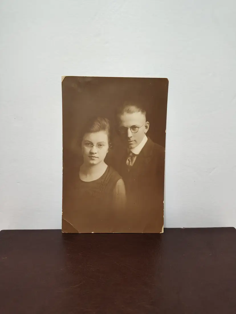 Vintage photo of young couple has some wear around the edges. On Photo paper