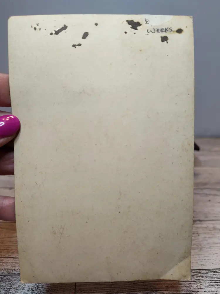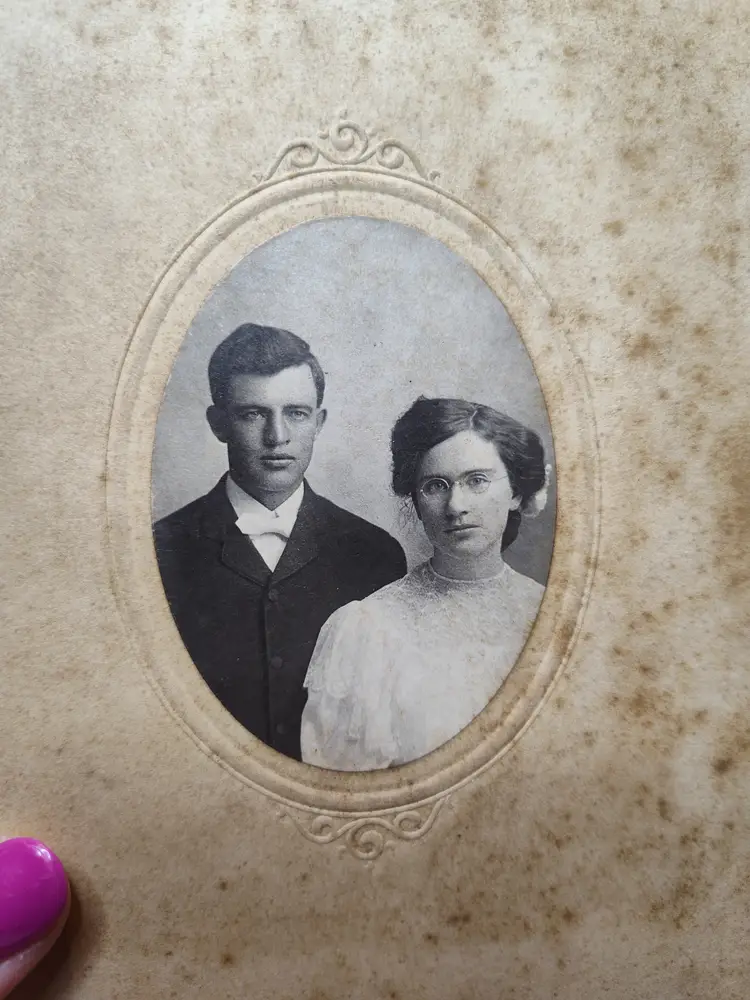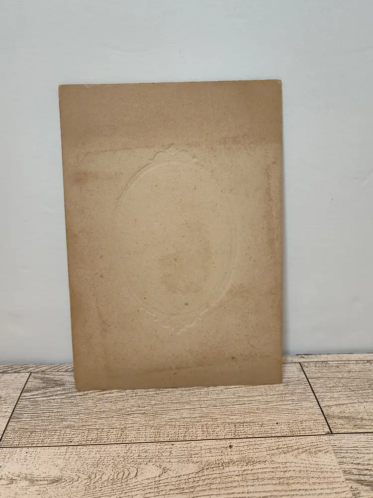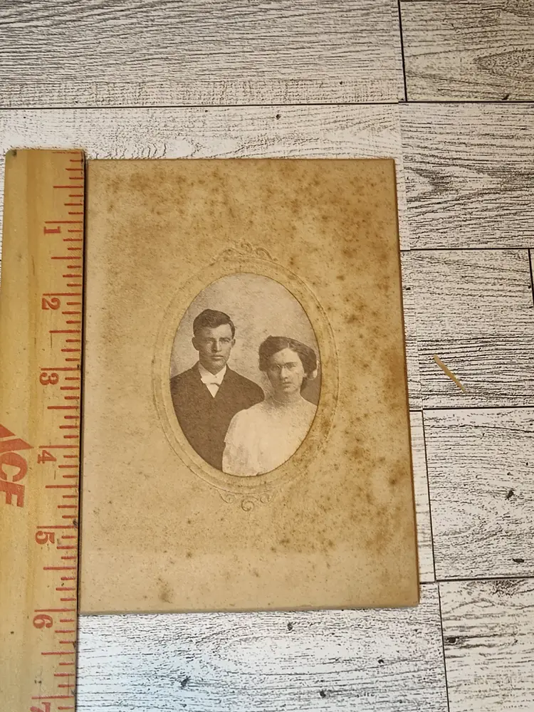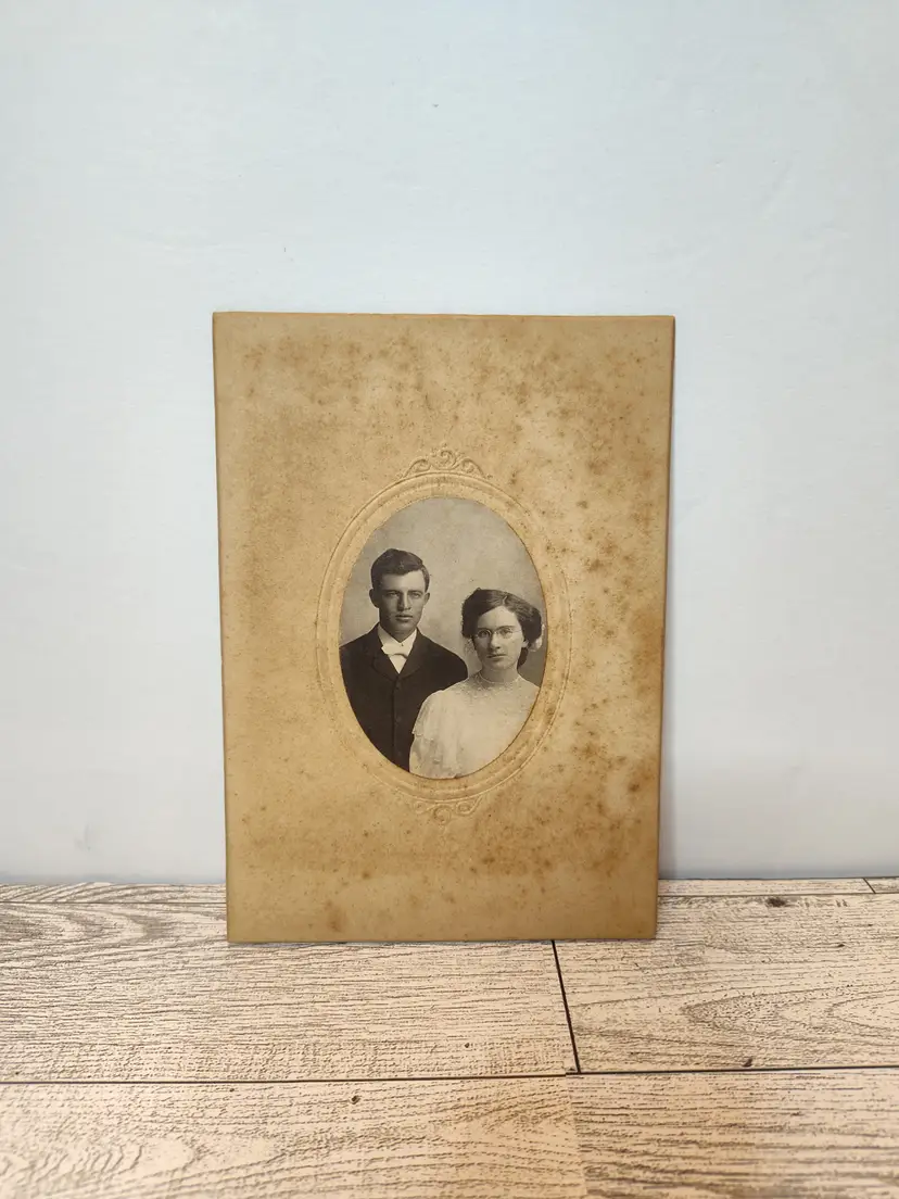 Antique embossed cabinet card of young couple has noted aging/moisture marks on cardboard. This card came from a set of with a cards dating 1890-1918