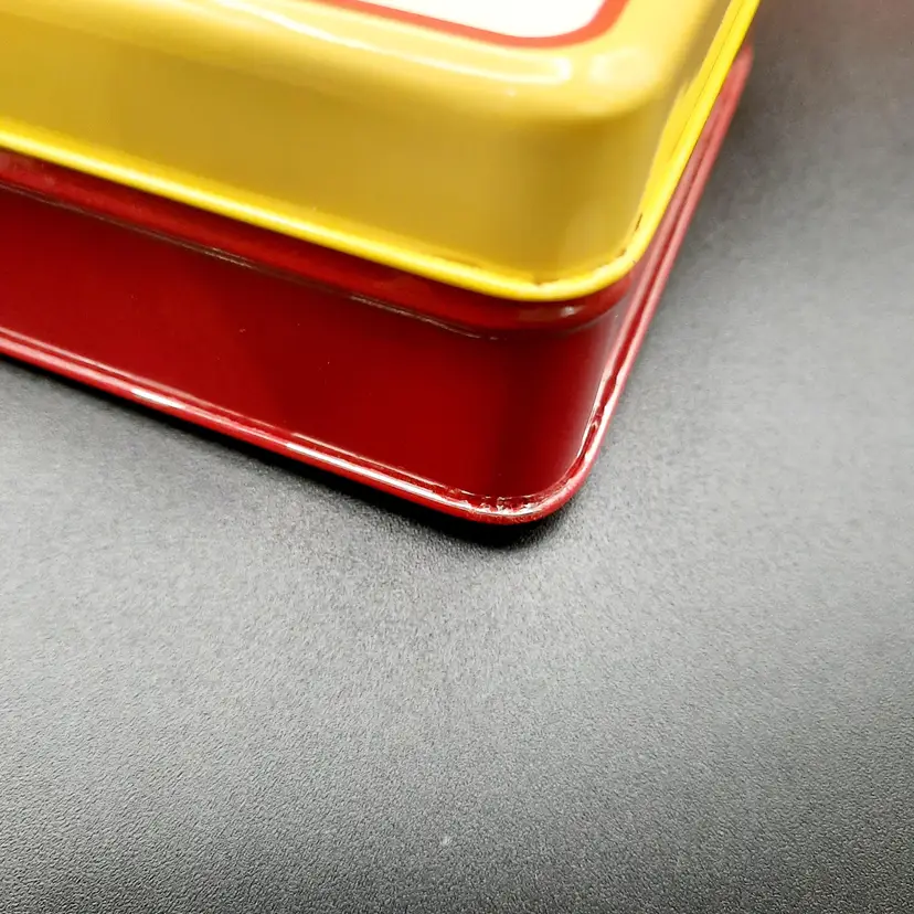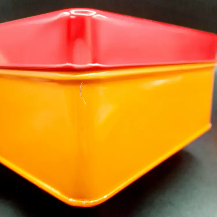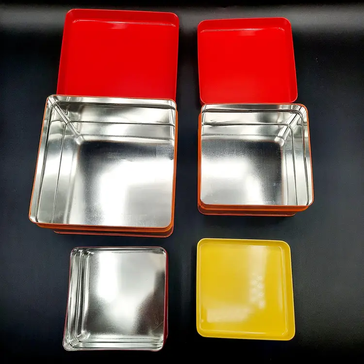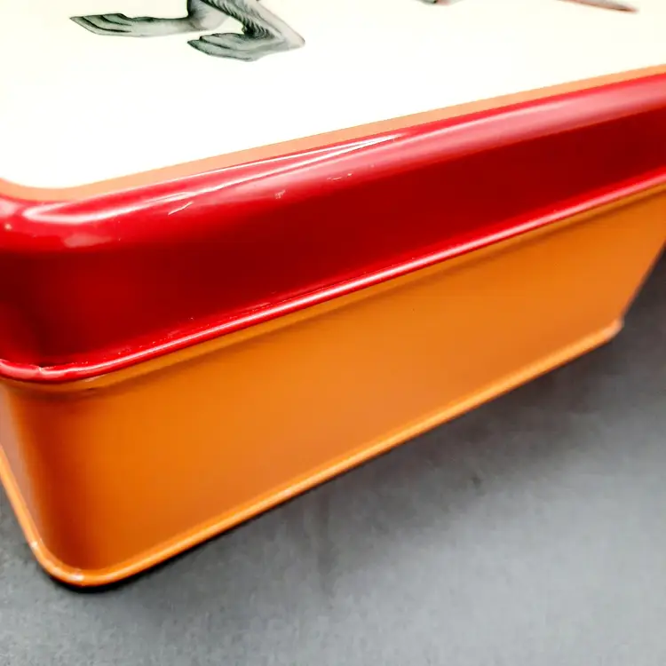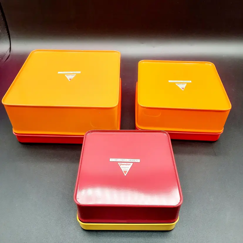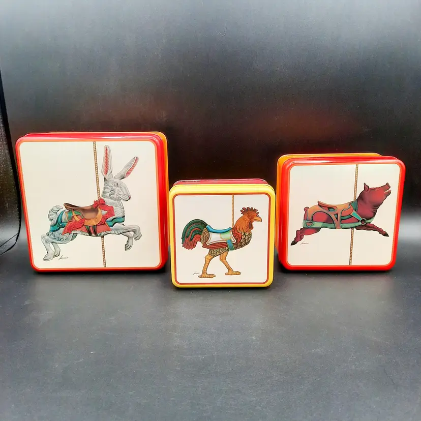 The colorful, unique metal tins are in overall great condition for their age, a few small dents and some light paint loss on edges. Rabbit tin - 6"W x 3" H Pig tin - 5"W x 2 1/2"H Rooster tin - 4"W x 2"H