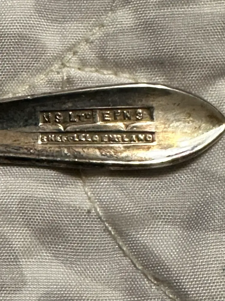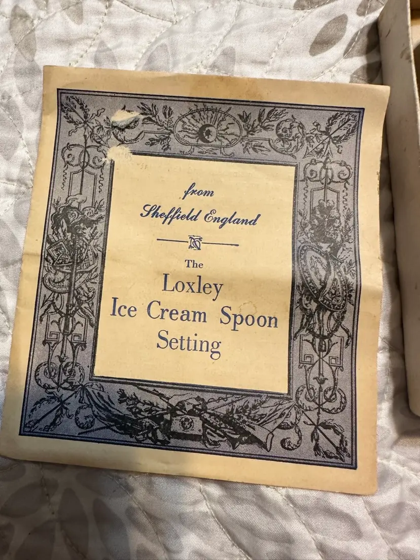 Lovely set of 6 vintage ice cream spoons from Sheffield England. Original box bottom and paperwork. Tarnish present.