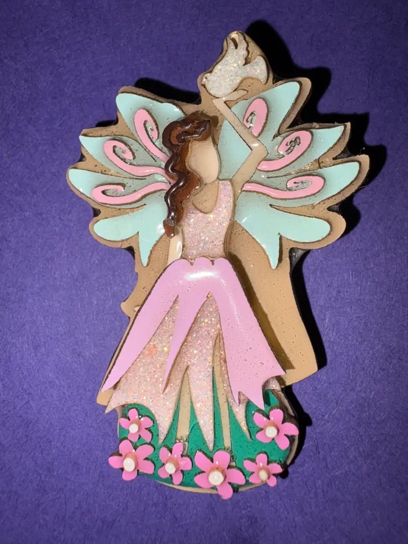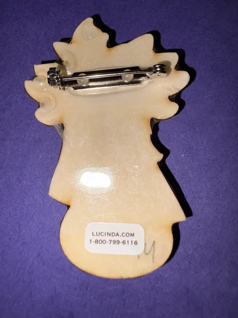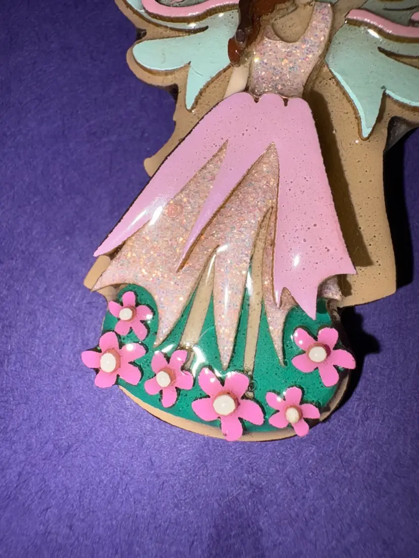 Pin is very detailed and dimensional and is in excellent vintage pre-owned condition. This is a lovely Pink Shimmering Angel with aqua wings is holding a white glitter dove. Pretty pink flowers grow at her feet. Includes ‘Lucinda.com’ sticker on back.