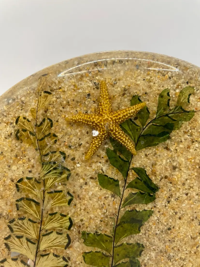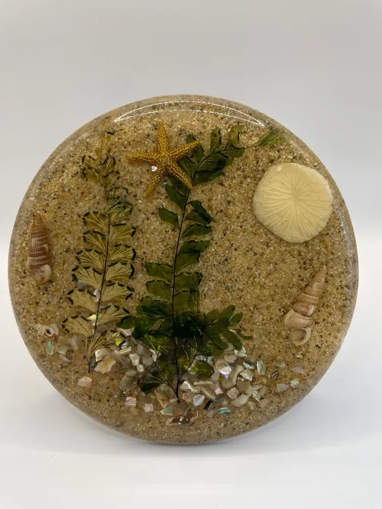 Vintage Lucite 5.5" Round Trivet with Abalone Shells Sand And A Starfish. The 2nd picture shows a small nick.