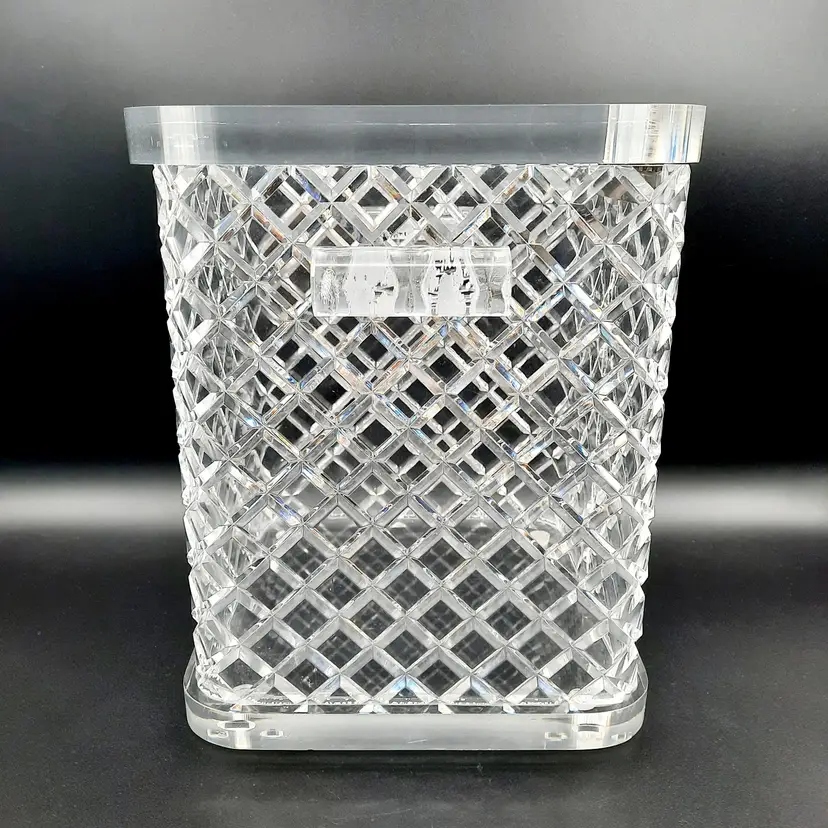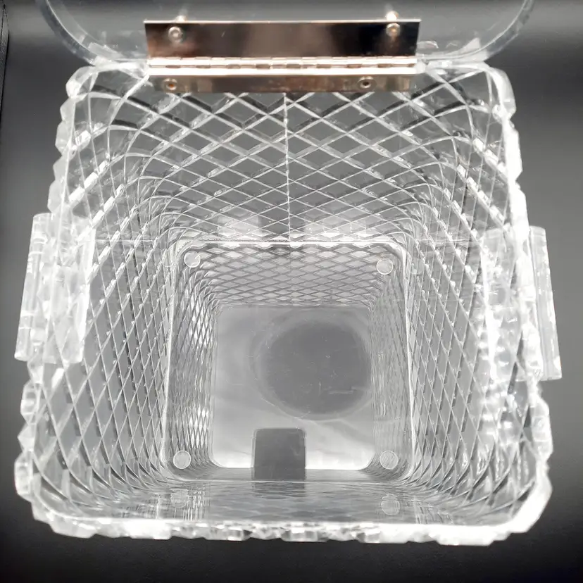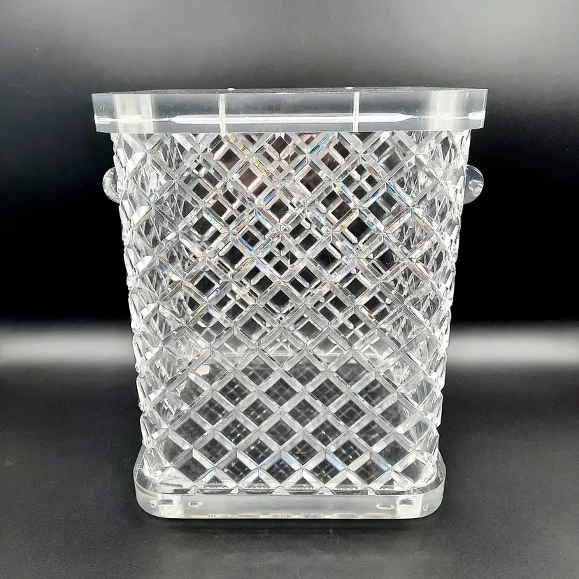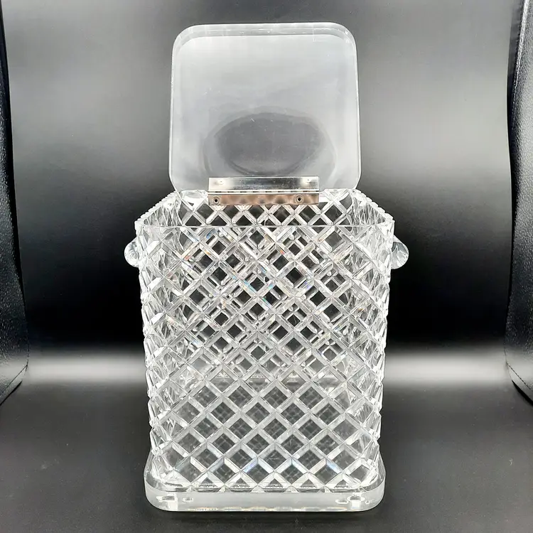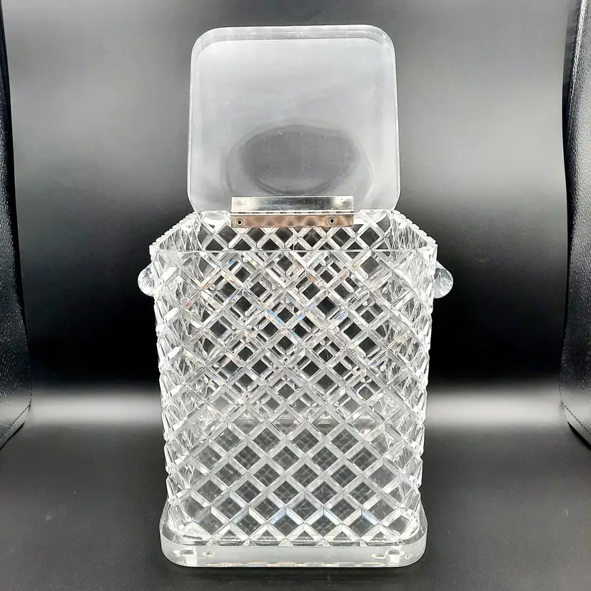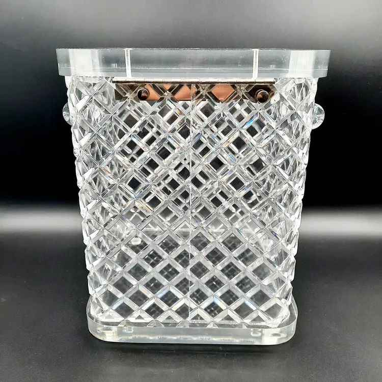 Fantastic ice bucket is 9 3/4"H x 8 1/2"W. Overall good condition, does have some cracking on handles (one more than the other), light scratches and flea bites and some mineral buildup along bottom edge from ice. The design and facets in this sparkly piece help hide the flaws.
