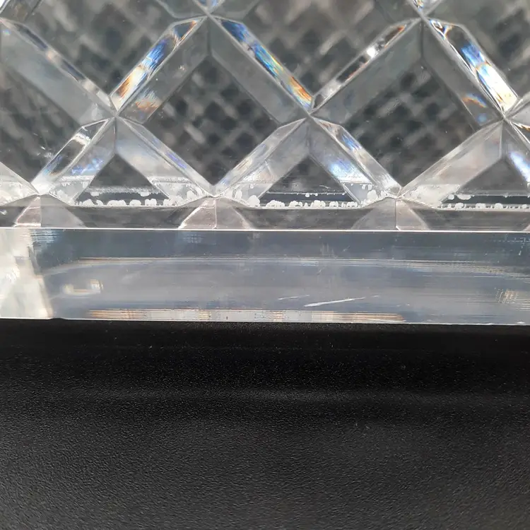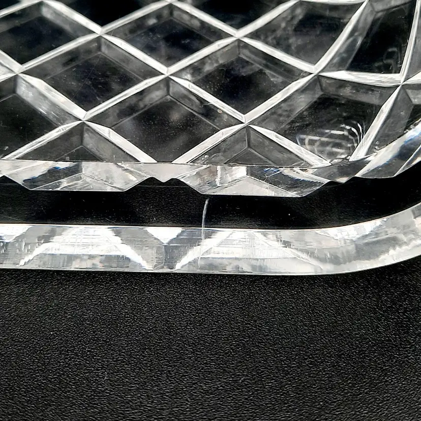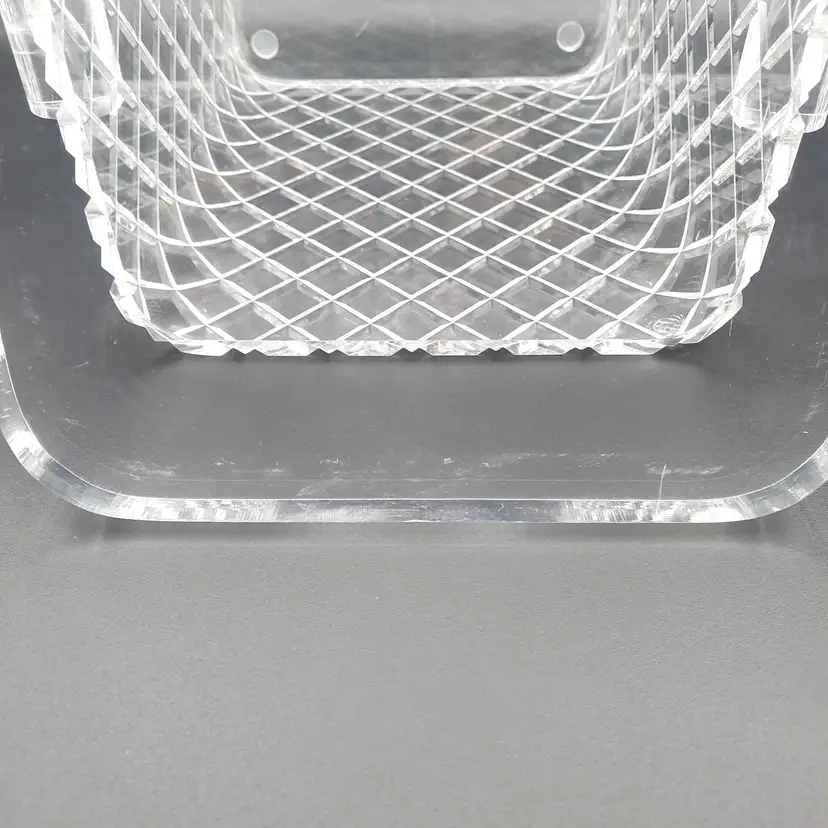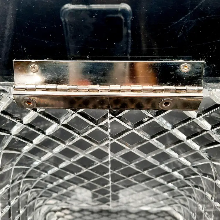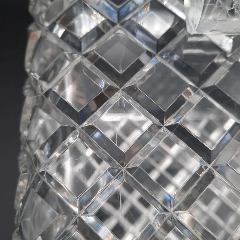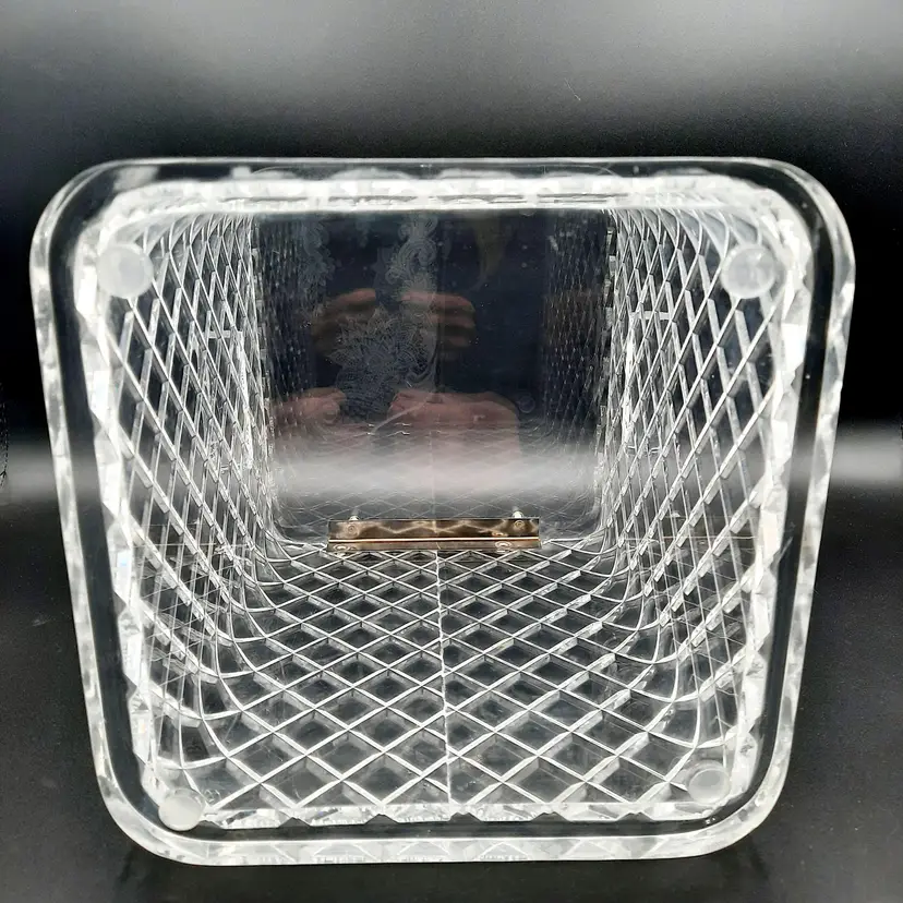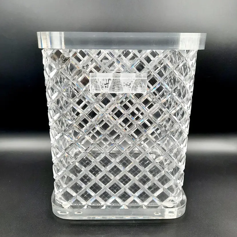 Fantastic ice bucket is 9 3/4"H x 8 1/2"W. Overall good condition, does have some cracking on handles (one more than the other), light scratches and flea bites and some mineral buildup along bottom edge from ice. The design and facets in this sparkly piece help hide the flaws.