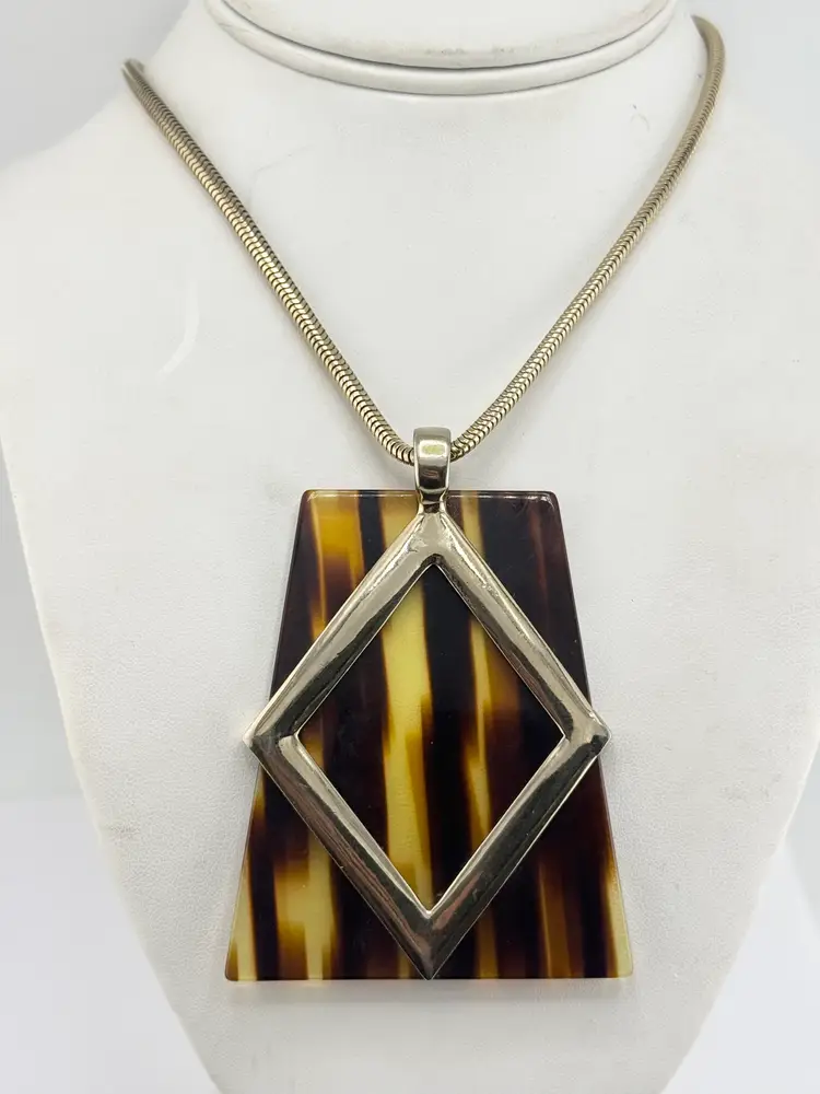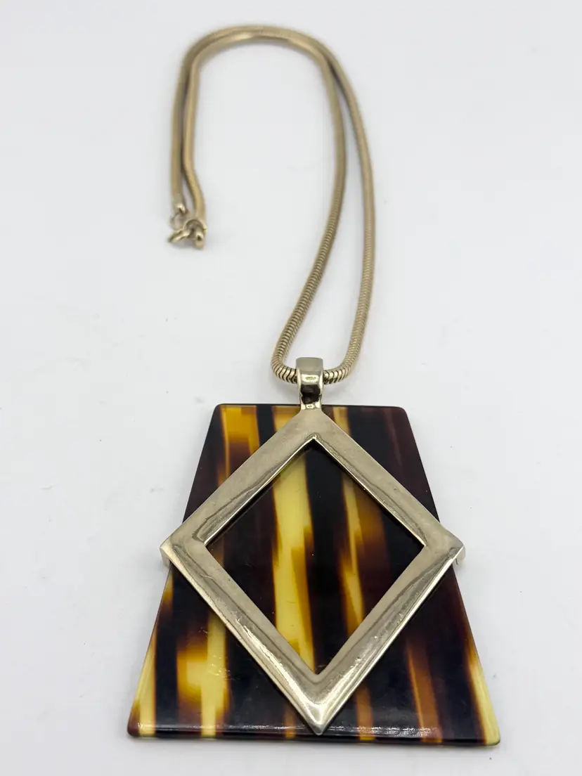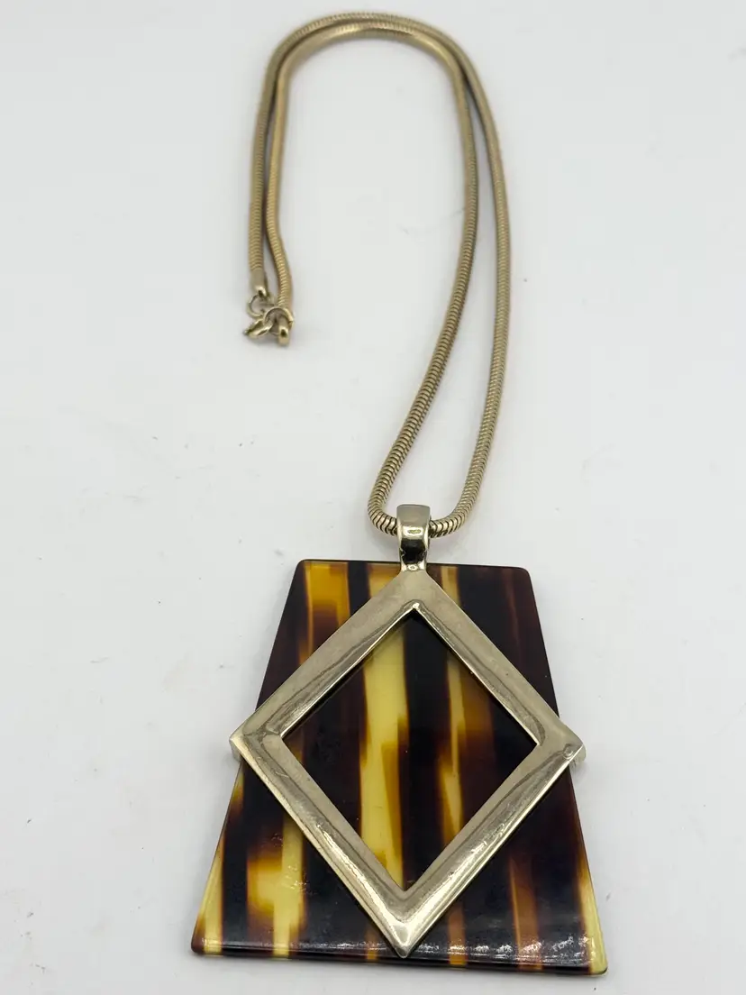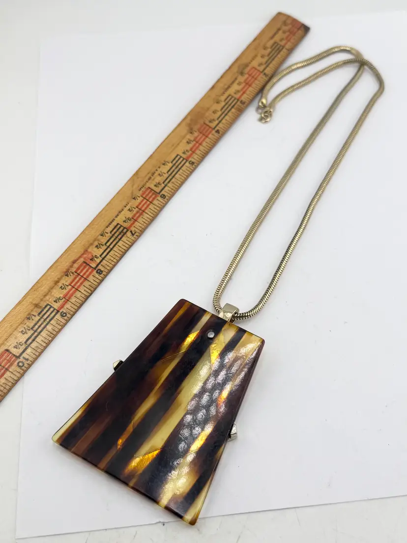Vintage lucite animal print pendant necklace. Gold tone snake chain with hanging large lucite pendant. Vintage pendant necklace. MN52GH.