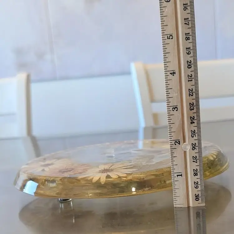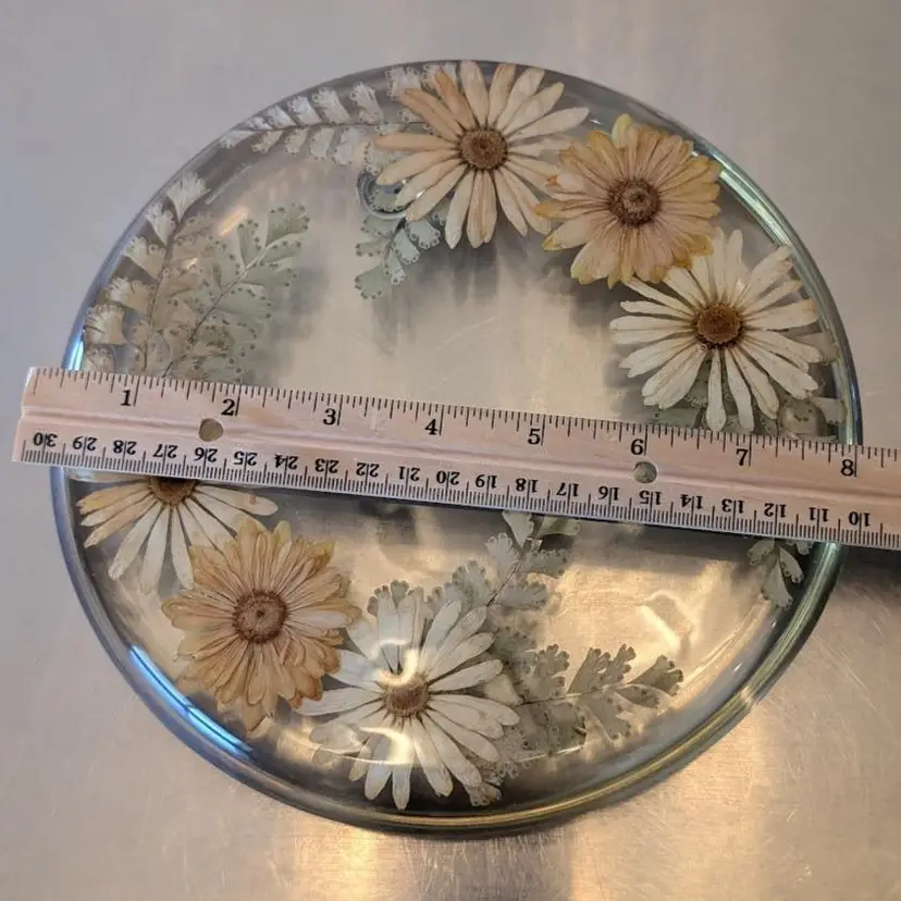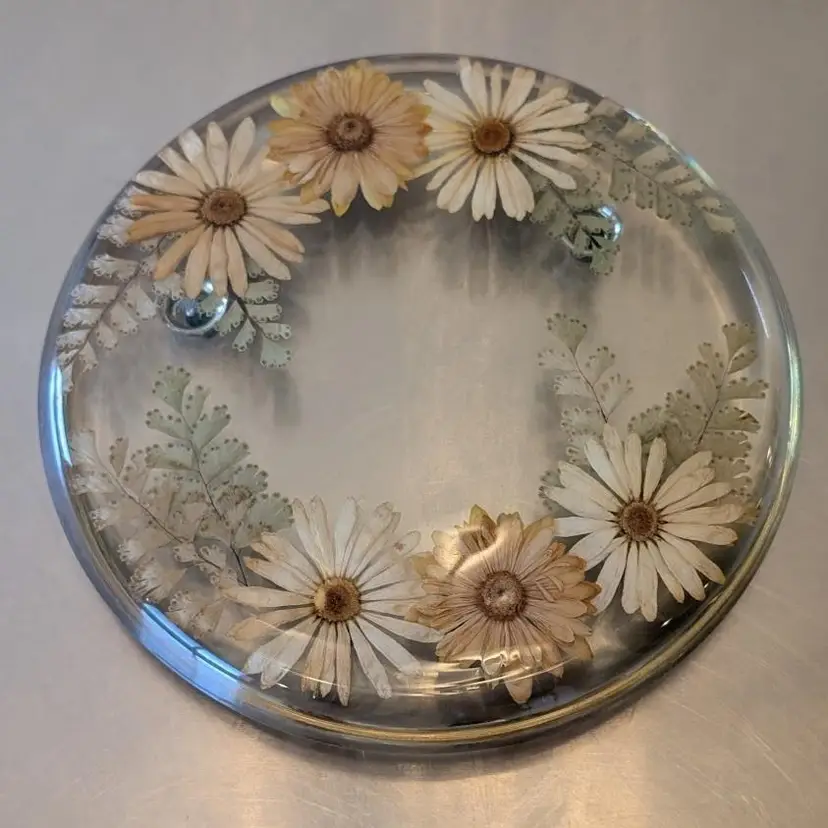 Retro, footed lucite trivet with dried flowers and leaves. In used condition with minimal scratching. Measurements ~ 8 x 1"