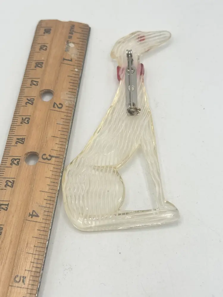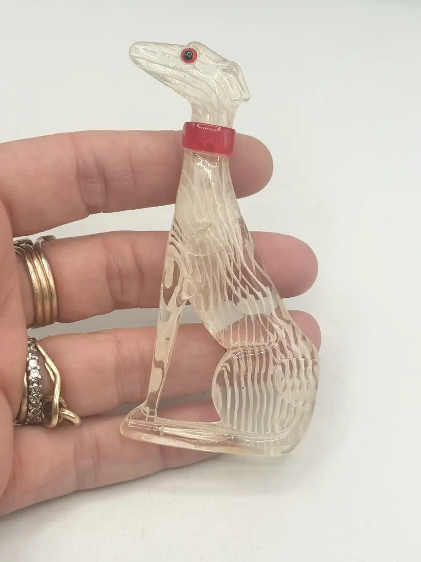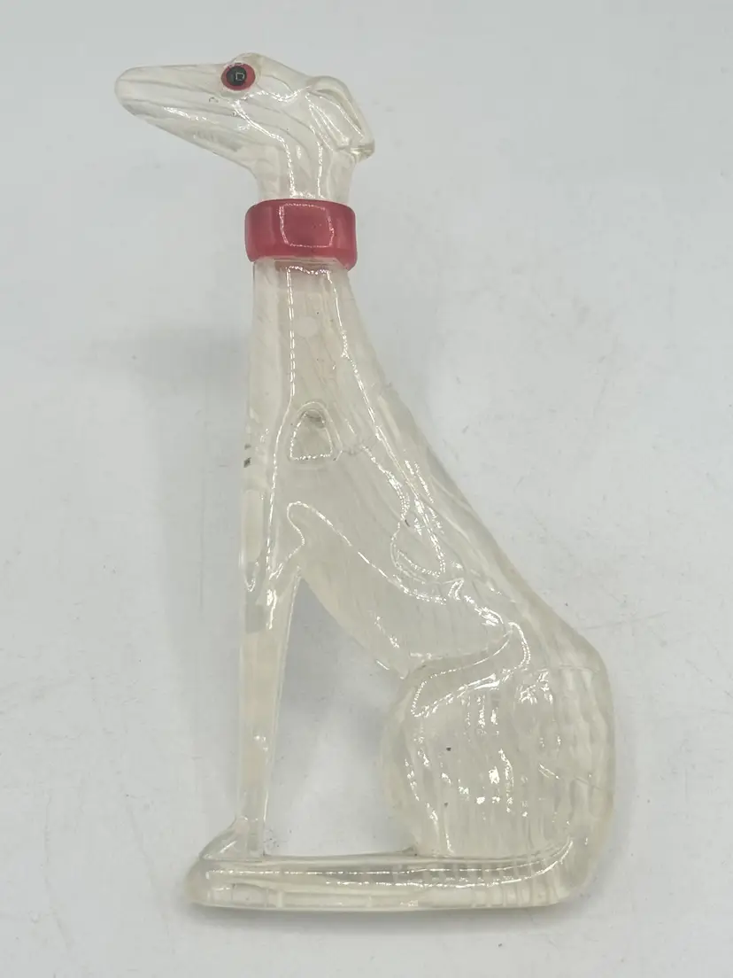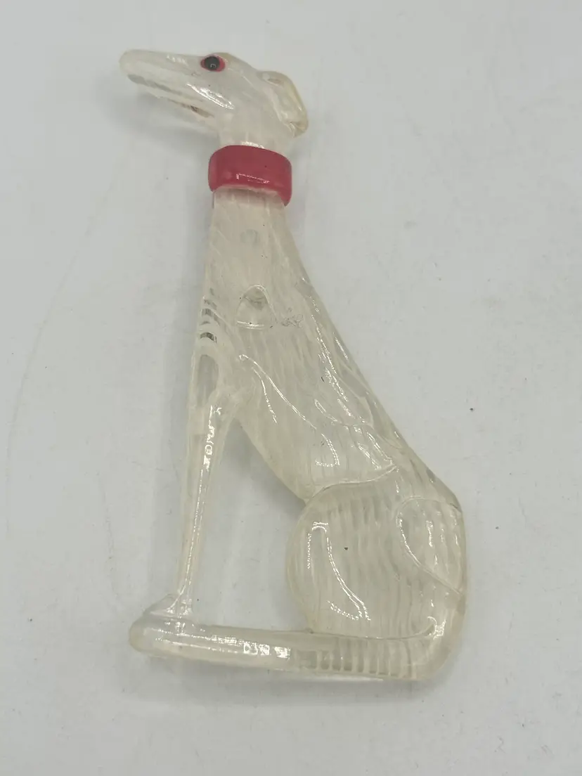 Vintage Lucite greyhound dog brooch pin. Clear lucite with red collar. Sitting greyhound dog. Lucite vintage brooch pin. MN55GH.