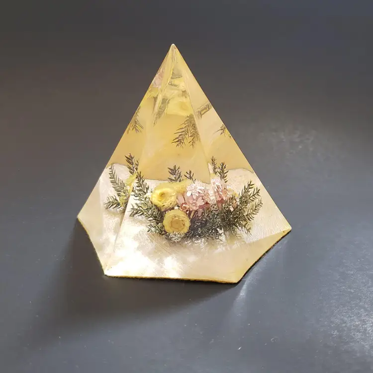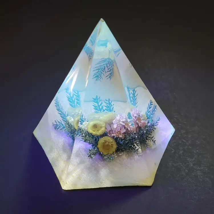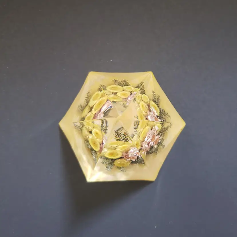 Super cool lucite paperweight with dried flowers encased inside. It is UV reactive shown in the second photo. 3.5 in bottom to top, 3.25 in across base, 6 faceted. Great condition, no chips or cracks. Can't tell if the slight yellowing is from age or the choice of color of the felt on the bottom.