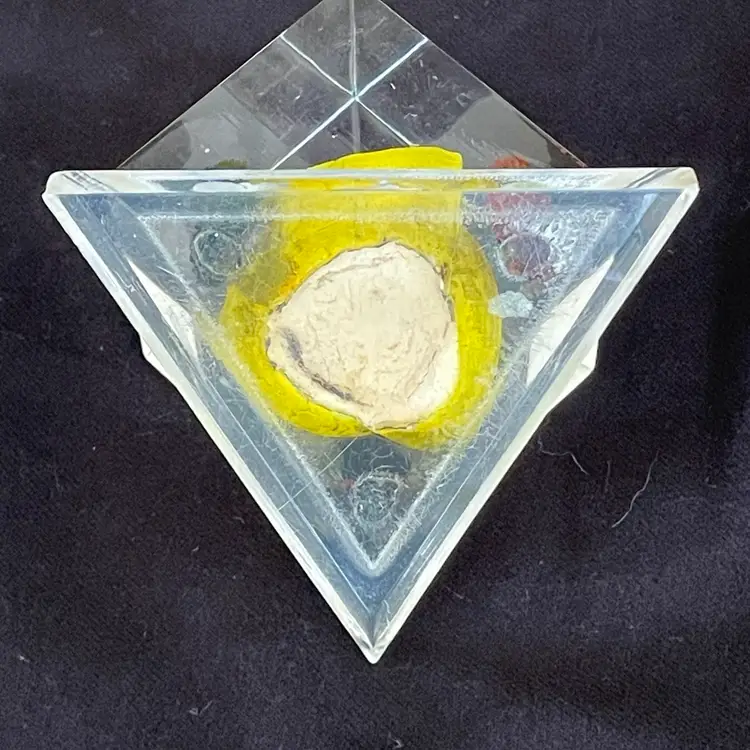 It measures approximately 2” on a 3” triangle base and is in good condition. The Lucite is clear and has very minimal to no scratches.