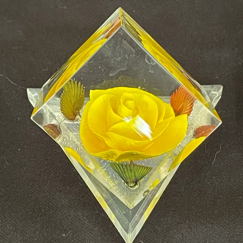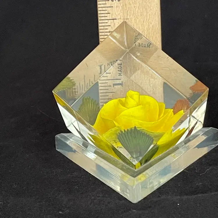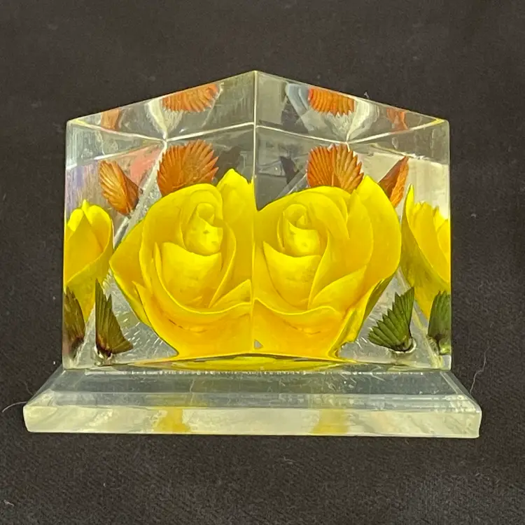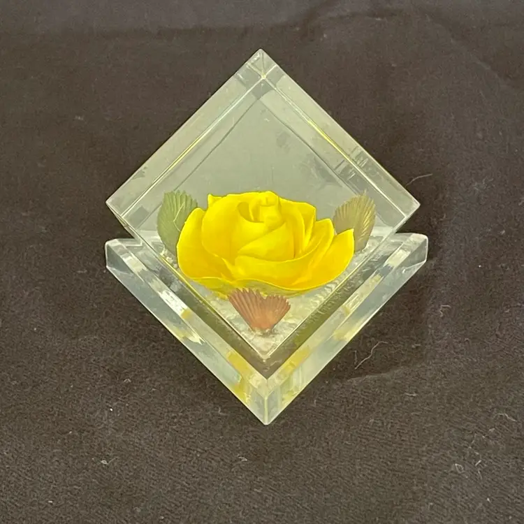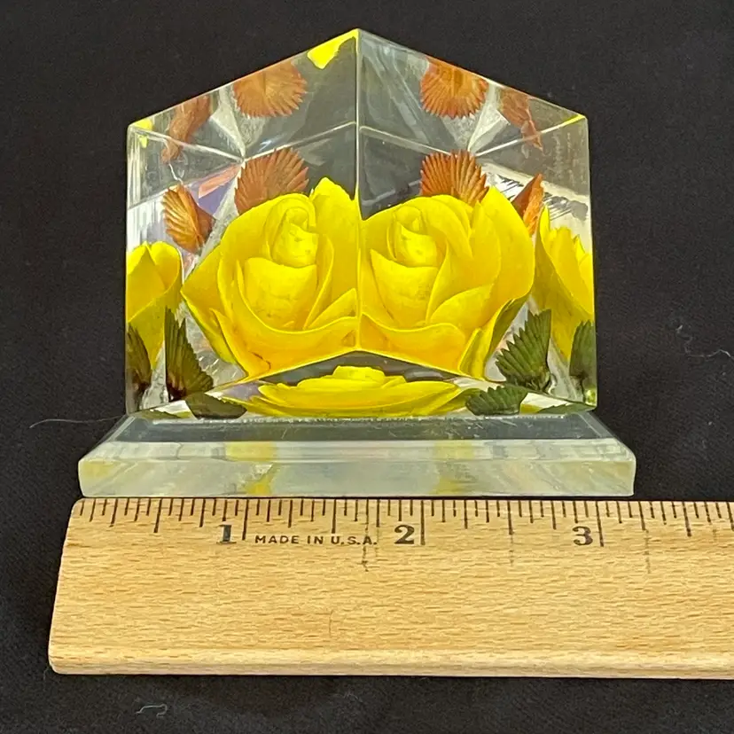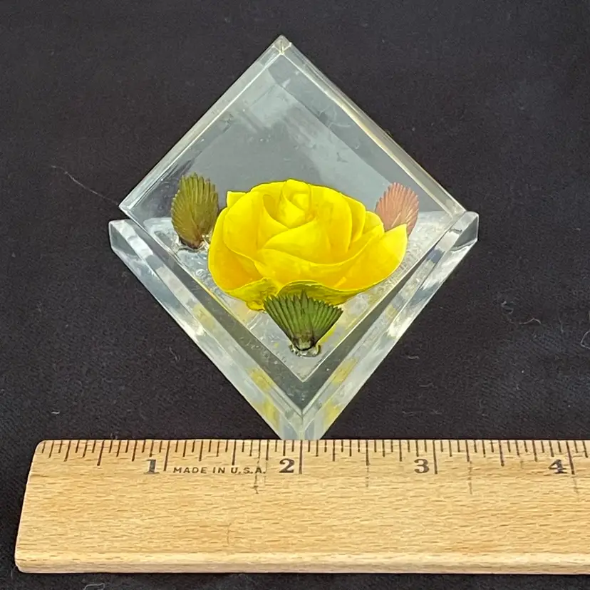 This vintage Lucite paperweight captures an intricate and beautiful yellow rose sculpture.