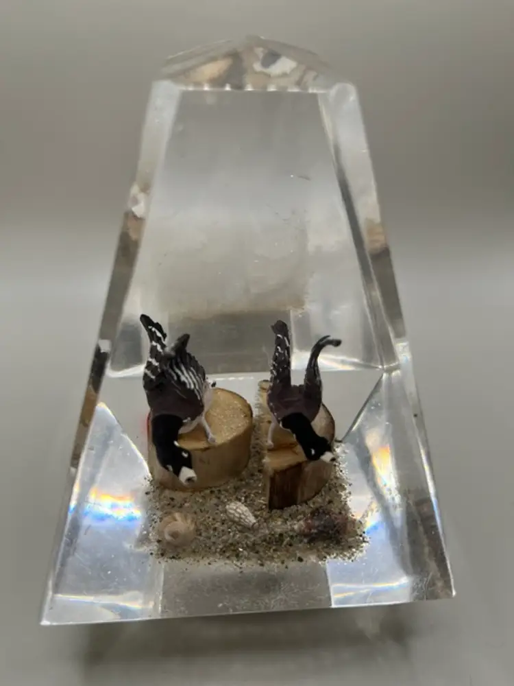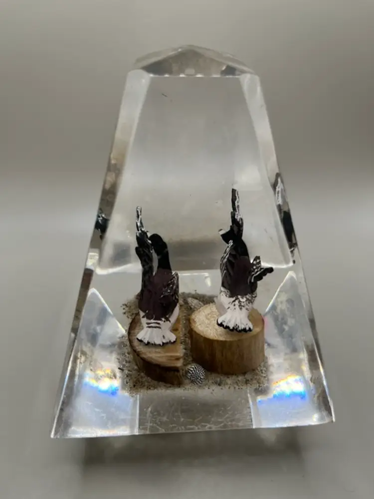 Features a three dimensional scene of Canadian geese set against a naturalistic base made of wood, sand, pebbles and seashells. Measures Measures 5.25 inches tall
