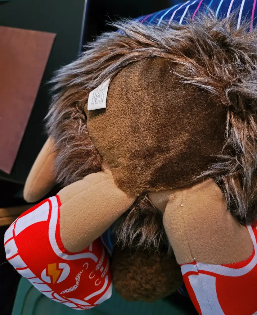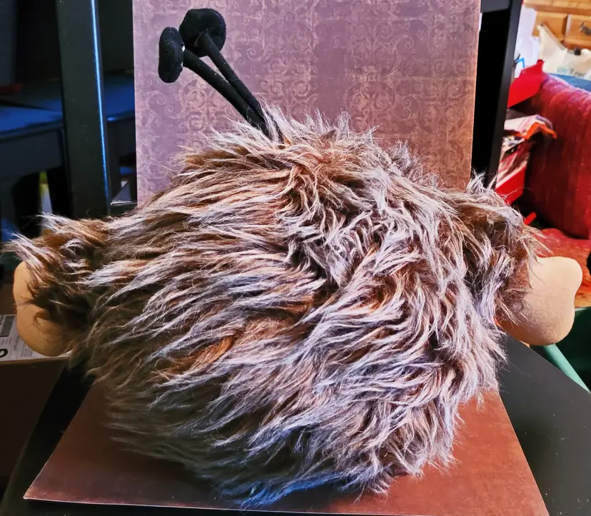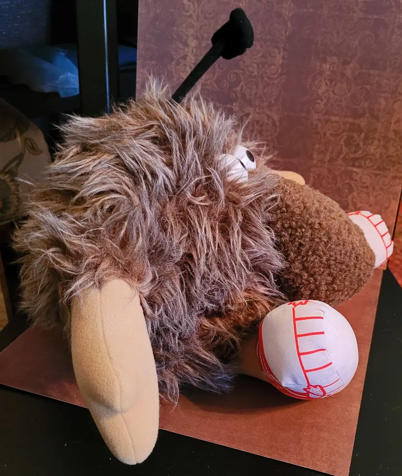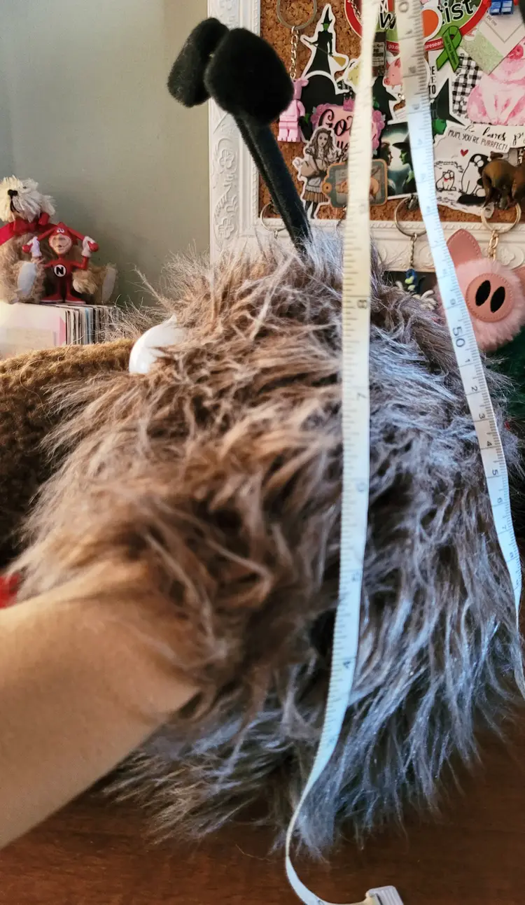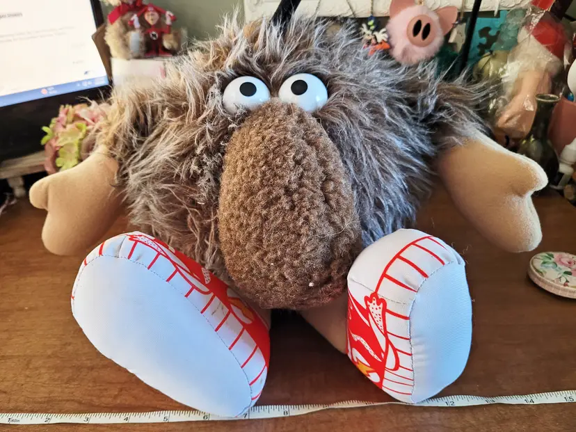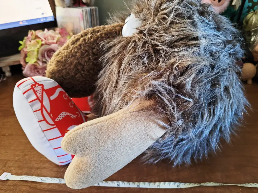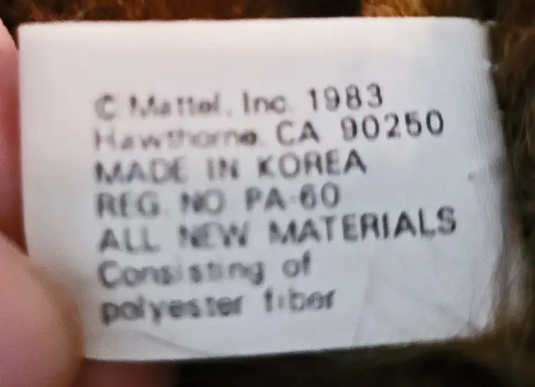 Hallmark Cards, Inc. Mattel, Inc. Made in Korea. From a smoke free home, please refer to the pictures for its condition and size. Approx. 12x10x8. However, if you measure hand to hand he is 16 inches wide.