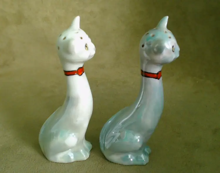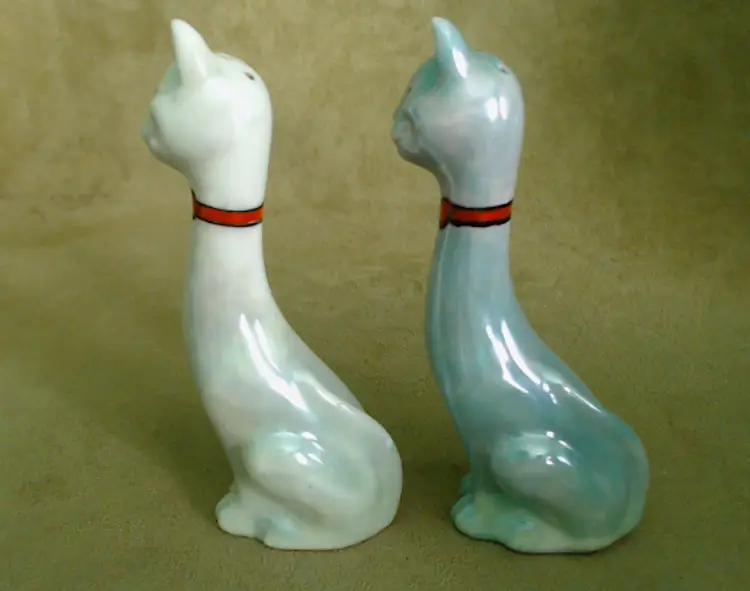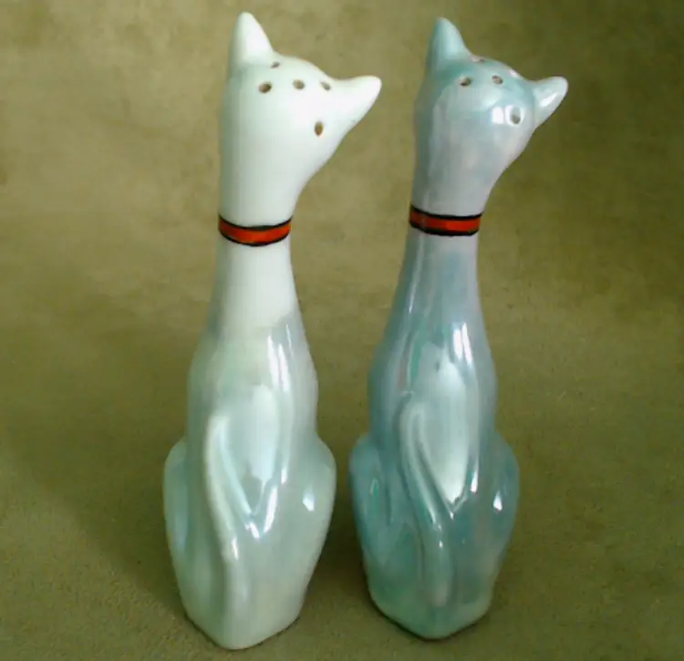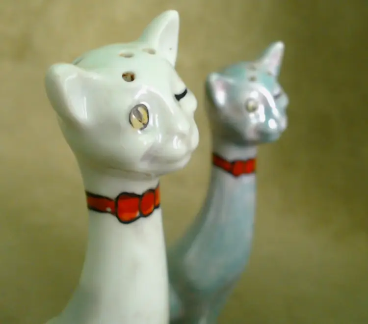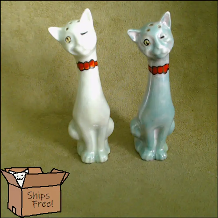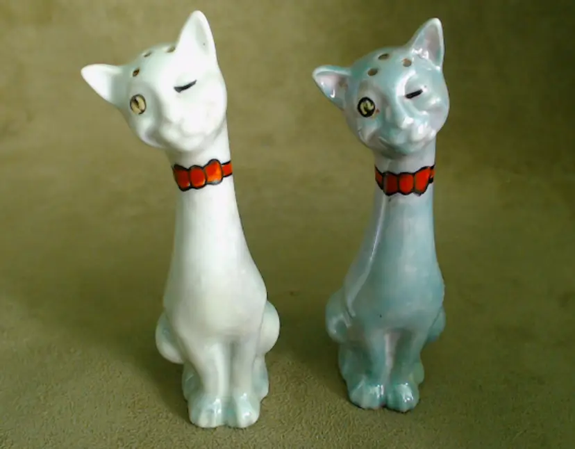 This is a vintage salt and pepper shaker set, shaped like some seriously stretched out cats! Made in Japan, probably during the 1930s, these kitties have both style and attitude! Both shakers have been finished with a shiny green lustered coating, although one was given a much lighter coating, probably so you could tell them apart at a glance. Each of these smiling cats was also given a dapper bow tie - How fancy! Condition: This pair of cats is in Good shape! There are no chips, cracks, or any structural damage to either shaker. Both cats do have some wear to their lustered finish. The darker green kitty has a small wear spot on his tail. The lighter kitty has wear on his knee and especially around his neck. It looks like there was almost an ombré effect originally, as his bowtie is still bright and unworn, yet the luster directly around that and up on his face is so pale. You can tell that this pair was loved and used back in the day! Both still have their original corks, but one is sadly inside of the shaker... Size: Each cat measures about 1¼" across, is 1¾" long, and sits 4¼" tall. These porcelain pretties have some height!