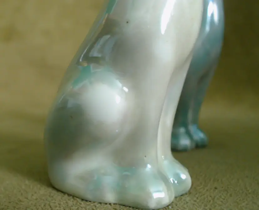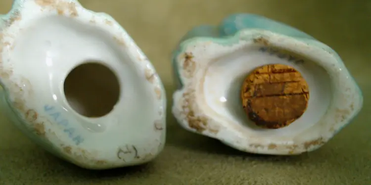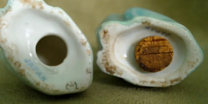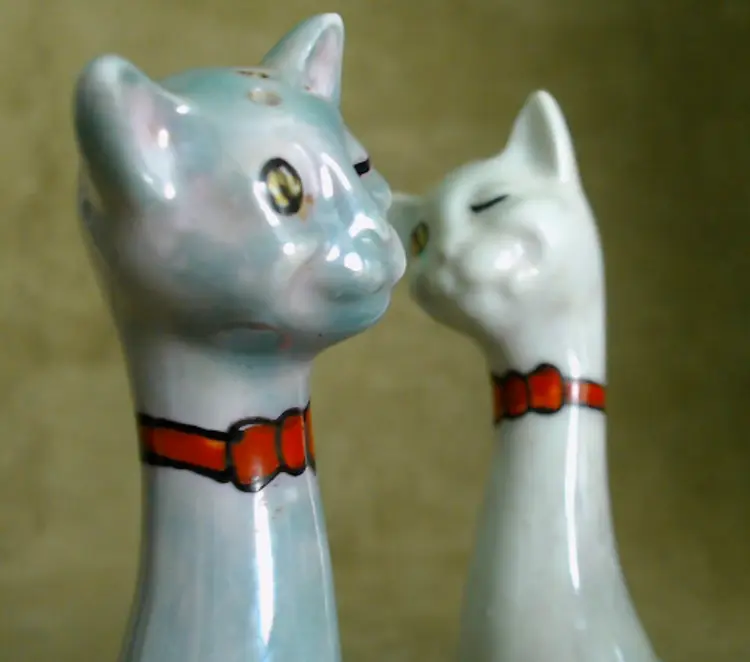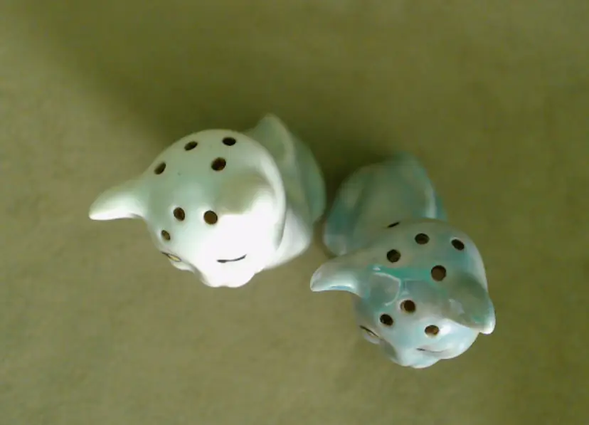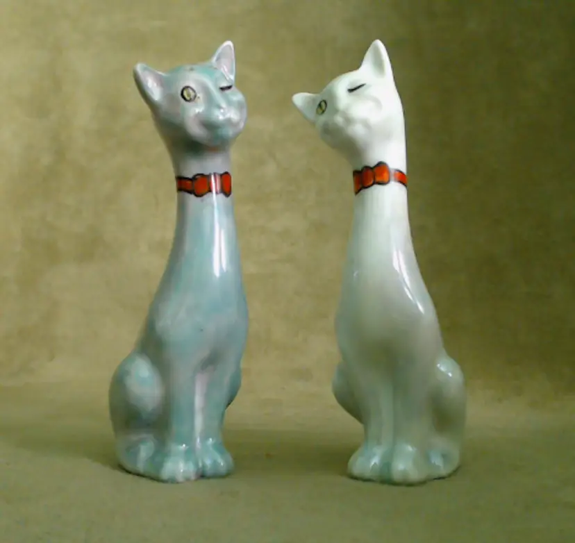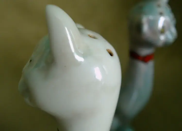 This is a vintage salt and pepper shaker set, shaped like some seriously stretched out cats! Made in Japan, probably during the 1930s, these kitties have both style and attitude! Both shakers have been finished with a shiny green lustered coating, although one was given a much lighter coating, probably so you could tell them apart at a glance. Each of these smiling cats was also given a dapper bow tie - How fancy! Condition: This pair of cats is in Good shape! There are no chips, cracks, or any structural damage to either shaker. Both cats do have some wear to their lustered finish. The darker green kitty has a small wear spot on his tail. The lighter kitty has wear on his knee and especially around his neck. It looks like there was almost an ombré effect originally, as his bowtie is still bright and unworn, yet the luster directly around that and up on his face is so pale. You can tell that this pair was loved and used back in the day! Both still have their original corks, but one is sadly inside of the shaker... Size: Each cat measures about 1¼" across, is 1¾" long, and sits 4¼" tall. These porcelain pretties have some height!