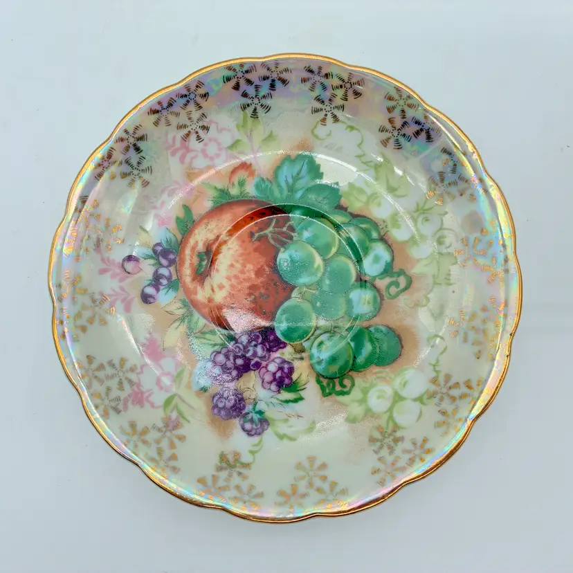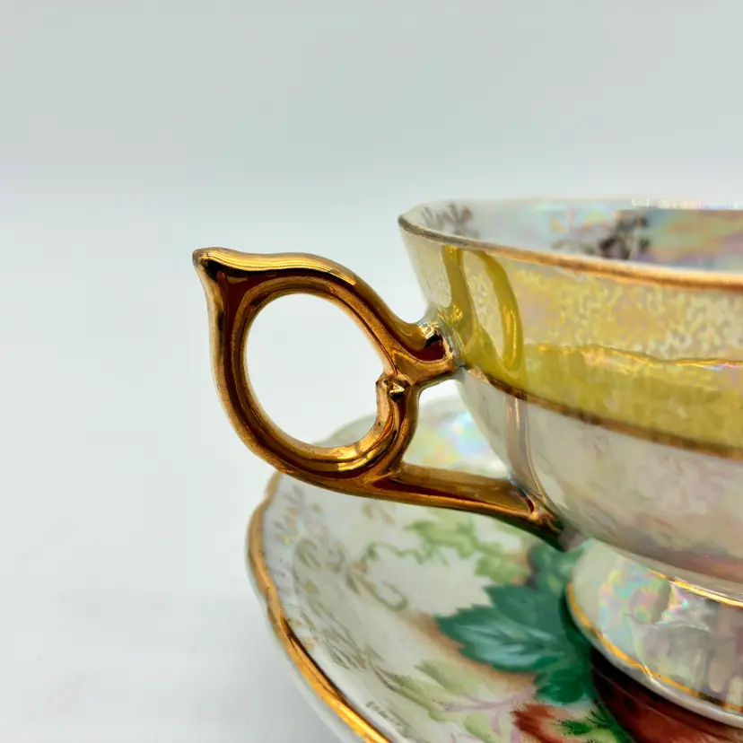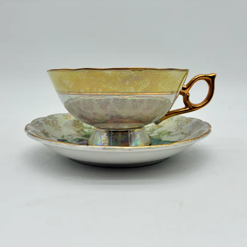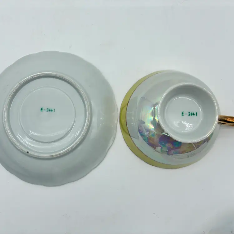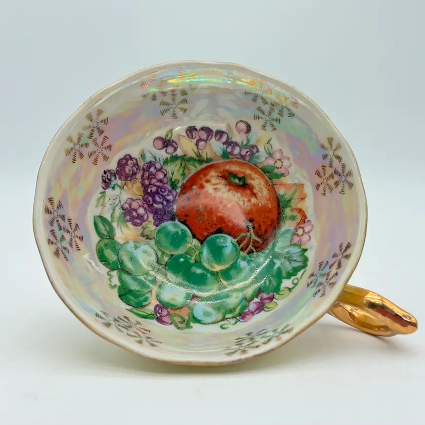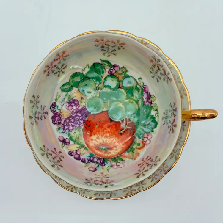 This stunning set has a pedestal tea cup and a saucer that is raised around its scalloped edges: it is finished in a lustreware glaze. The interior of both the cup and saucer feature a colorful, vivid design with an apple, grapes, and blackberries surrounded along the lip by gold motifs. The outside of the cup features a wide pale yellow band with gold edging. The elaborate handle is finished in gold. The E-3141 stamp on the bottom is inclusive and research conflicts whether this set was produced in England or in Japan: both countries were known for their production of fine china and lustreware during the 1950s. Not for use in the microwave. Hand washing is recommended. Excellent condition: no chips, cracks, or crazing. Measurements: cup lip 4 1/4"; cup height 2"; saucer width 5 1/2" Keywords: vintage tea cup, lusterware tea cup, footed tea cup, tea cup and saucer, vintage saucer, gold trim tea cup, fruit design tea cup, vintage china, collectible tea cup, decorative tea cup, tea party, retro kitchen, e-3141, vintage home decor