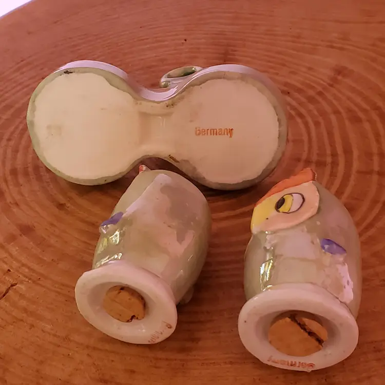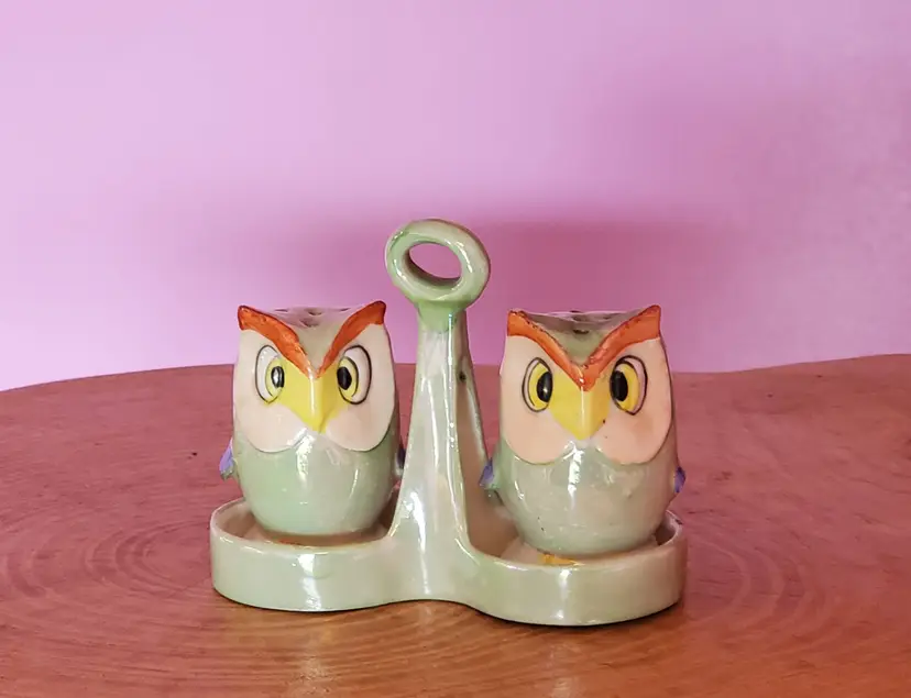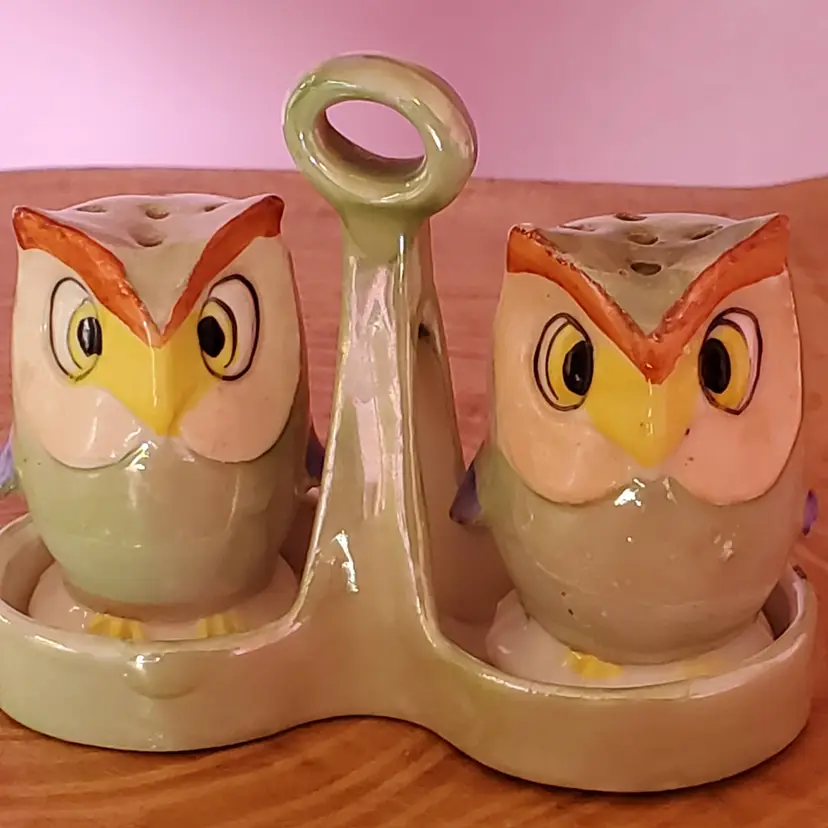 Vintage Lusterware Owl S&P Shakers With Their Tray-Made in Germany. Nice condition