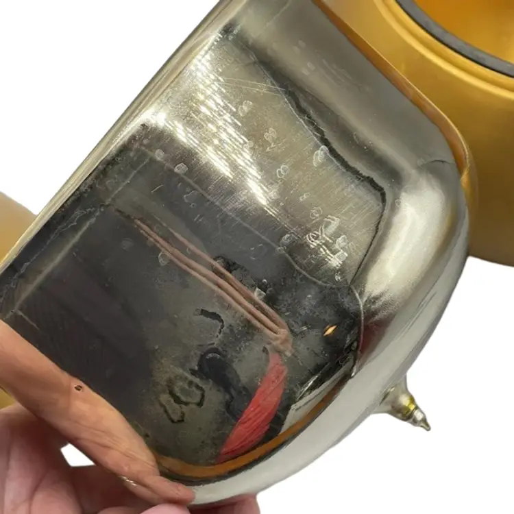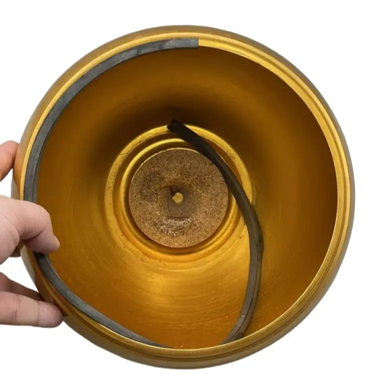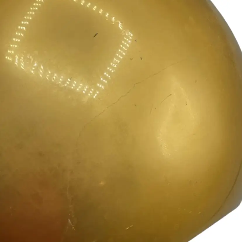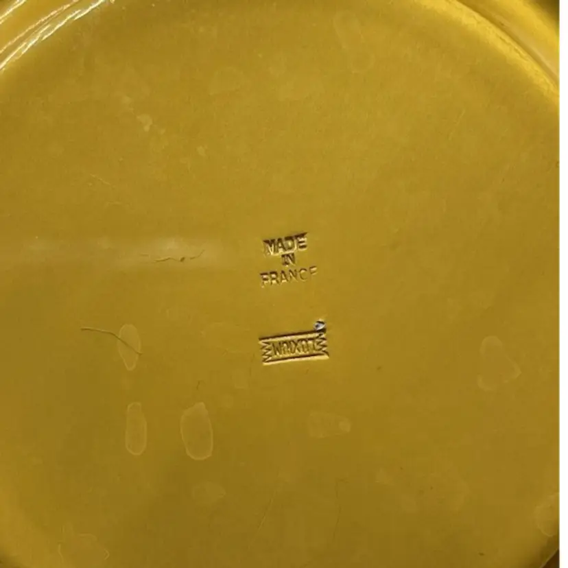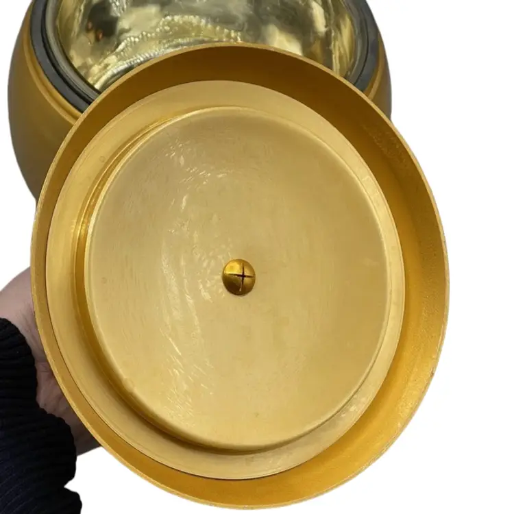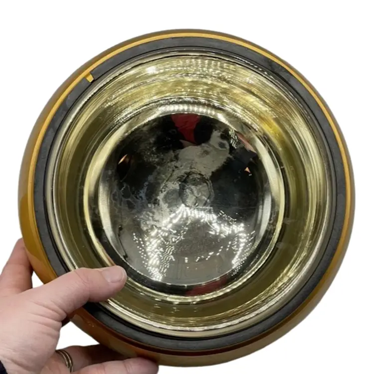 This piece does show its age in some minor dents around the edge of the lid as well as scratches and scuffs on the finish. The rubber seal and the cork base are present but the seal does become loose when the glass insert is removed. The glass insert has no chips or cracks but does show some patina on the Mercury finish.