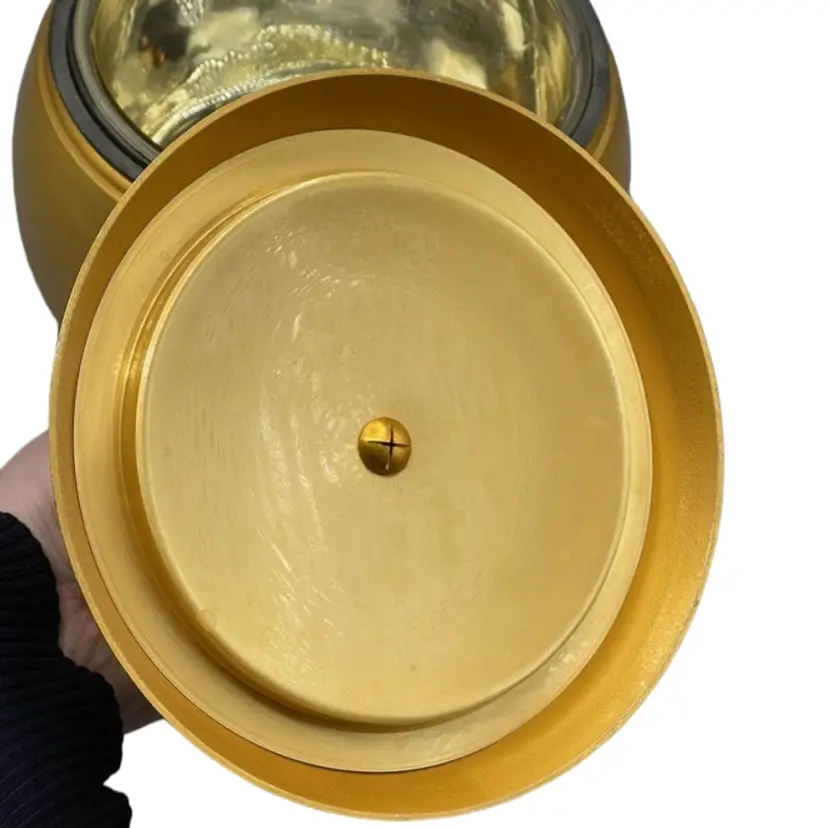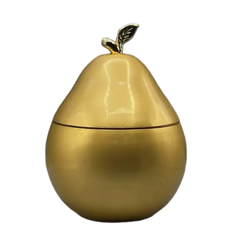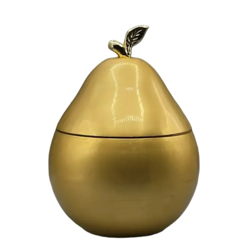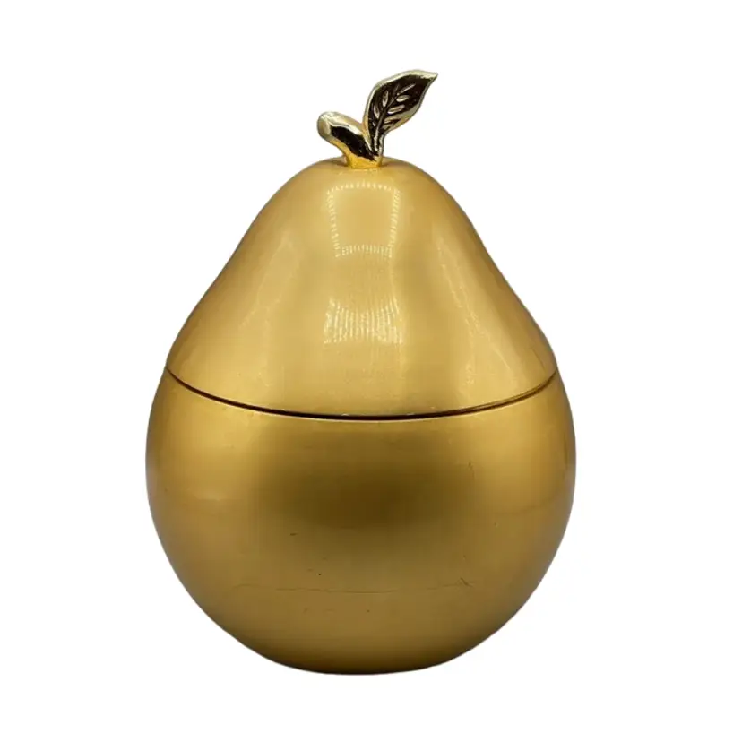 Luxium produced pear shaped ice buckets sold out of Asprey London during the mid century time period. Asprey has been selling luxury goods in England since 1781. Green and red were more common color ways for this particular ice bucket. This gold tone pear ice bucket is hard to find, especially with the intact mercury glass insulating insert.