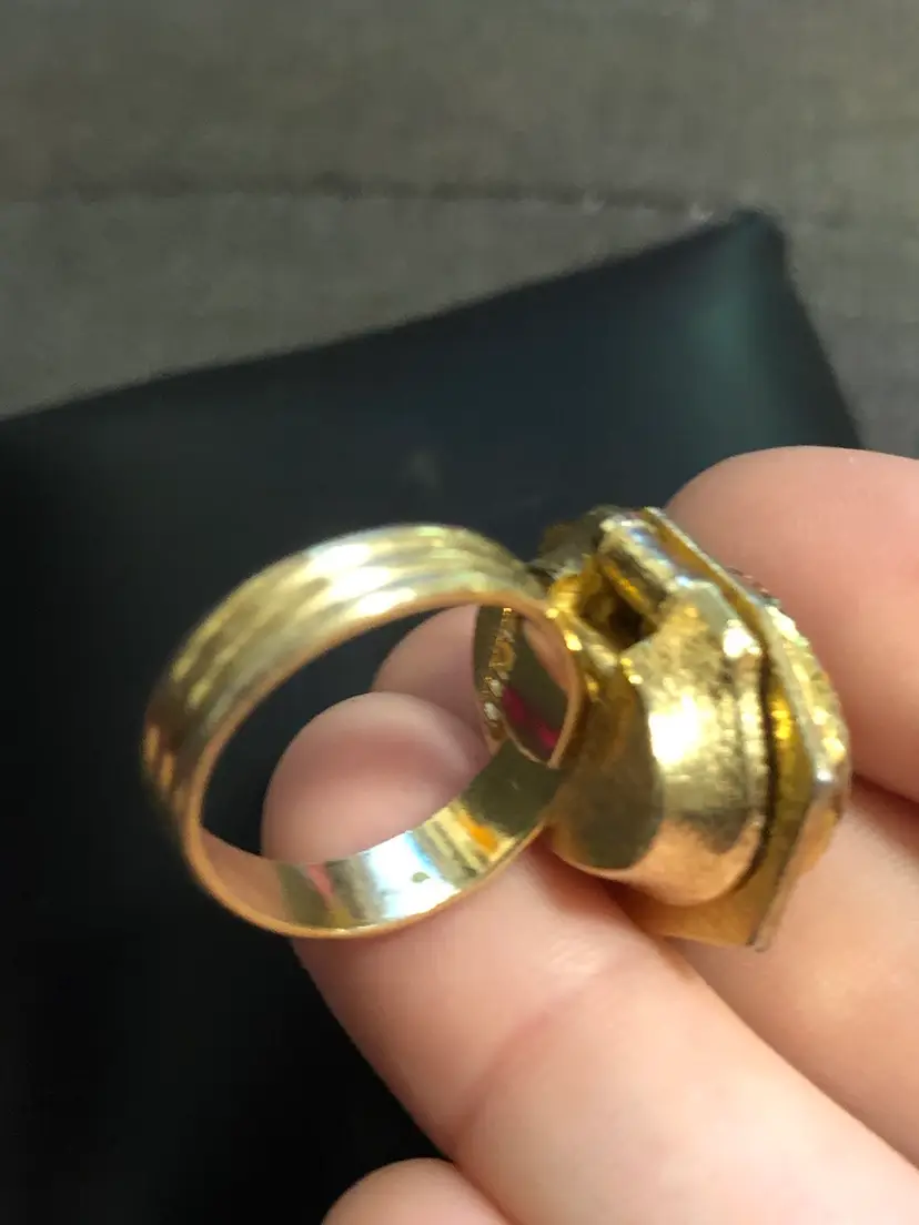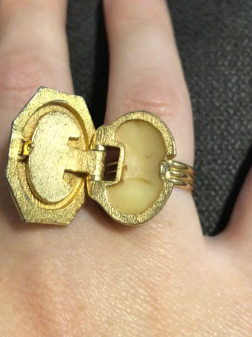 Chunky gold-tone ring Hard to find piece circa 1970 Some of the gold-tone is worn Signed on the back Adjustable in size Really pretty piece of jewelry Opens and closes well Still has some remnants of the solid perfume inside but not much smell