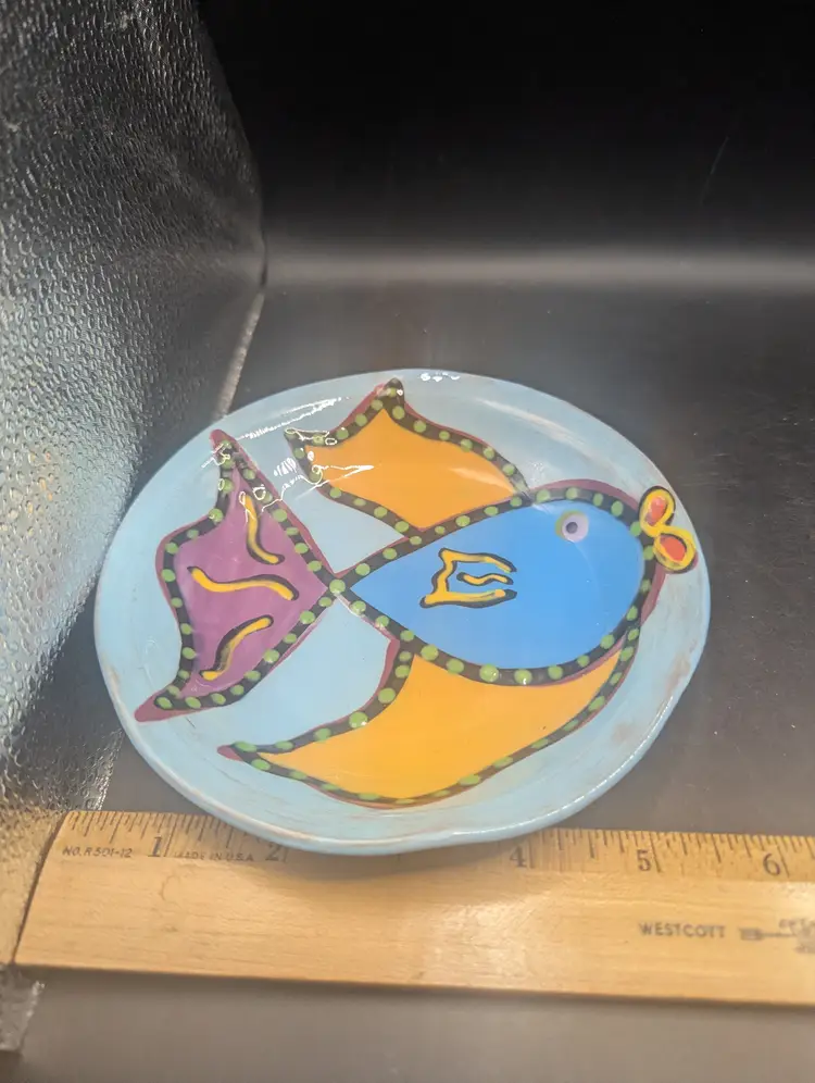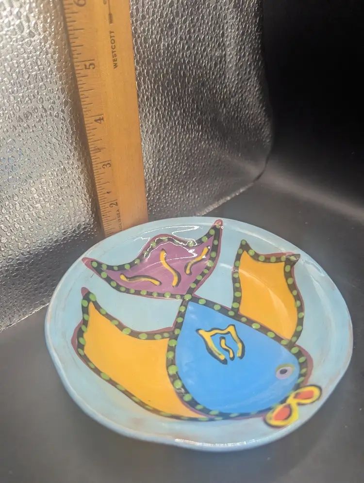 This is a lovely Vintage Lynda Feman Studio Art Pottery Bowl Or Trinket Dish made in New Mexico. It has a vibrant multicolor fish design. No chips or cracks. Please see all pictures for condition and measurements.