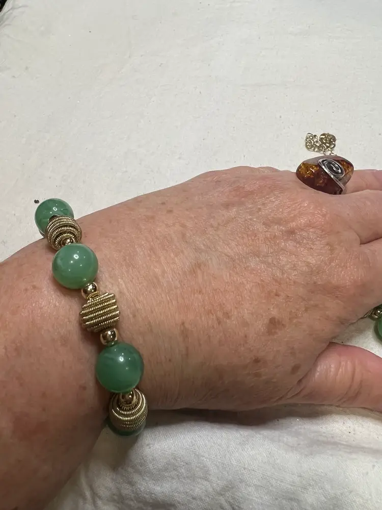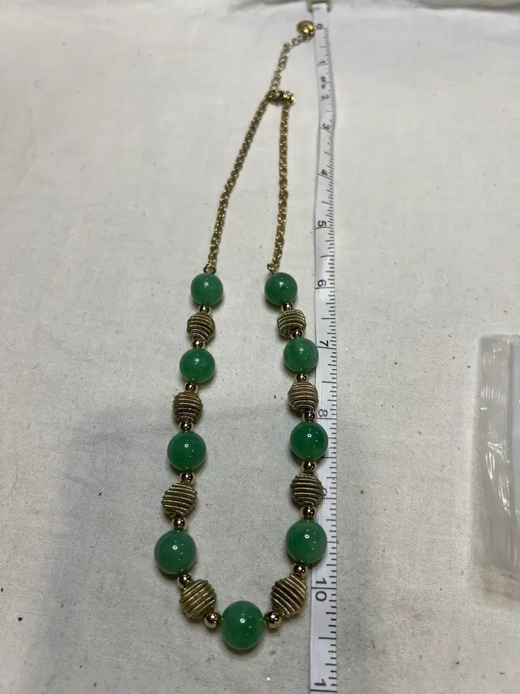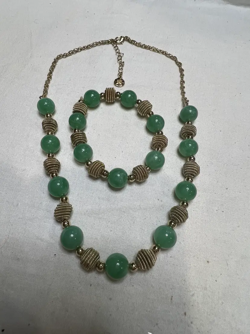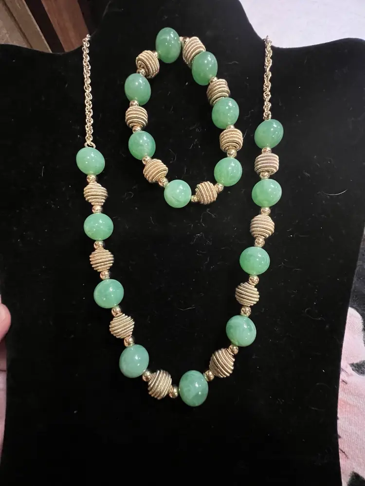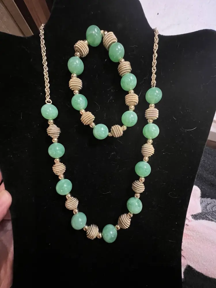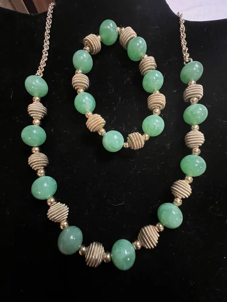 This vintage jewelry set from I Michelson & Sons is a stunning addition to any collection. The necklace and bracelet feature beautiful jadeite green acrylic beads and gold beads that are sure to catch the eye. The necklace is signed by the renowned jeweler and are in excellent condition. The set includes a necklace and bracelet, and is perfect for any occasion.
