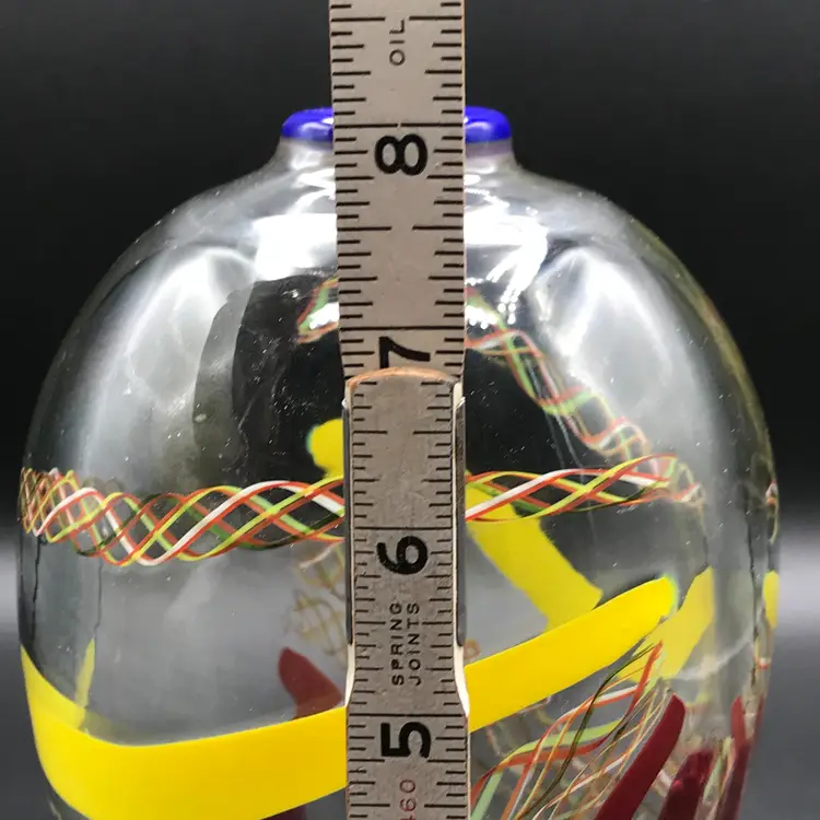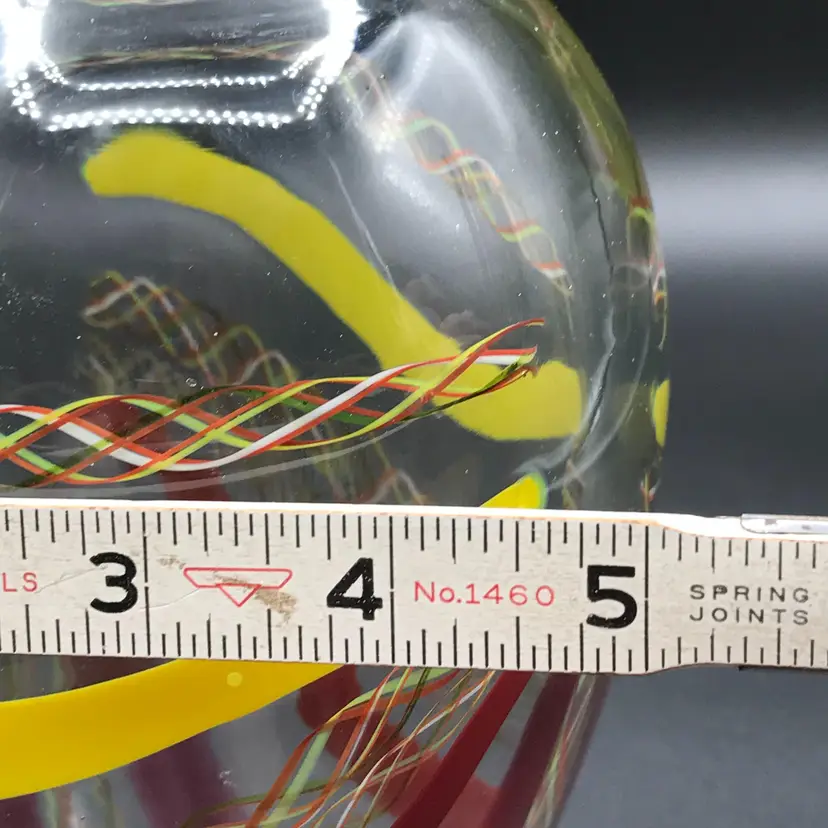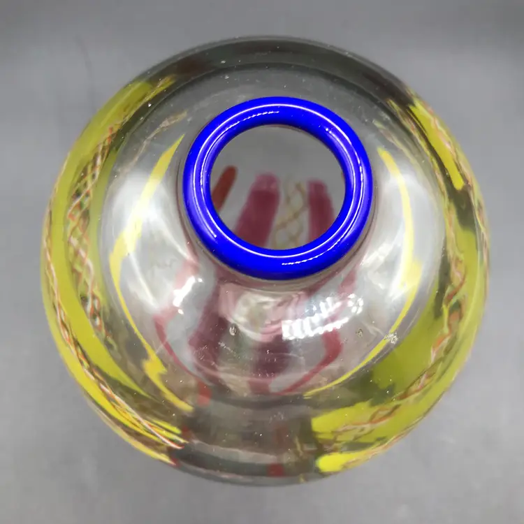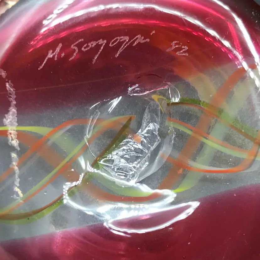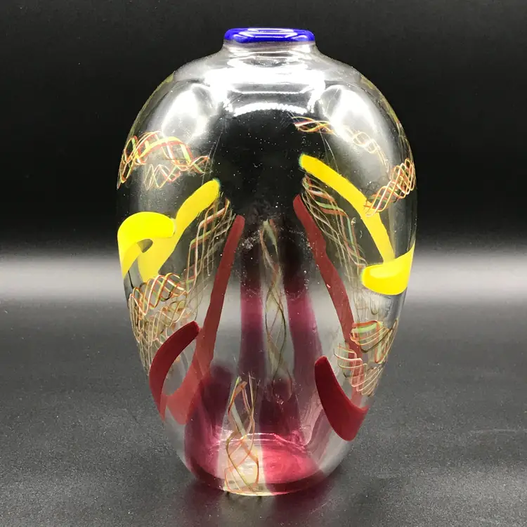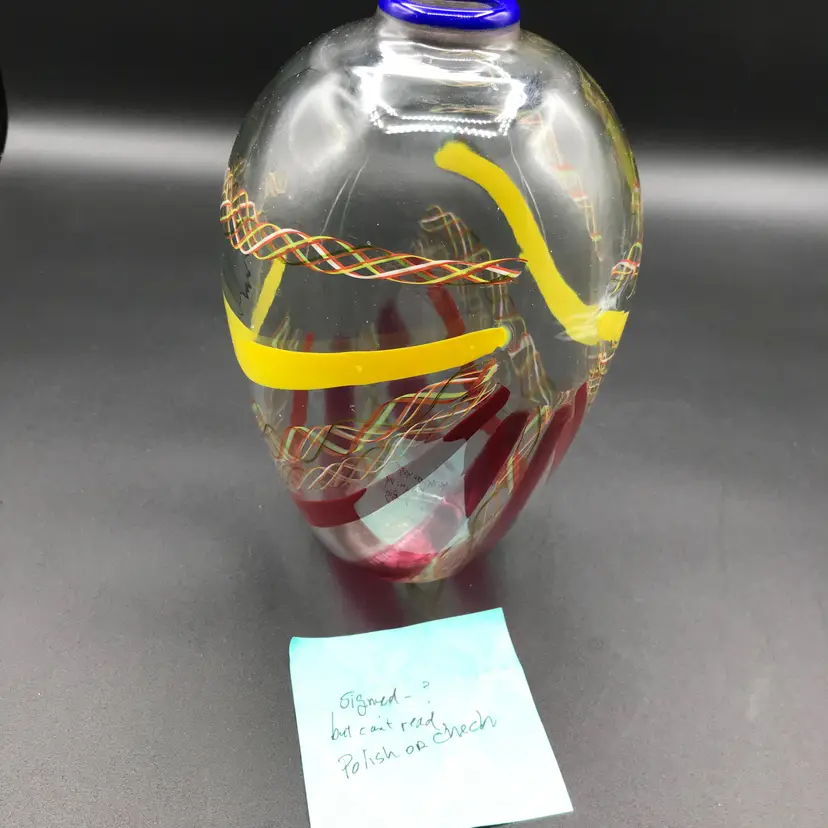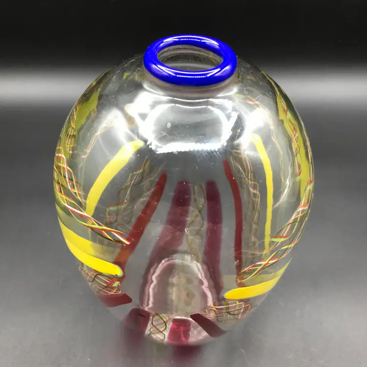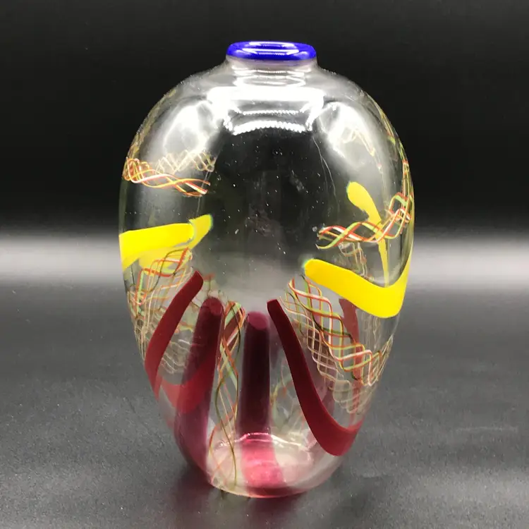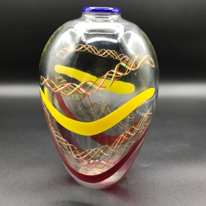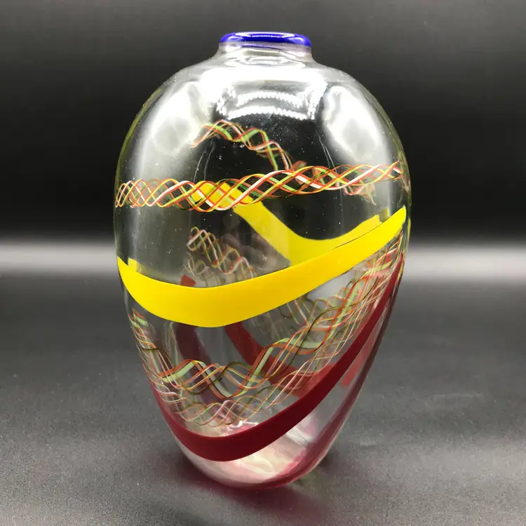 This is a Vintage M. Sorzogni Hand Blown Czech Art Glass MultiColor Interweave Vase, signed and dated 1982, is a stunning piece of art glass that showcases exquisite craftsmanship and design. This vase features a vibrant and intricate multicolor interweave pattern, creating a visually dynamic and captivating appearance. Hand blown by the skilled artist M. Sorzogni, the vase embodies the beauty and elegance of Czech glass artistry. Its unique design and signed provenance make it a rare and collectible piece.