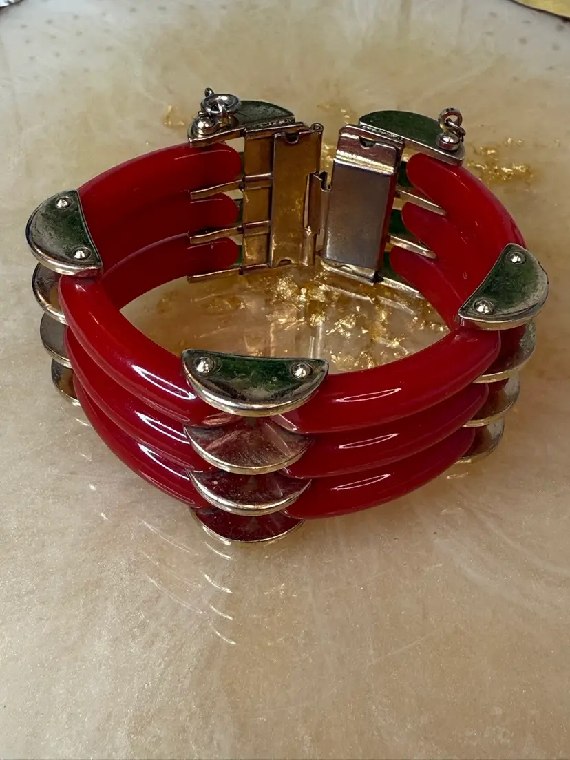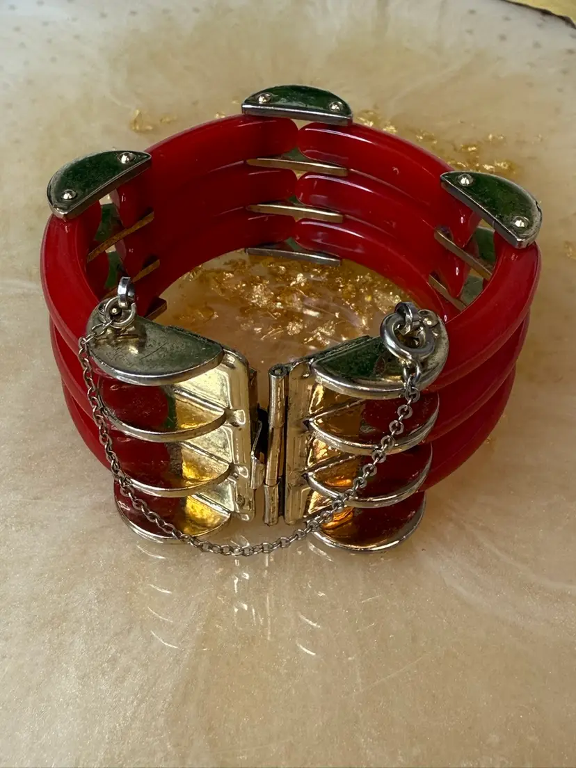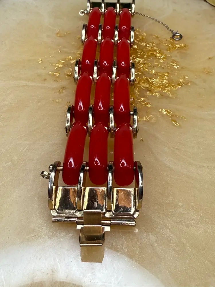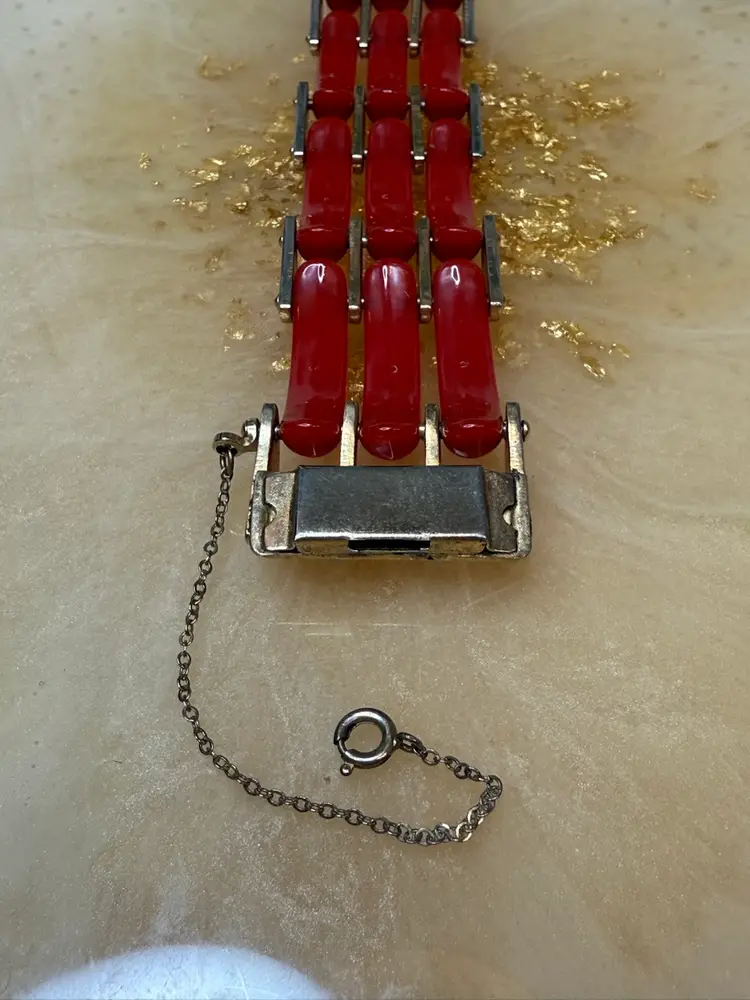 This vintage bracelet is a stunning piece of Art Deco jewelry. The gold tone metal and red colors create a striking contrast against each other. The bracelet is designed with a box closure and a safety chain for added protection.